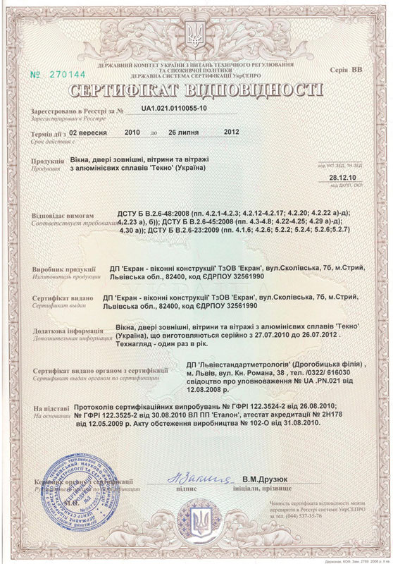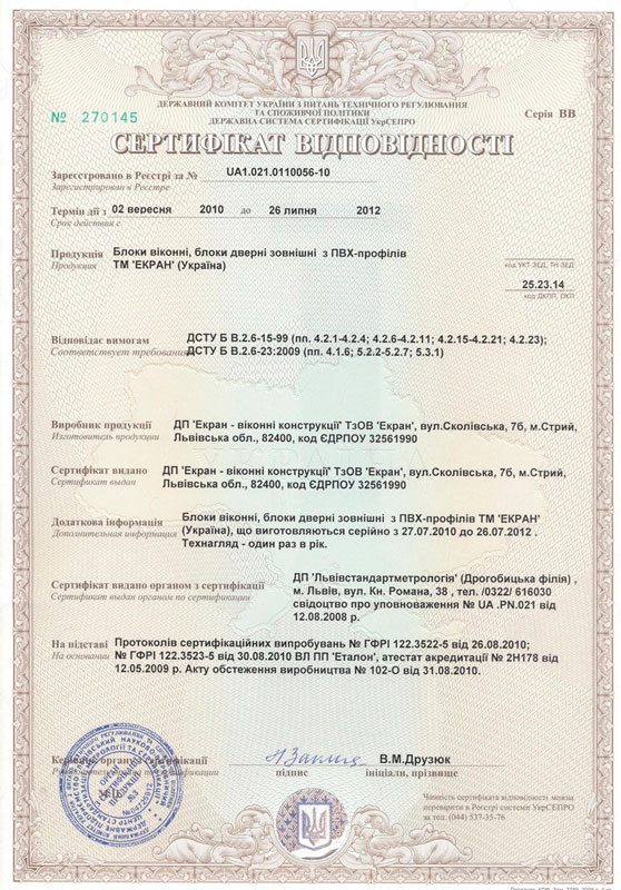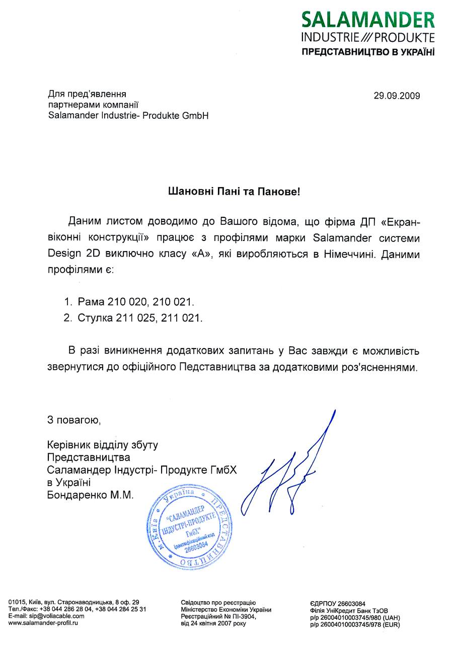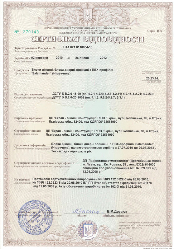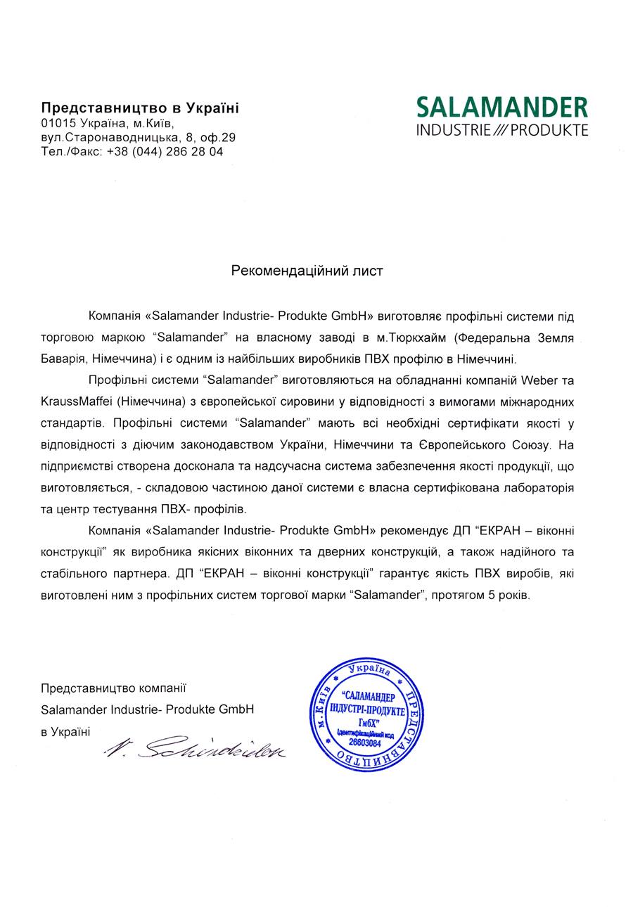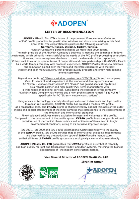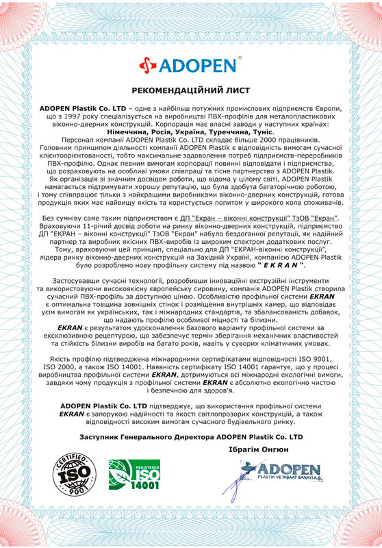 Вікна, двері зовнішні, вітрини та вітражі з алюмінієвих сплавівВікна та двері з профілю EKRANВікна та двері з ПВХ-профілю Salamander (Німеччина)Фурнітура для вікон та дверейФурнітура для вікон та дверейФурнітура для вікон та дверей (пластикові елементи)Вікна та двері бапконні дерев'янні із клеєними склопакетамиРекомендаційний лист фірми Adopen Plastic Co. – виробника профілю EKRAN (English)Рекомендаційний лист фірми Adopen Plastic Co. – виробника профілю EKRANРекомендаційний лист фірми SalamanderРекомендаційний лист фірми Salamander