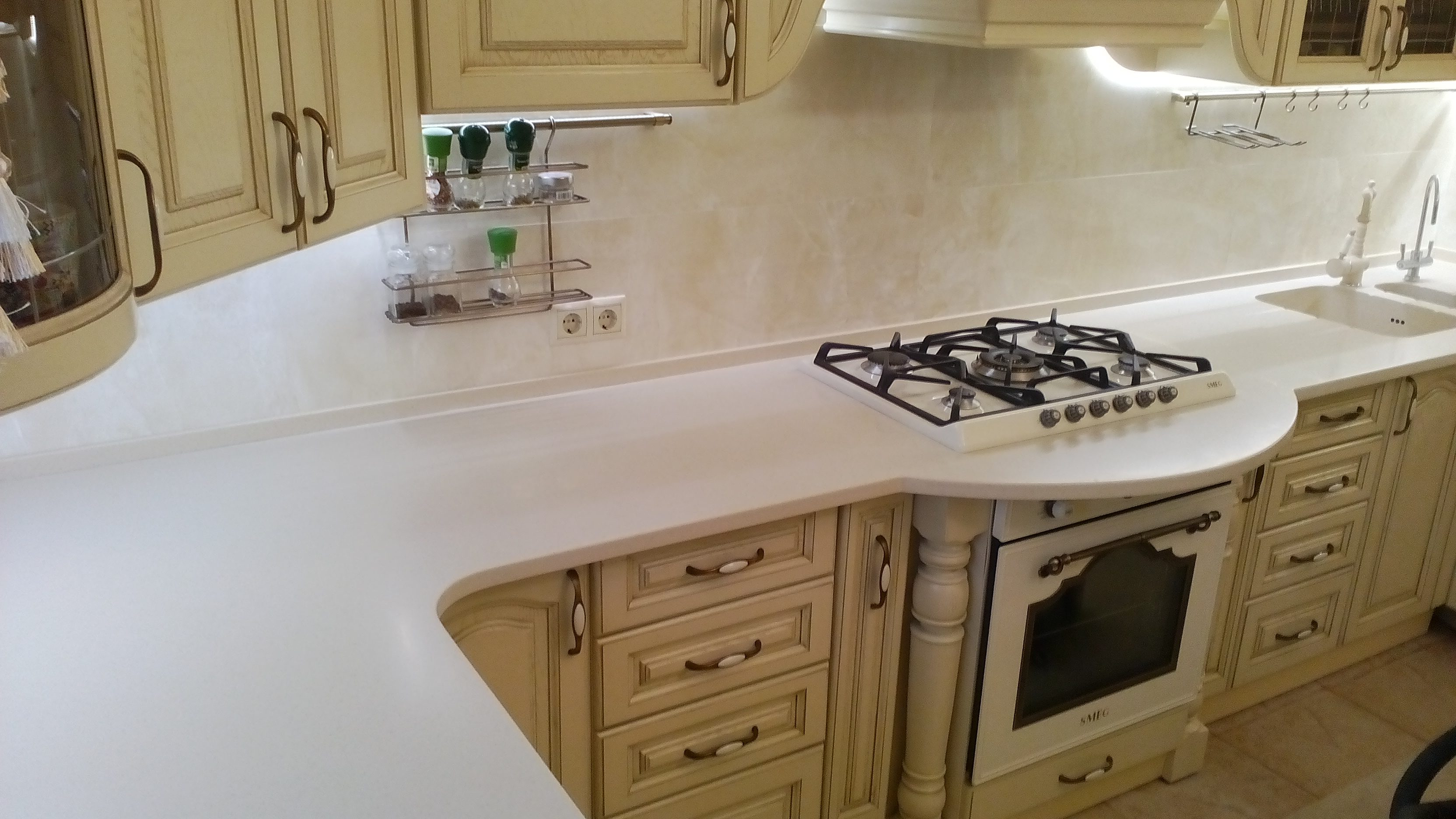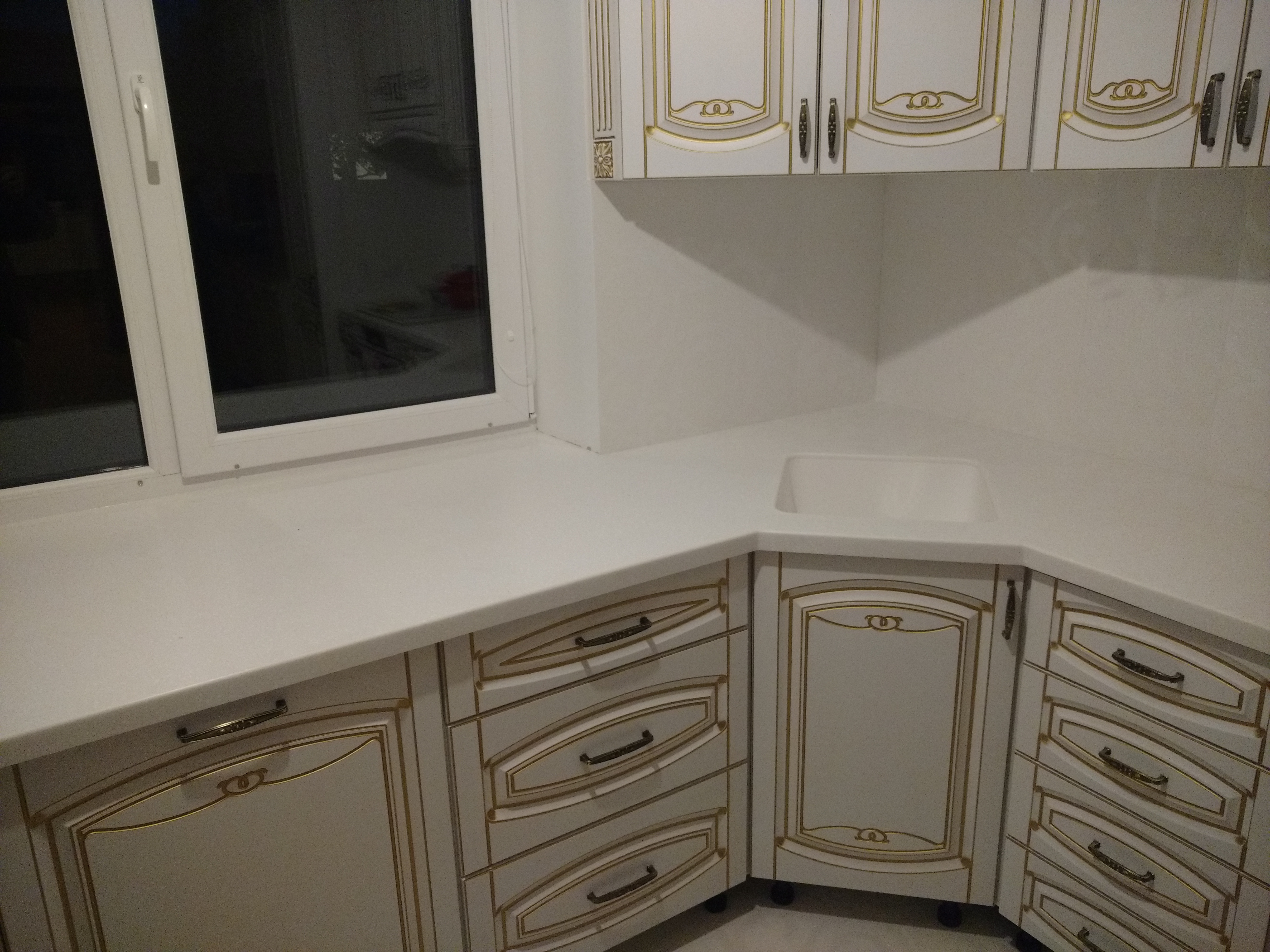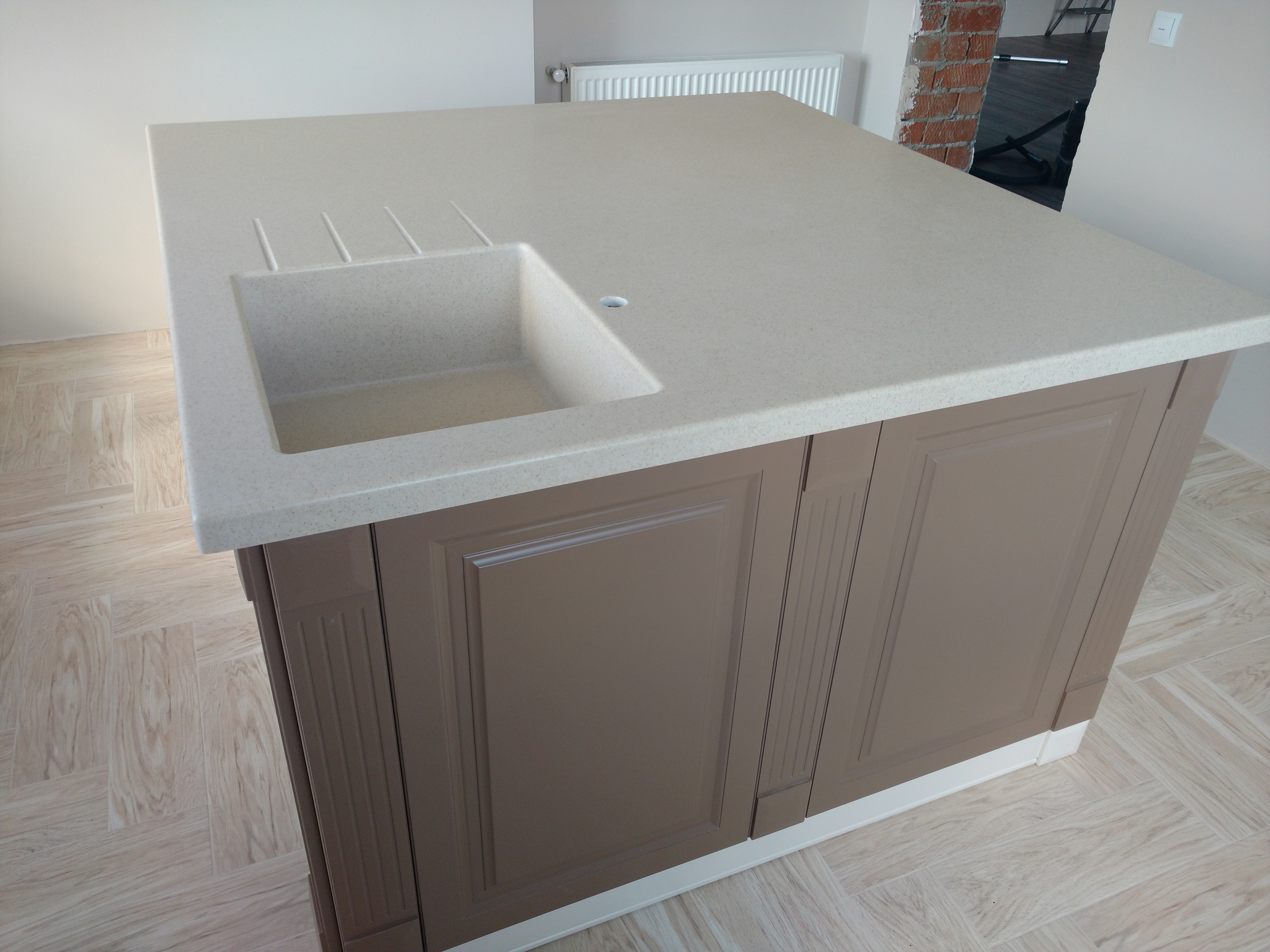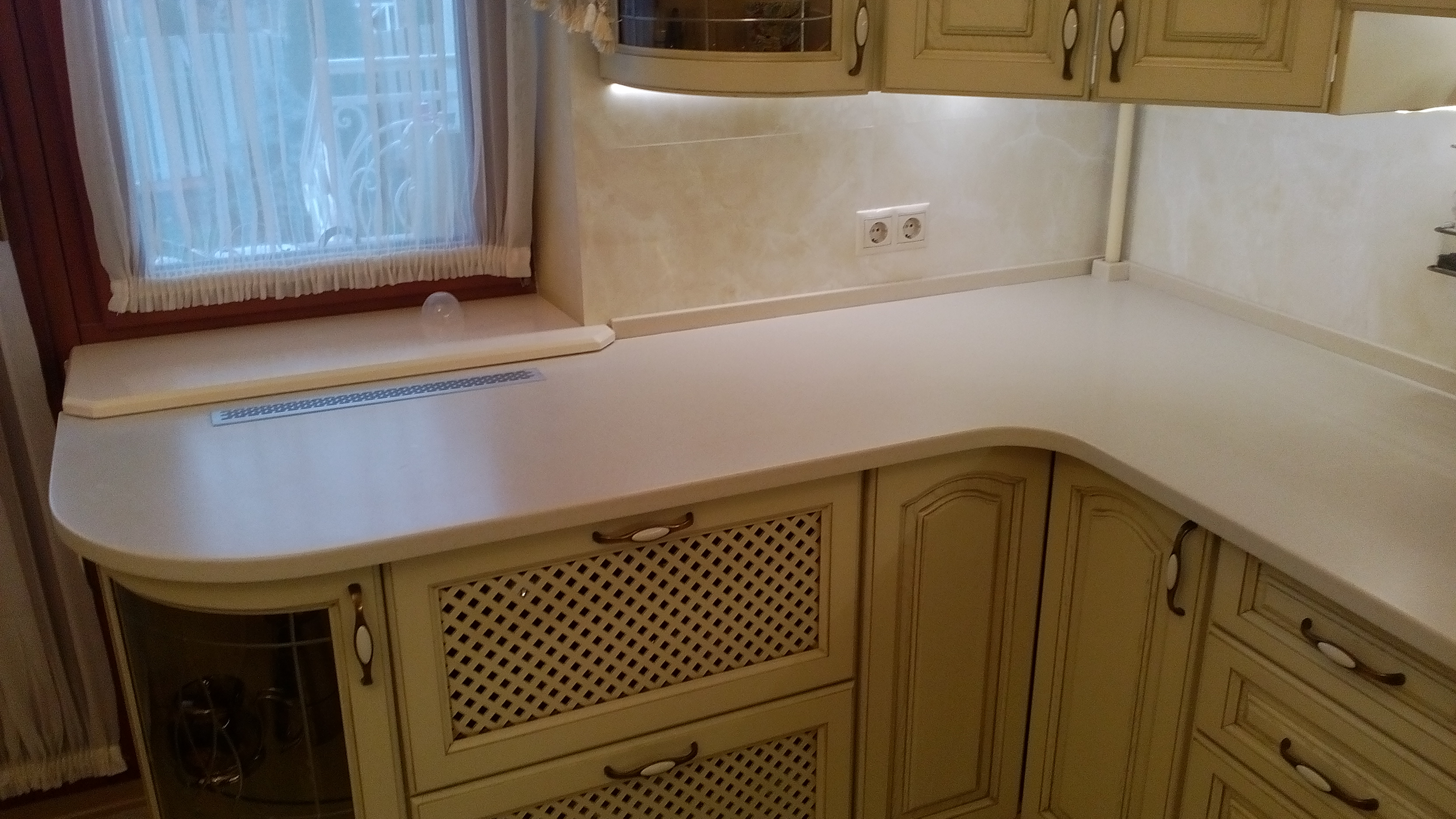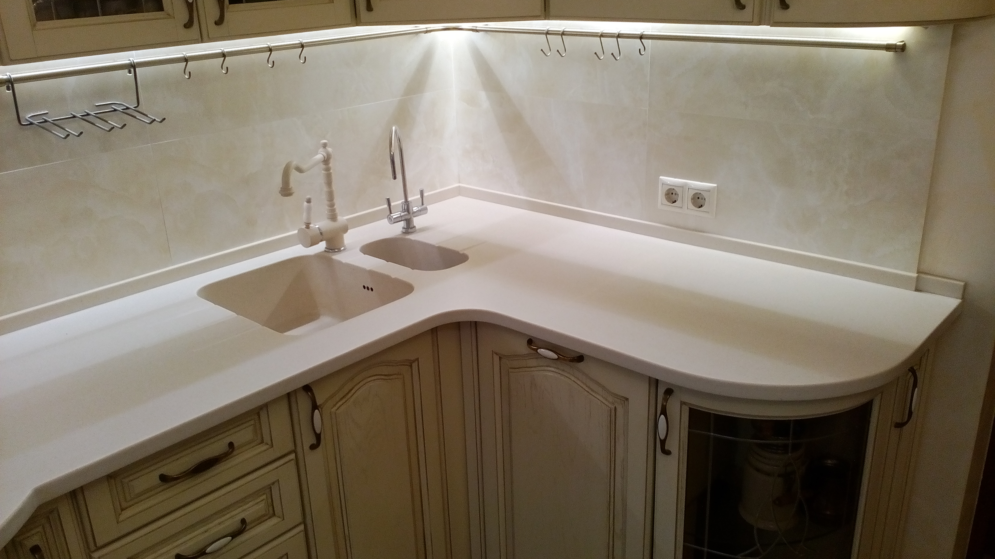 Приклад на фото. Розмір стільниці зі штучного каменю: 1800x2500 мм. Глибина обох сторін: 600 мм. У вартість стільниці входить: внутрішній, зовнішній радіус і мийка. Ціна даної стільниці зі штучного каменю 1450$.