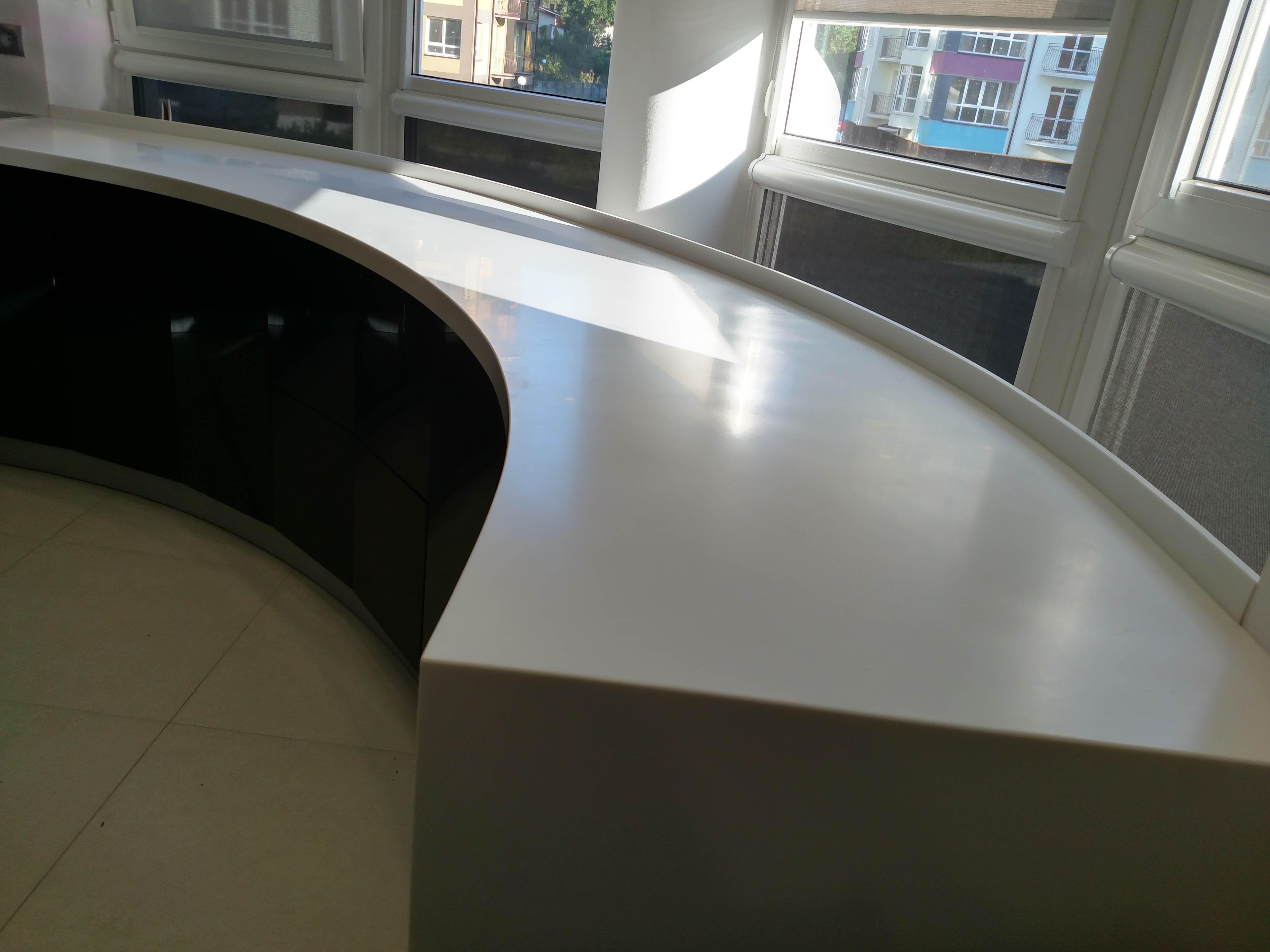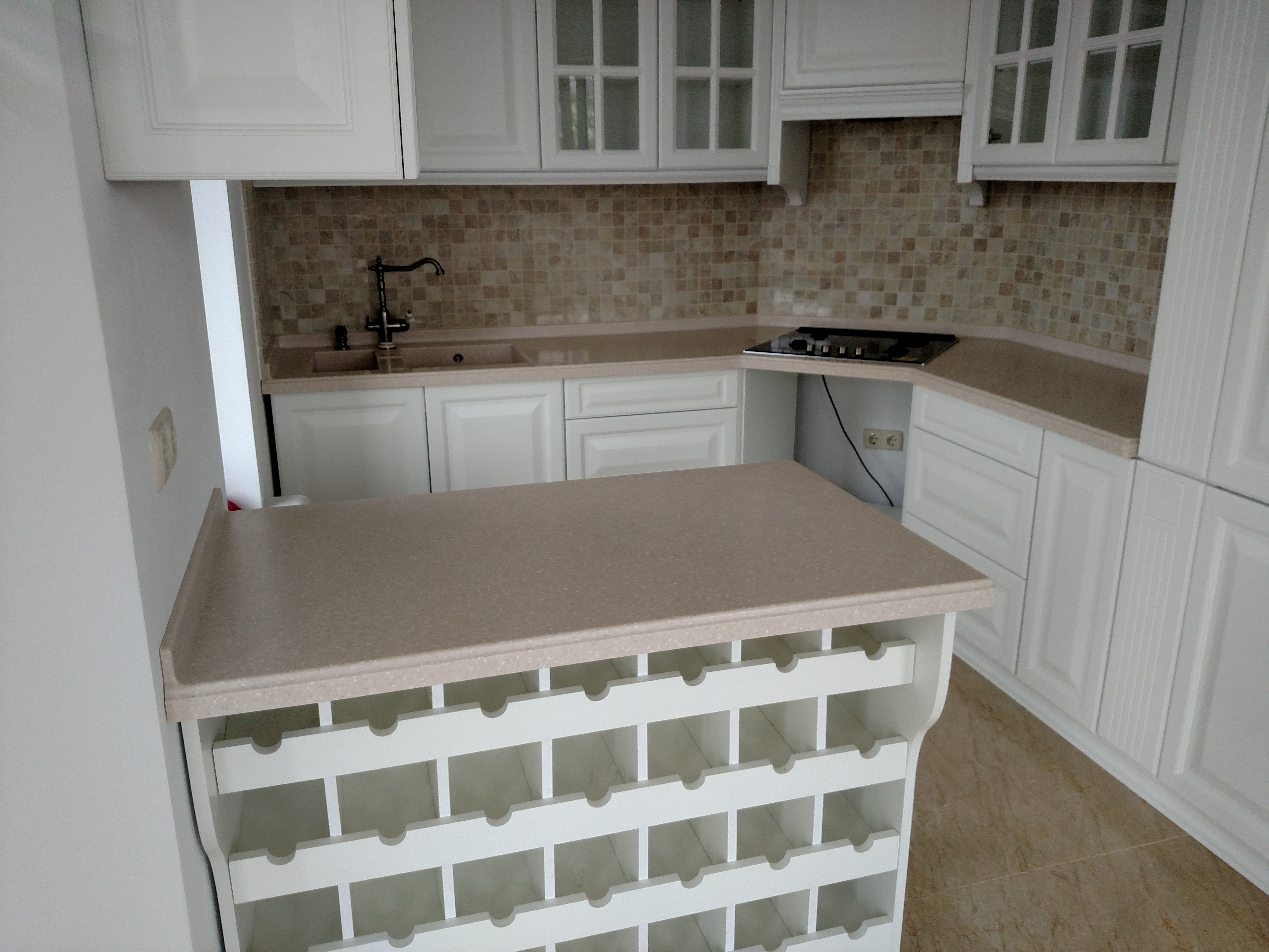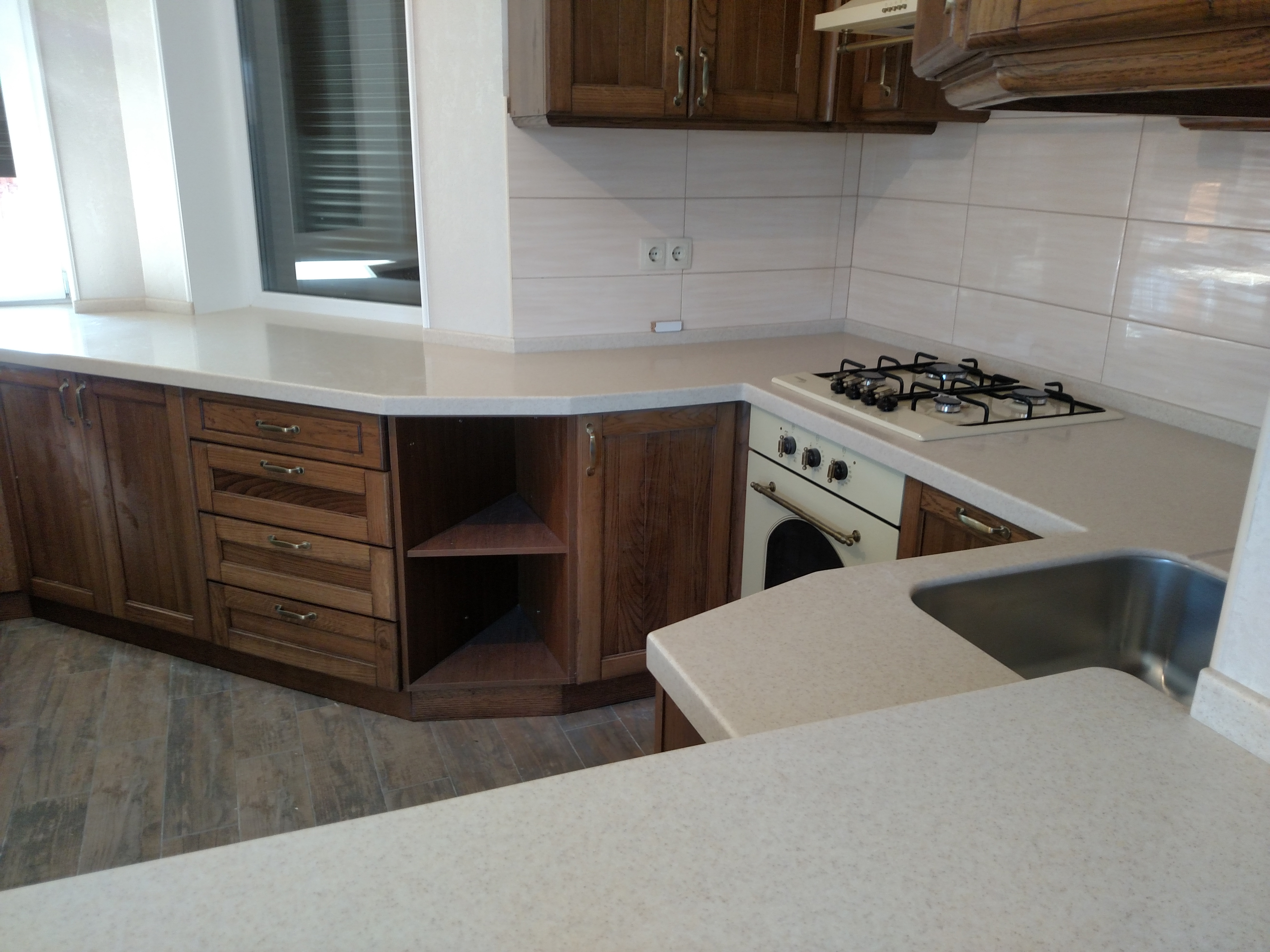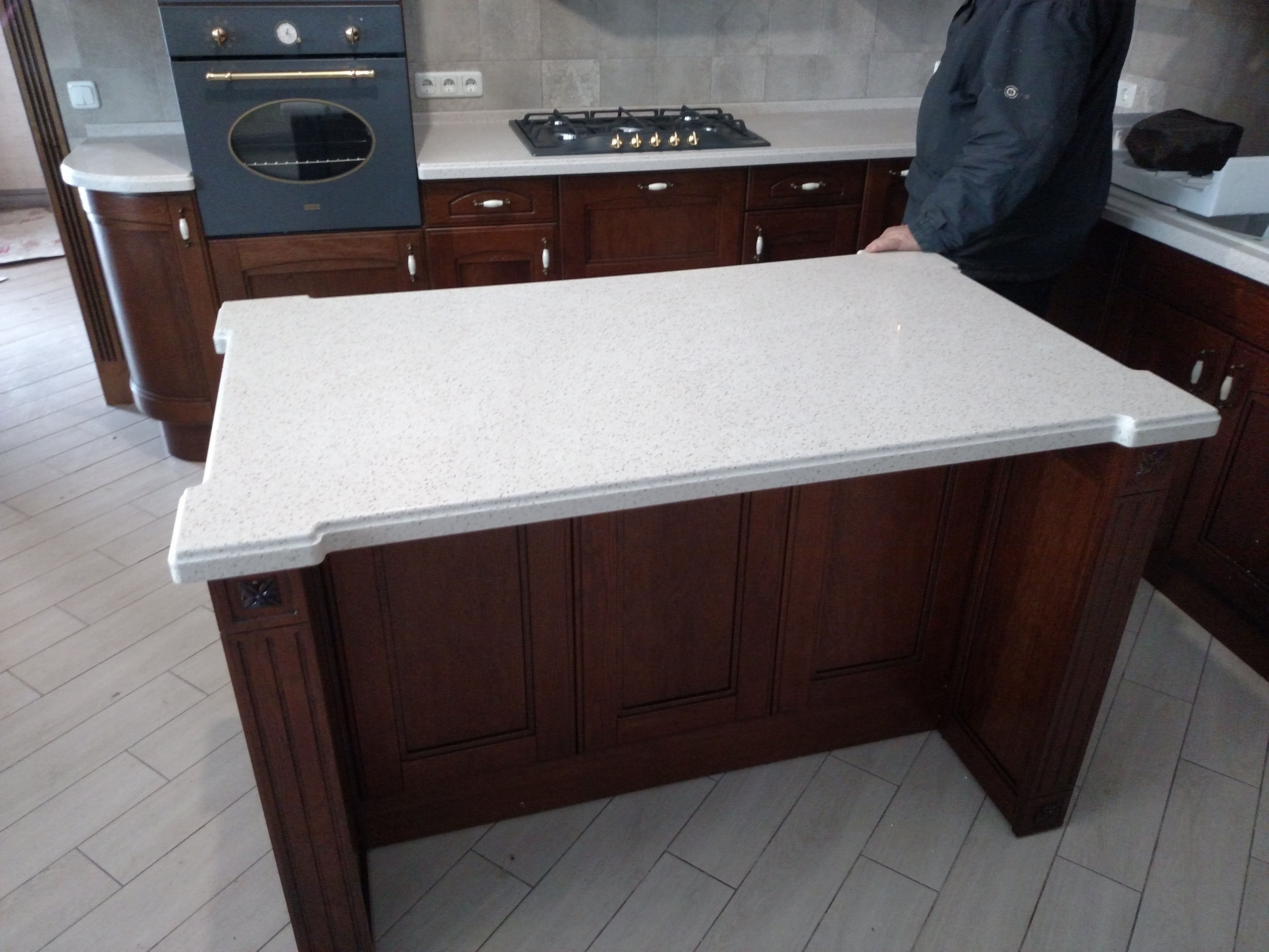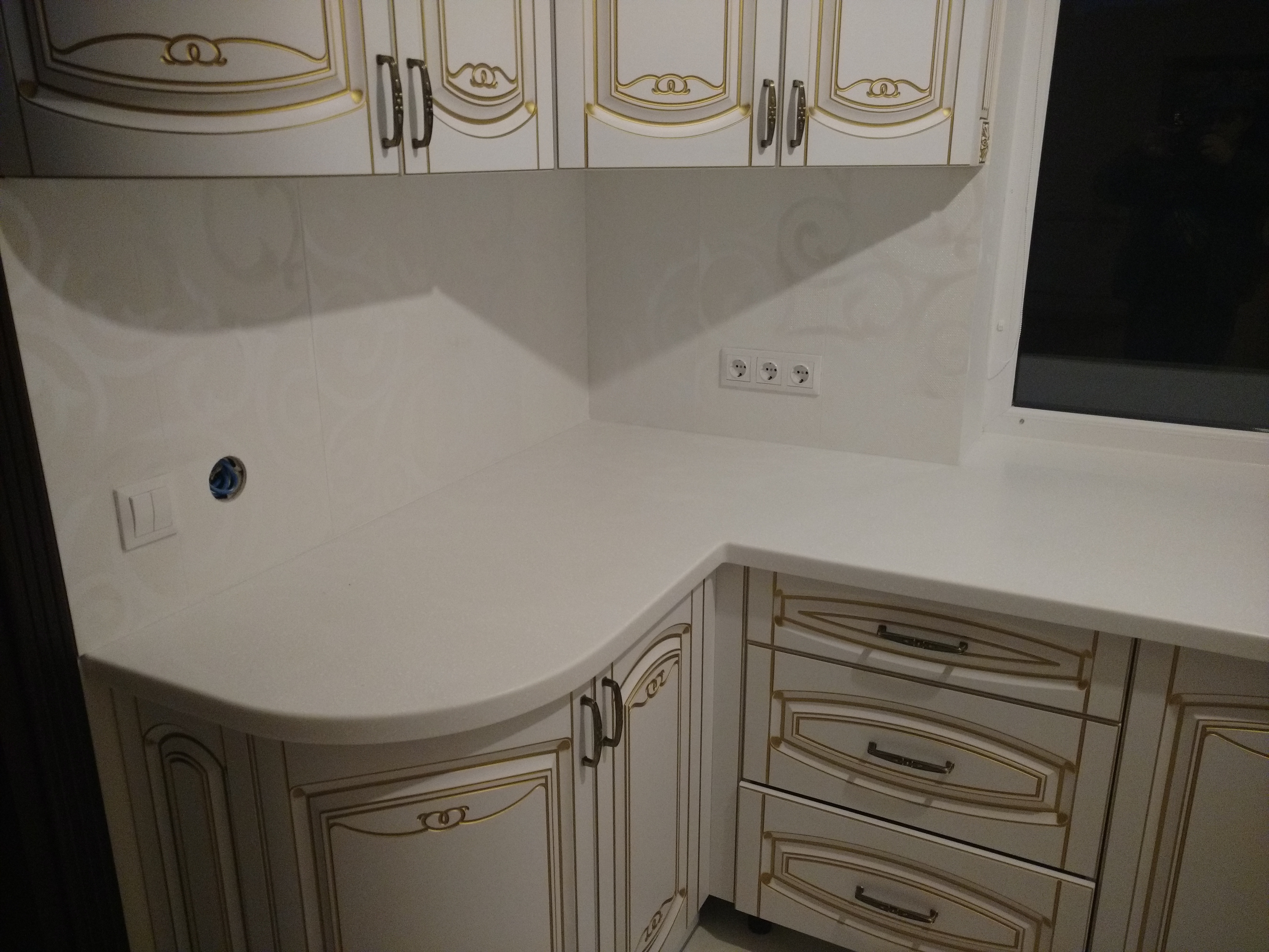 Приклад на фото. Розмір стільниці зі штучного каменю: 1800x2500 мм. Глибина обох сторін: 600 мм. У вартість стільниці входить: внутрішній, зовнішній радіус і мийка. Ціна даної стільниці зі штучного каменю 1450$.