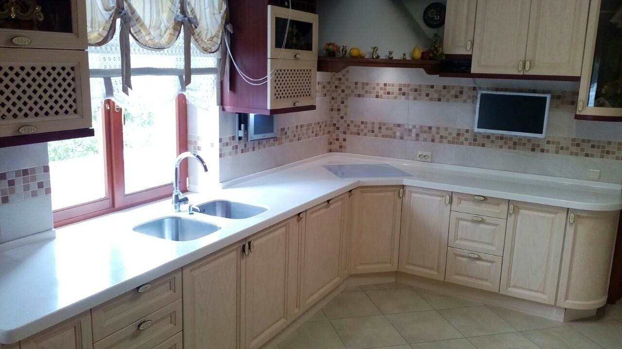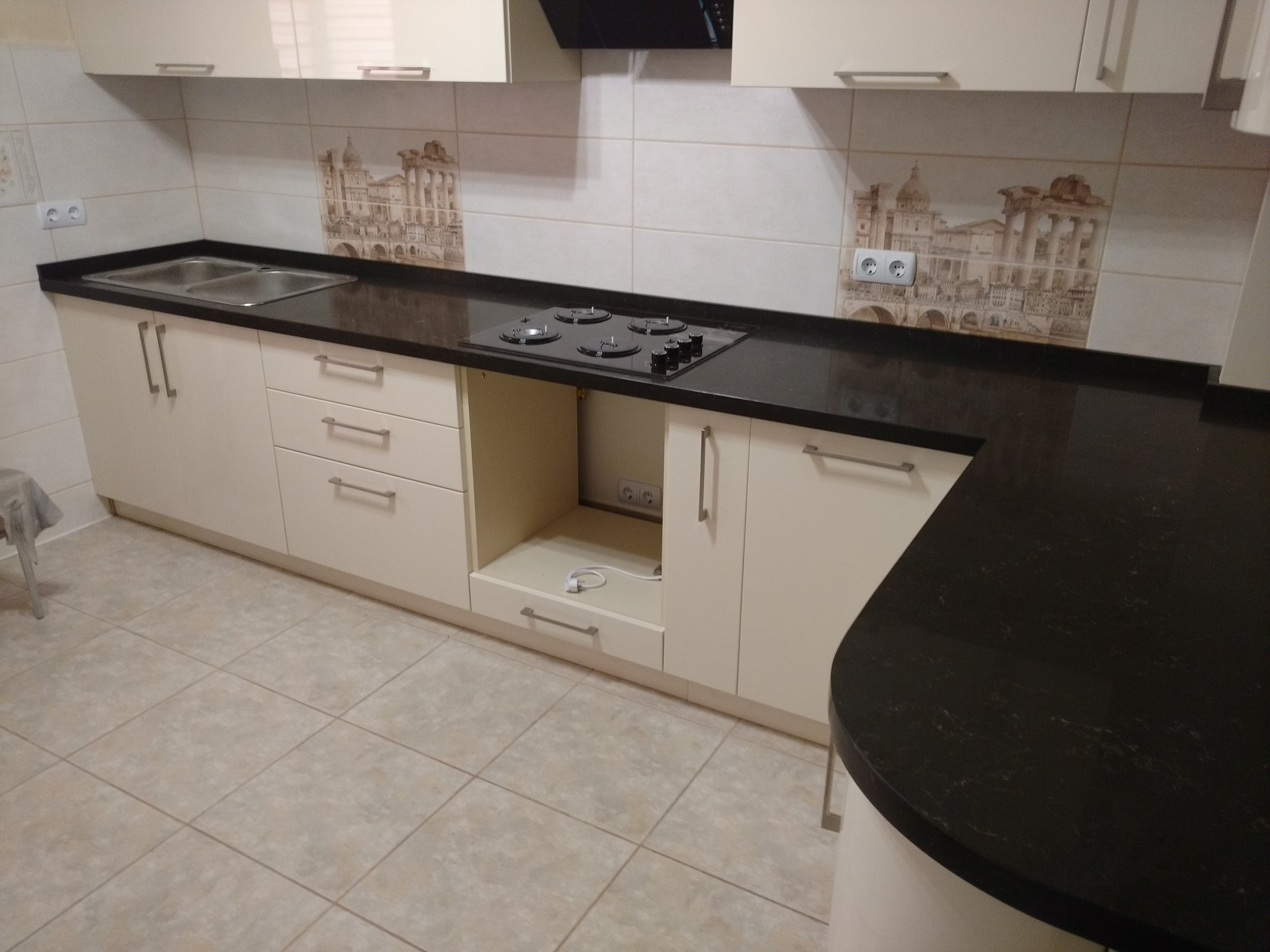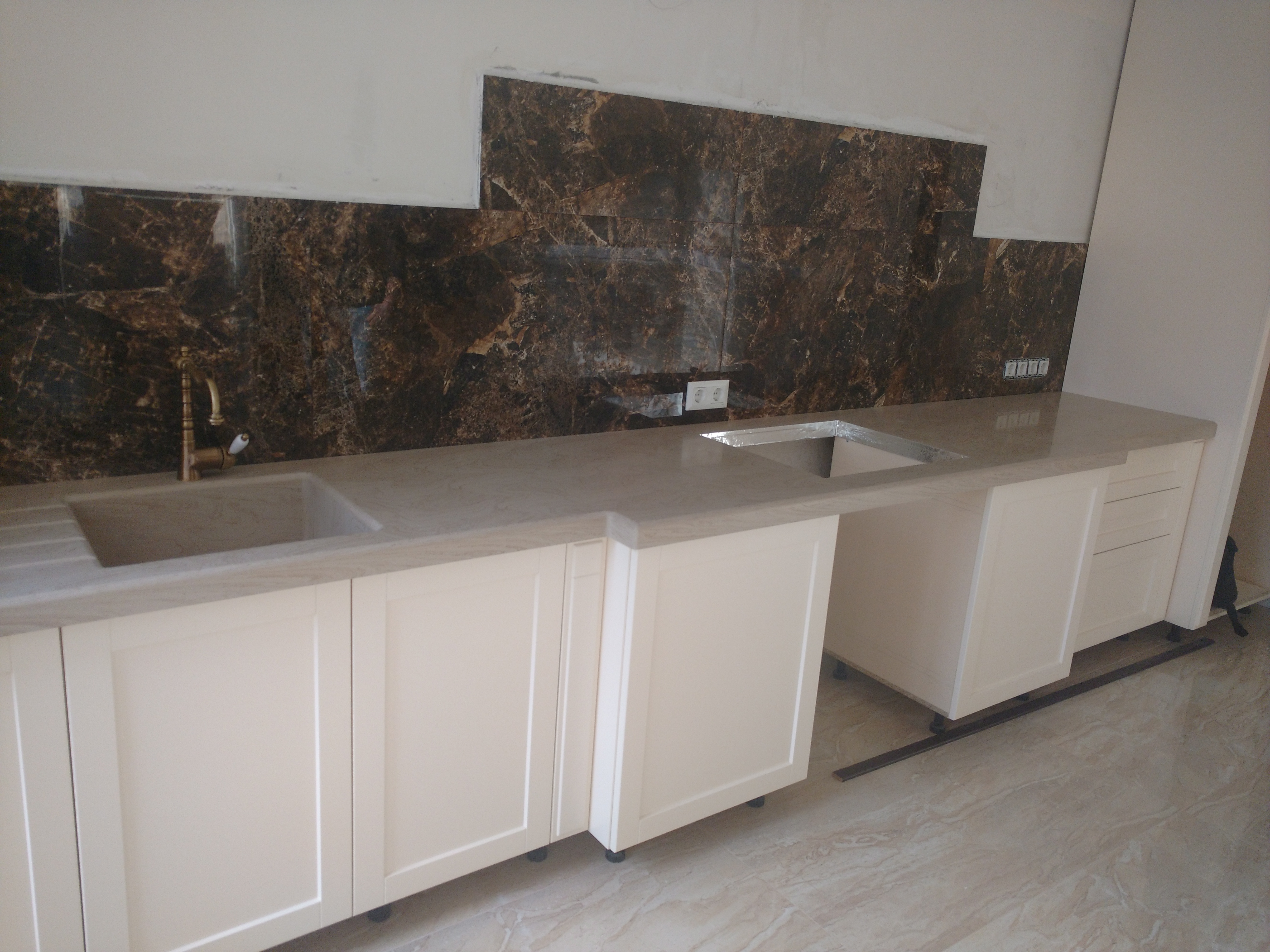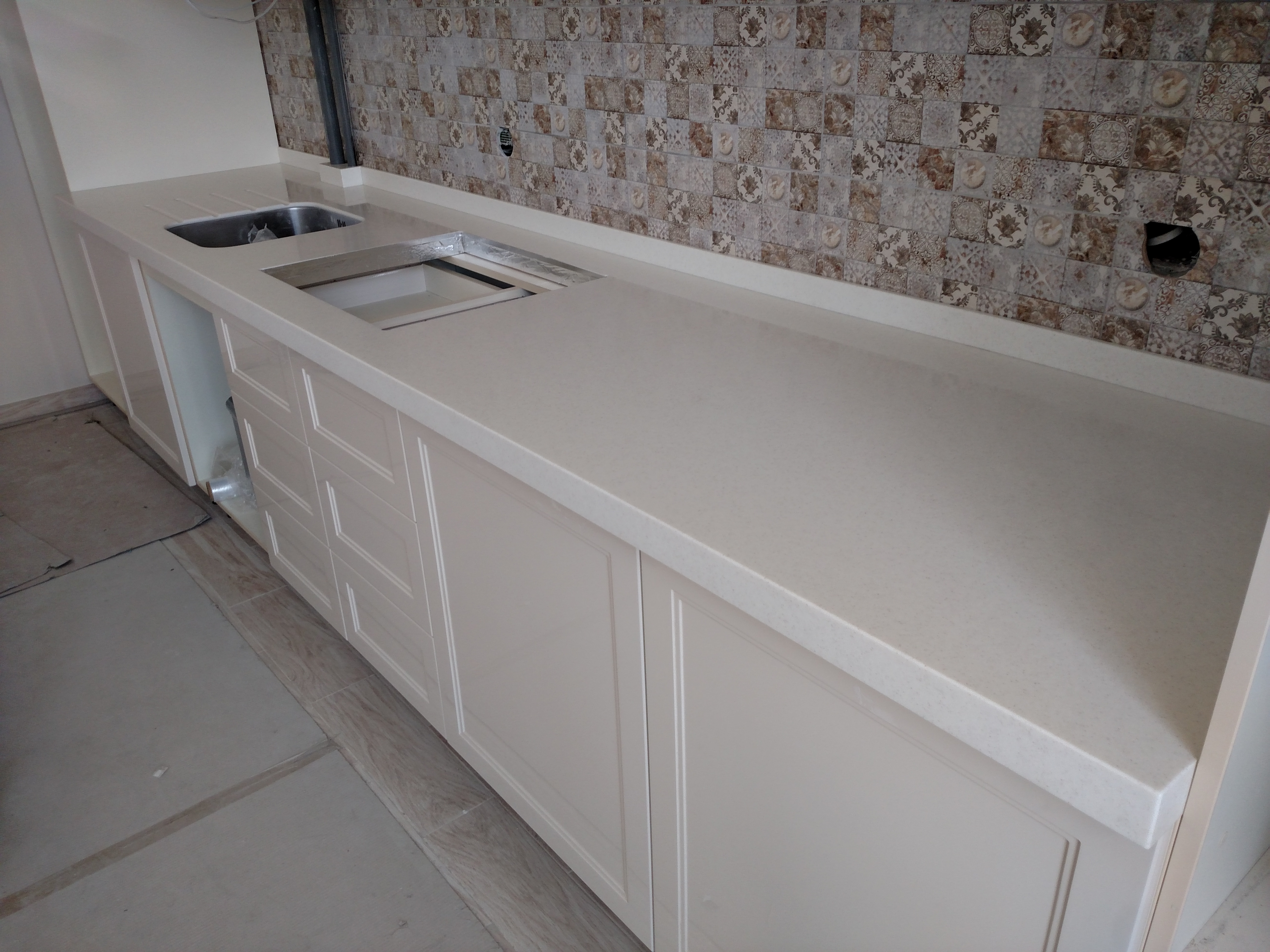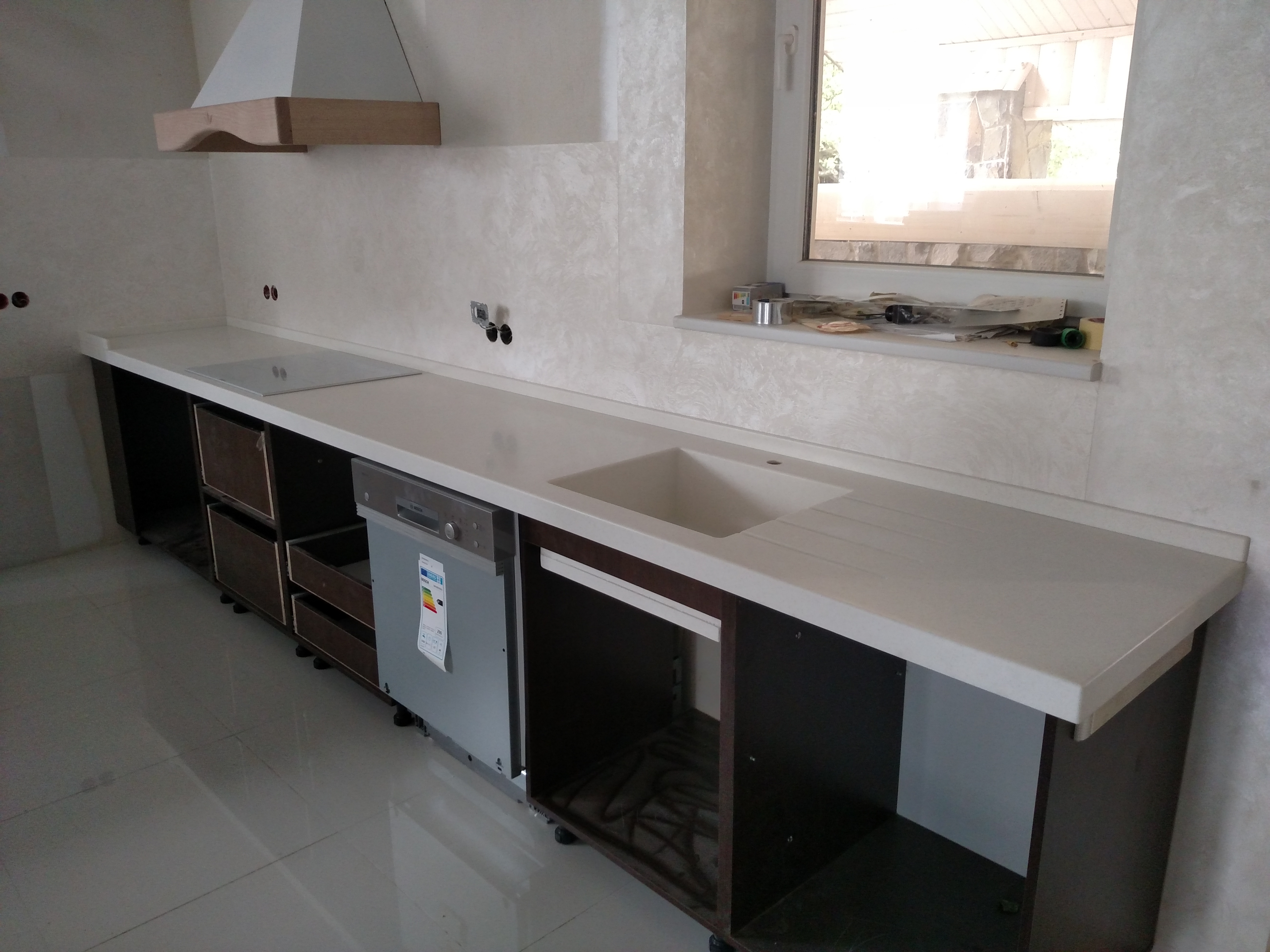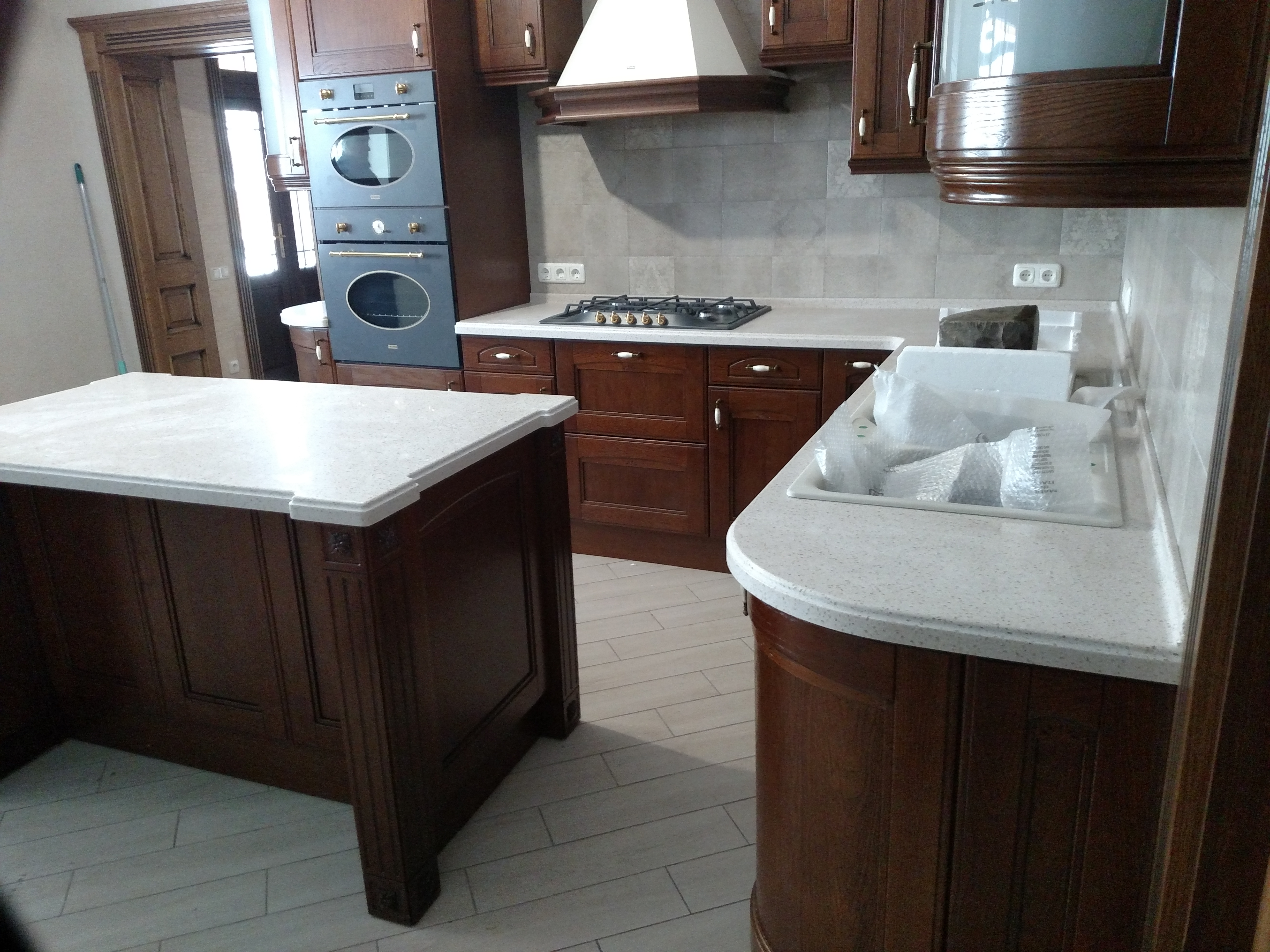 Приклад на фото. Розмір стільниці зі штучного каменю: 1800x2500 мм. Глибина обох сторін: 600 мм. У вартість стільниці входить: внутрішній, зовнішній радіус і мийка. Ціна даної стільниці зі штучного каменю 1450$.