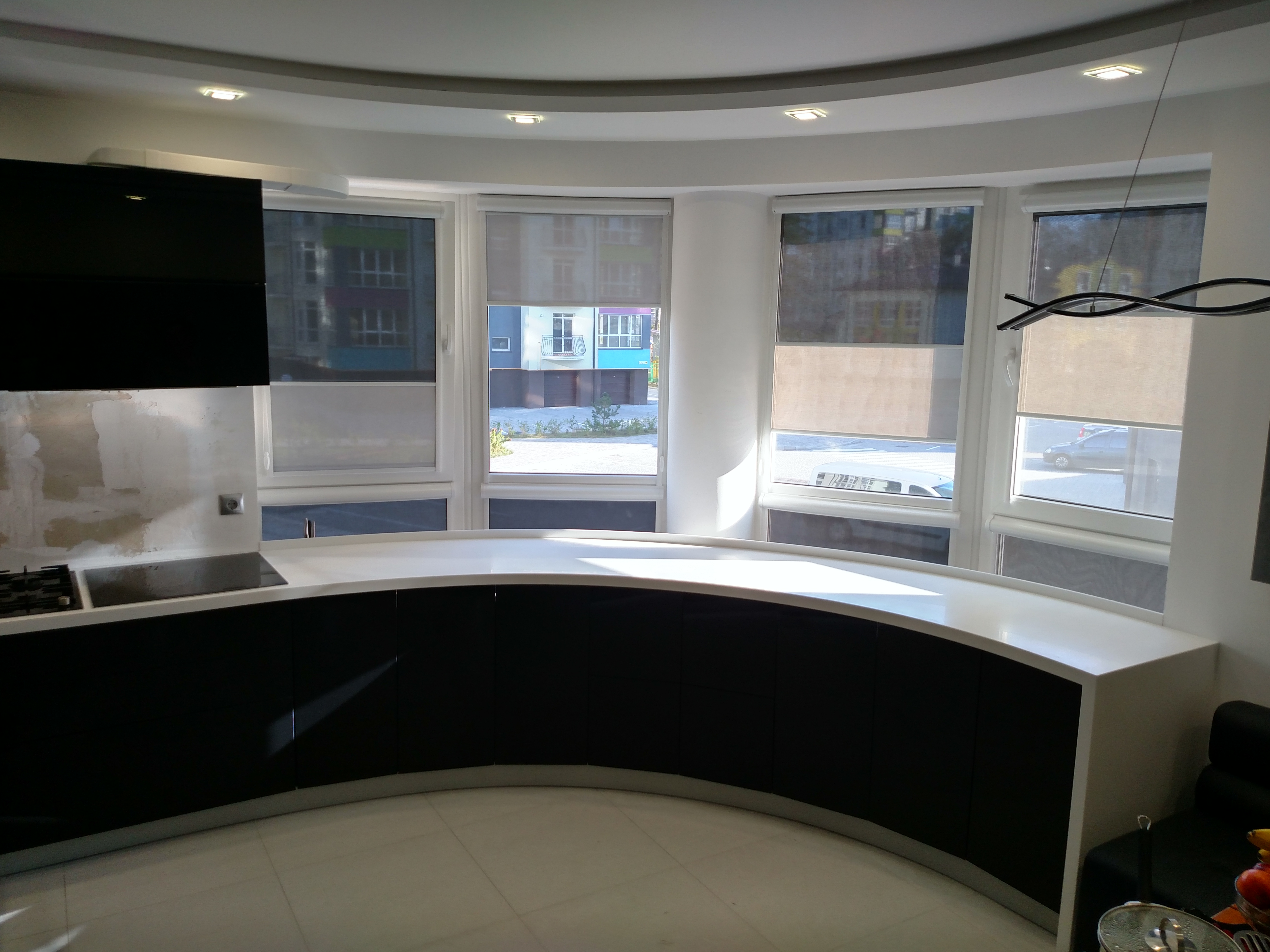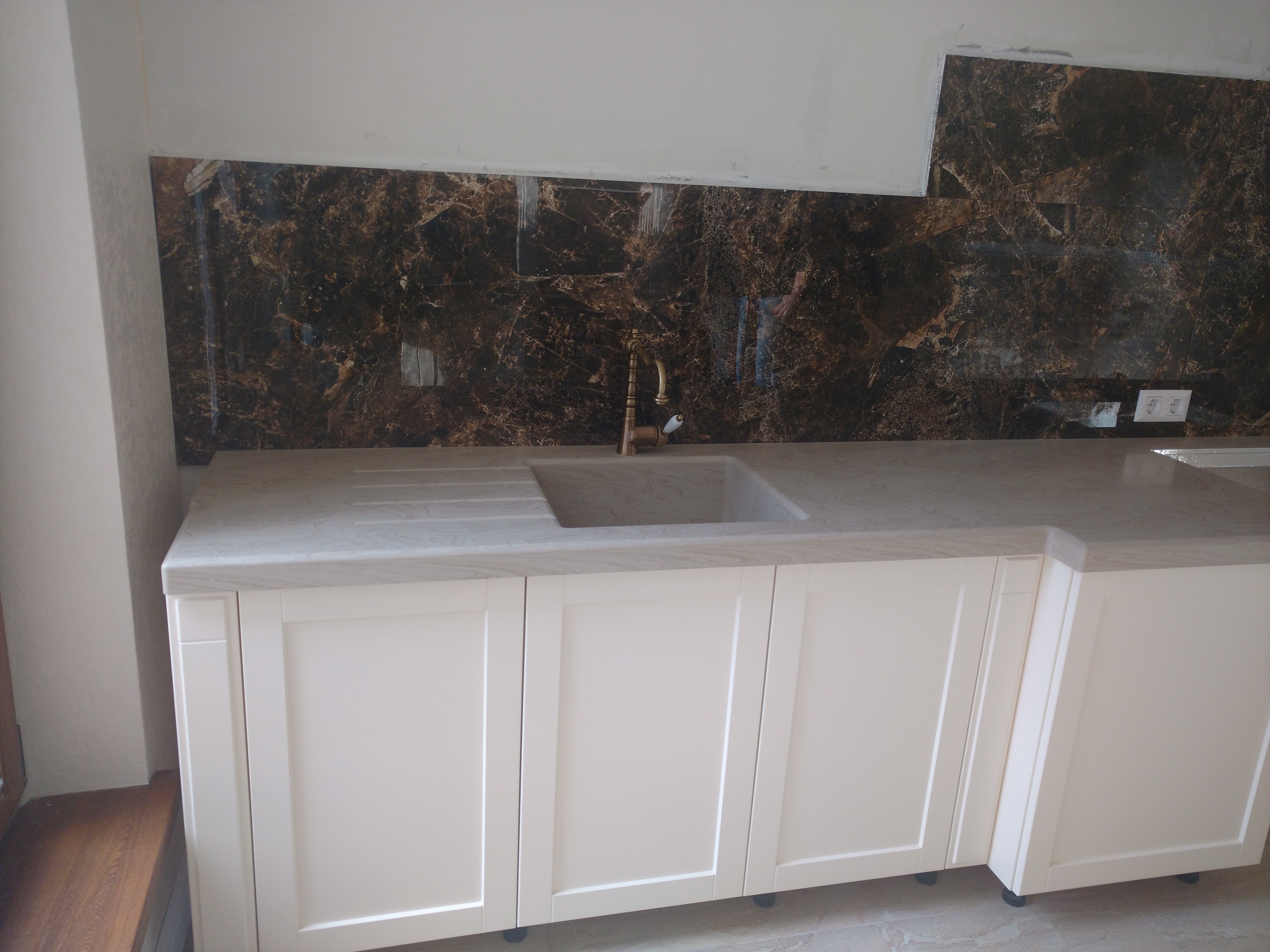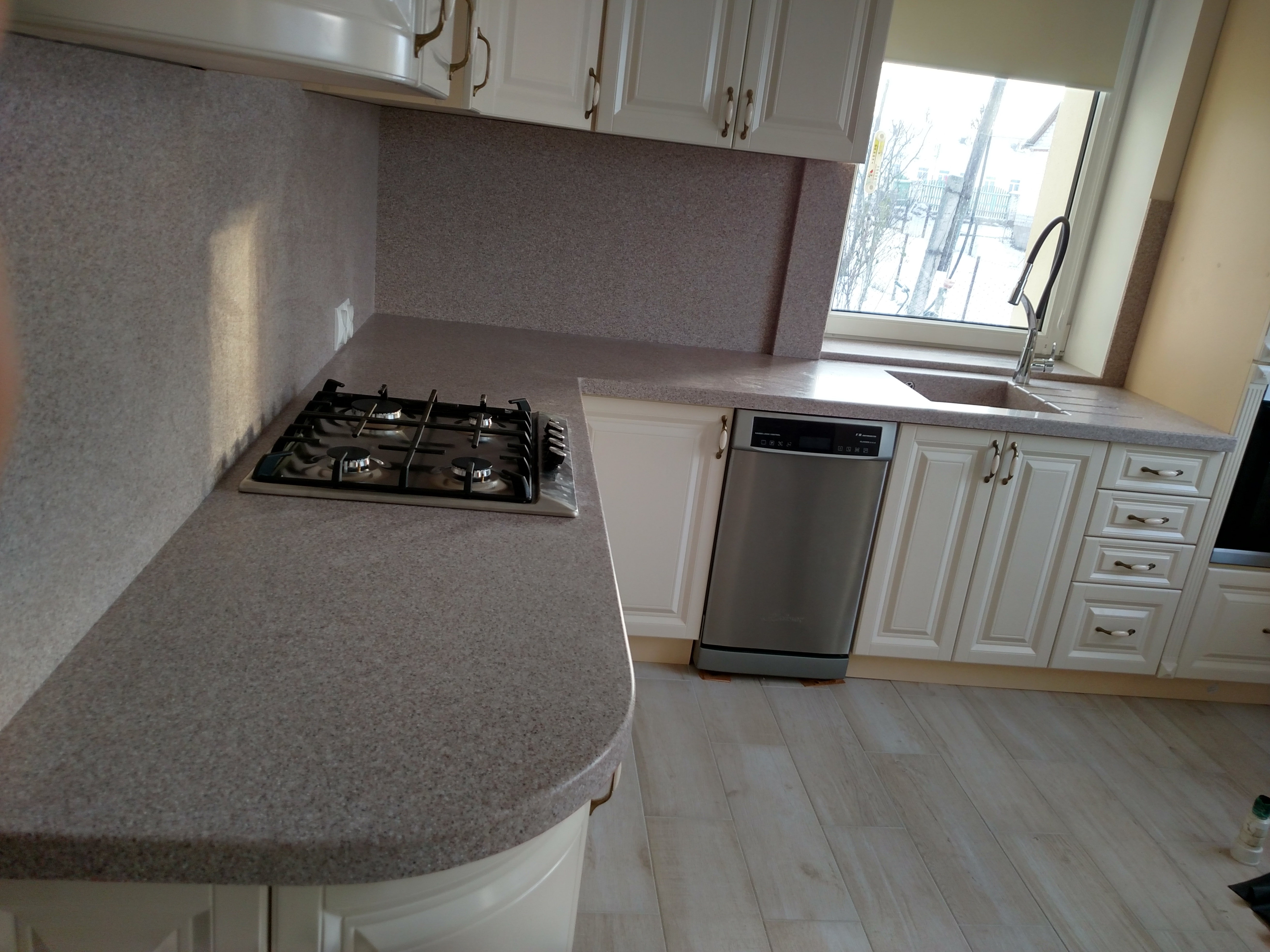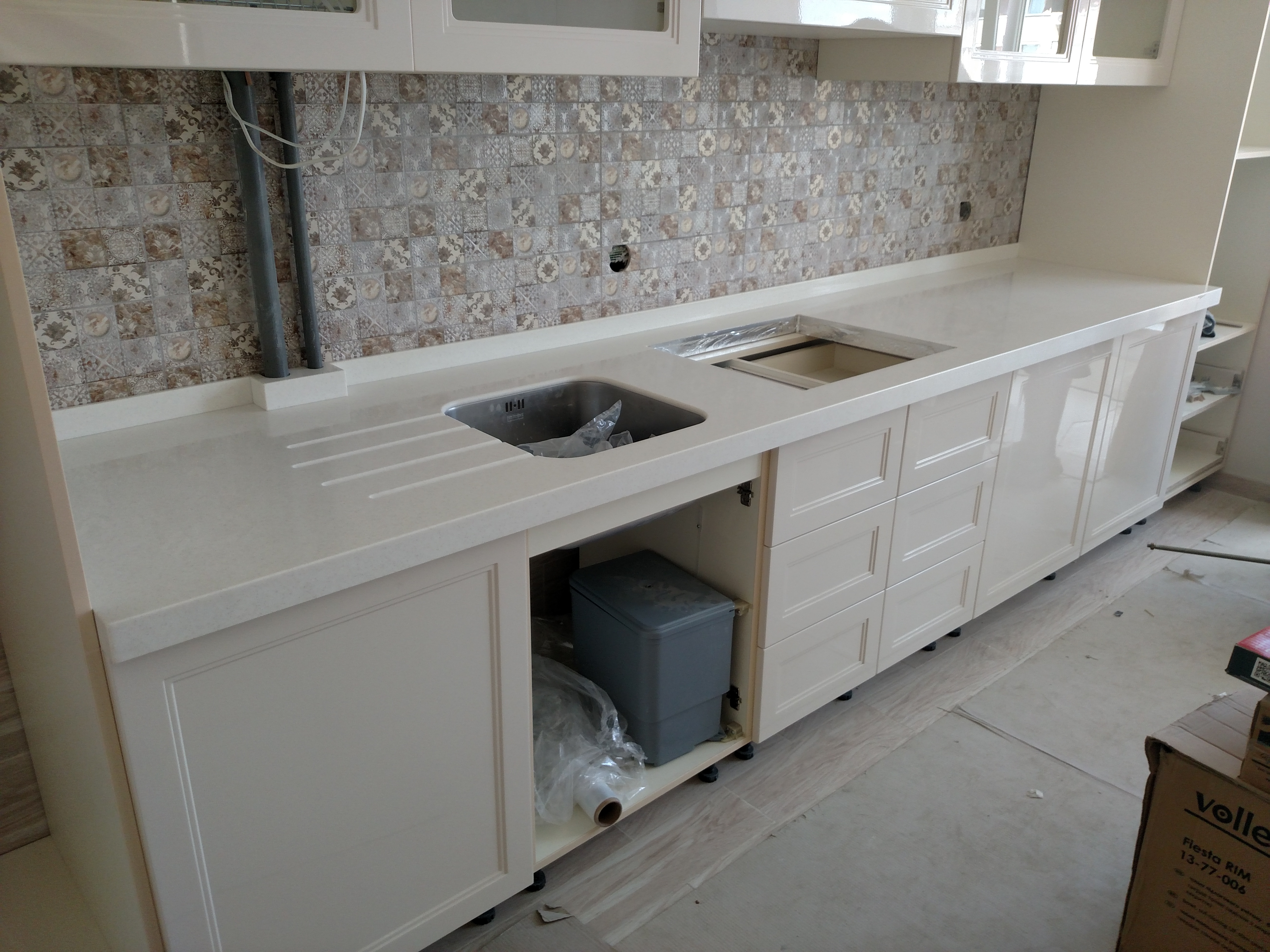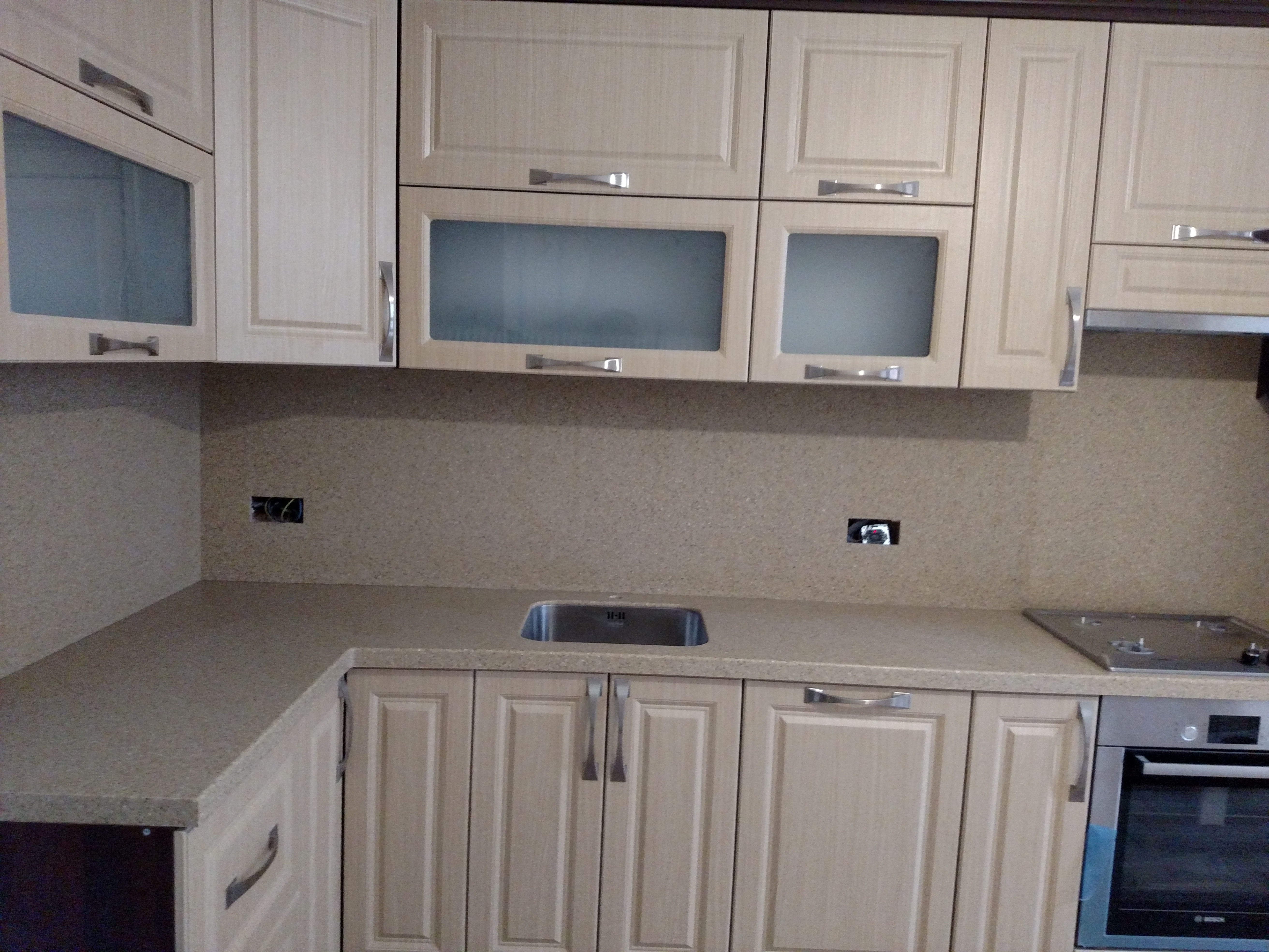 Приклад на фото. Розмір стільниці зі штучного каменю: 1800x2500 мм. Глибина обох сторін: 600 мм. У вартість стільниці входить: внутрішній, зовнішній радіус і мийка. Ціна даної стільниці зі штучного каменю 1450$.