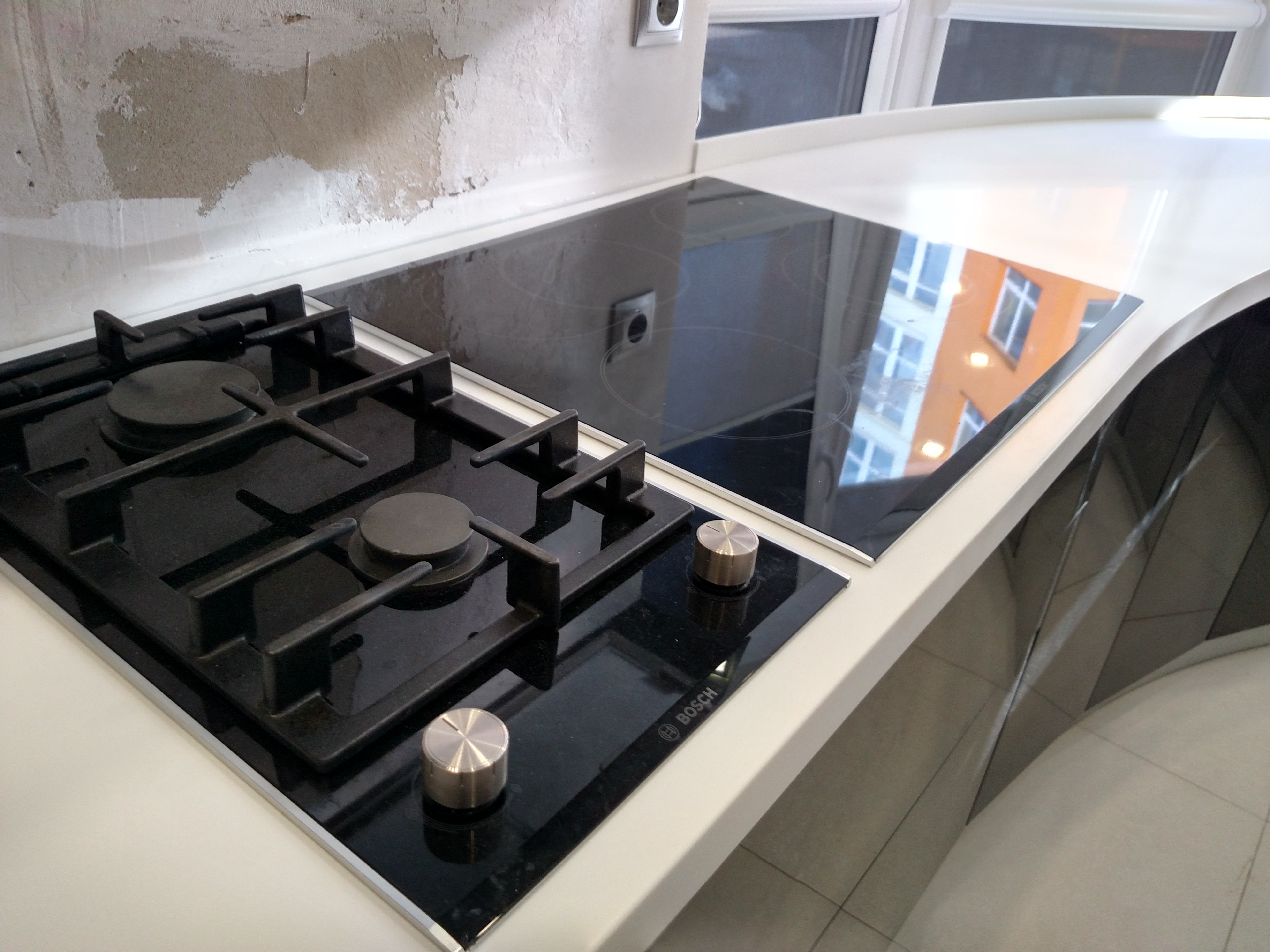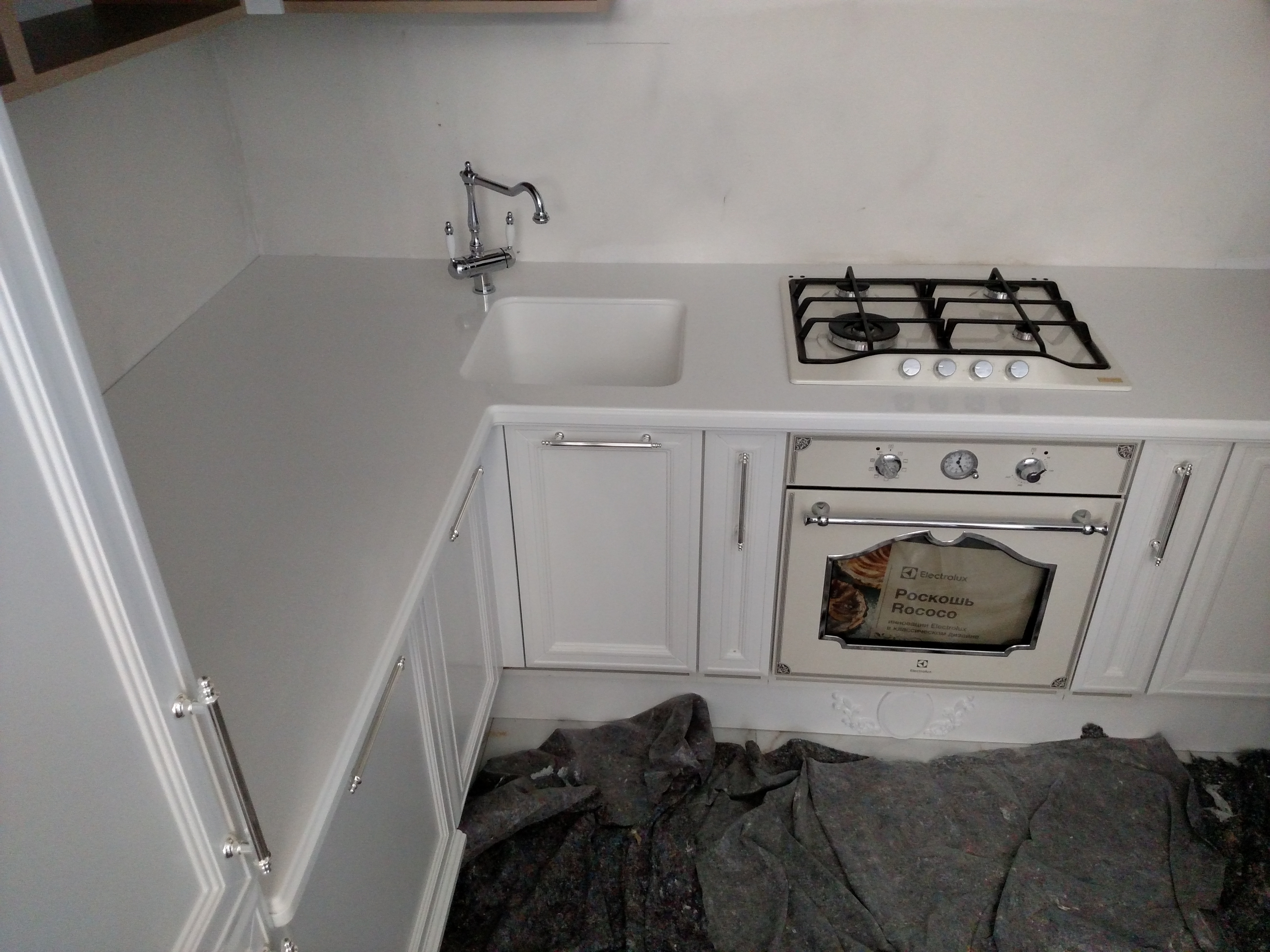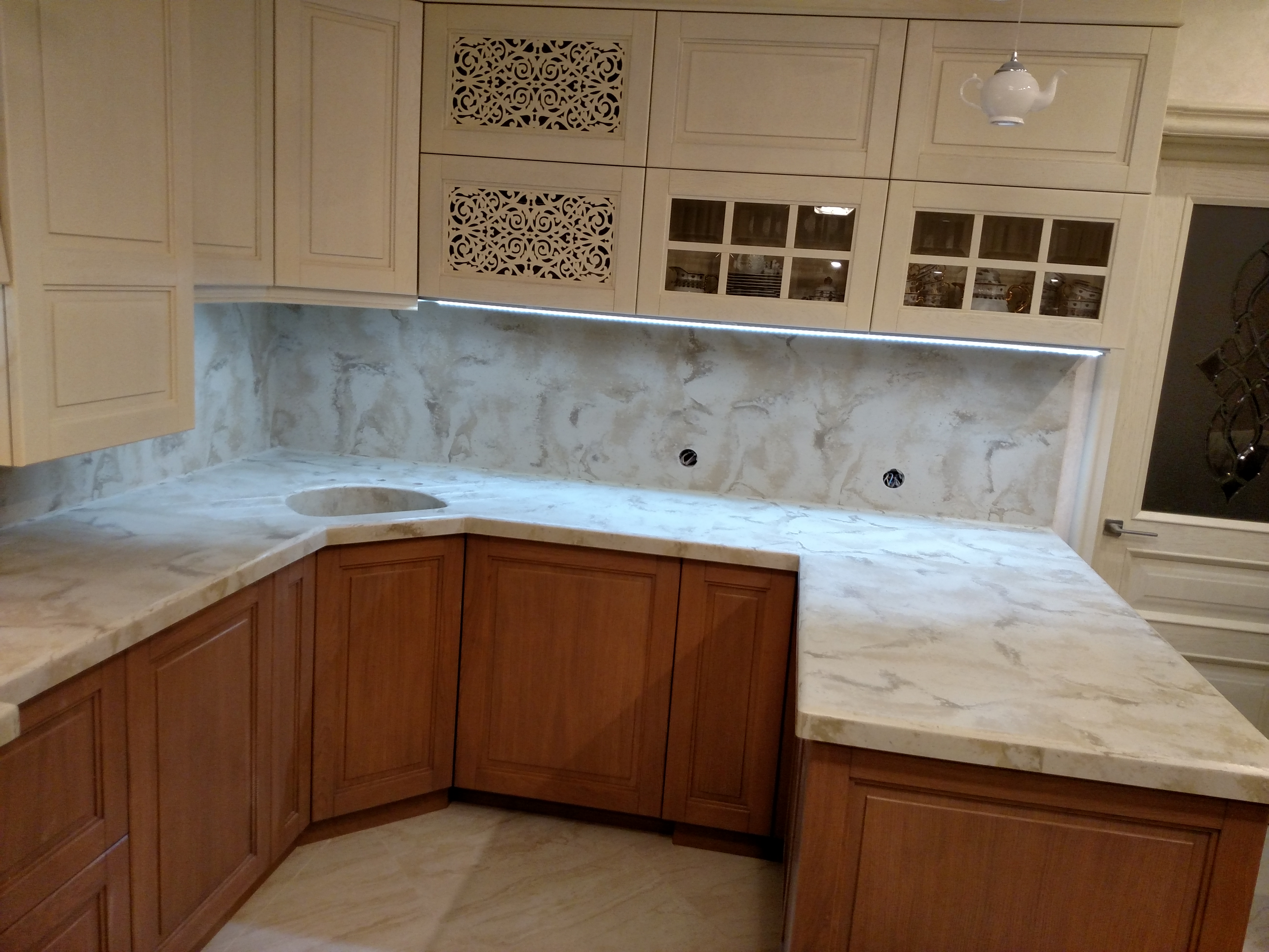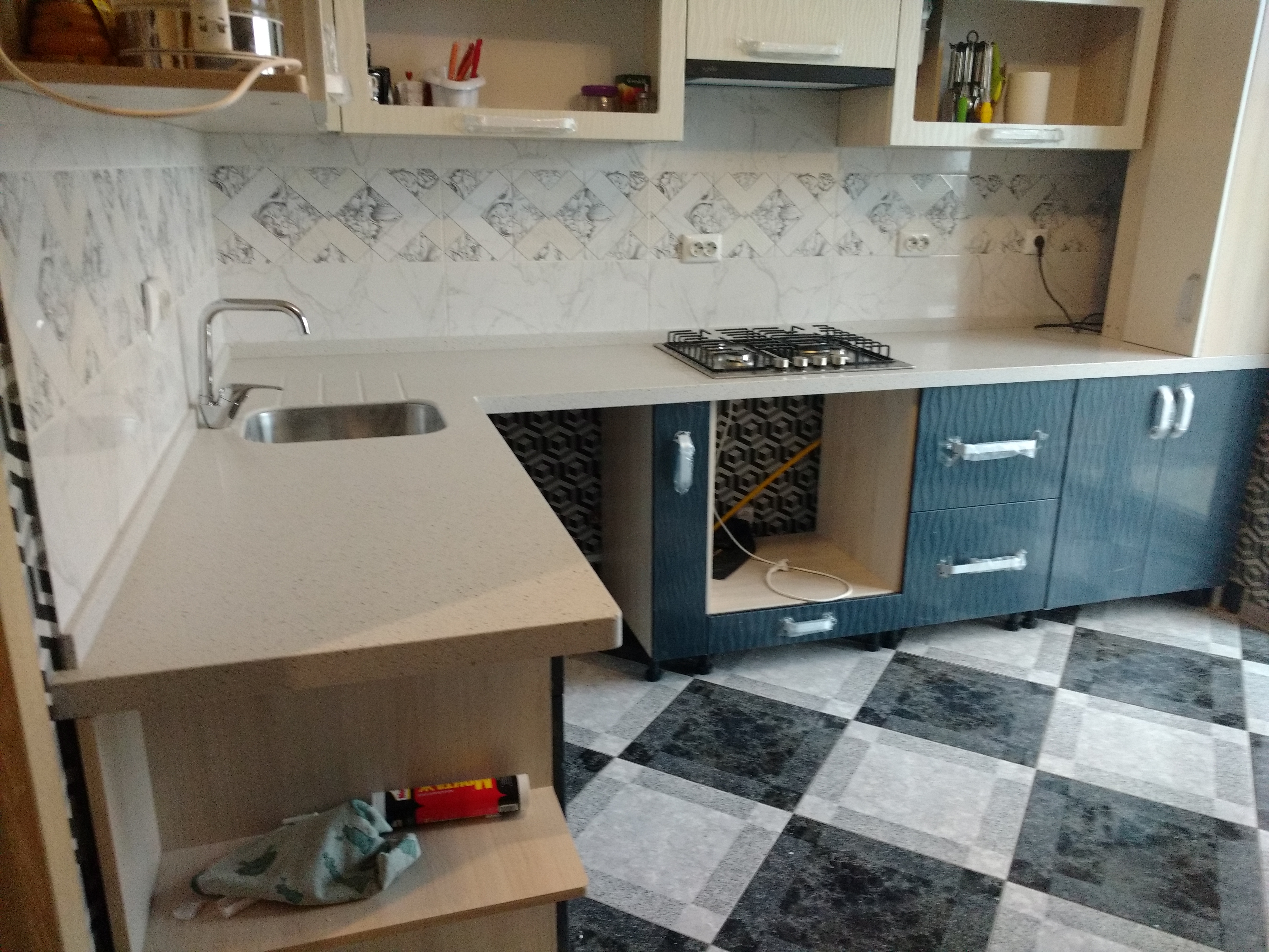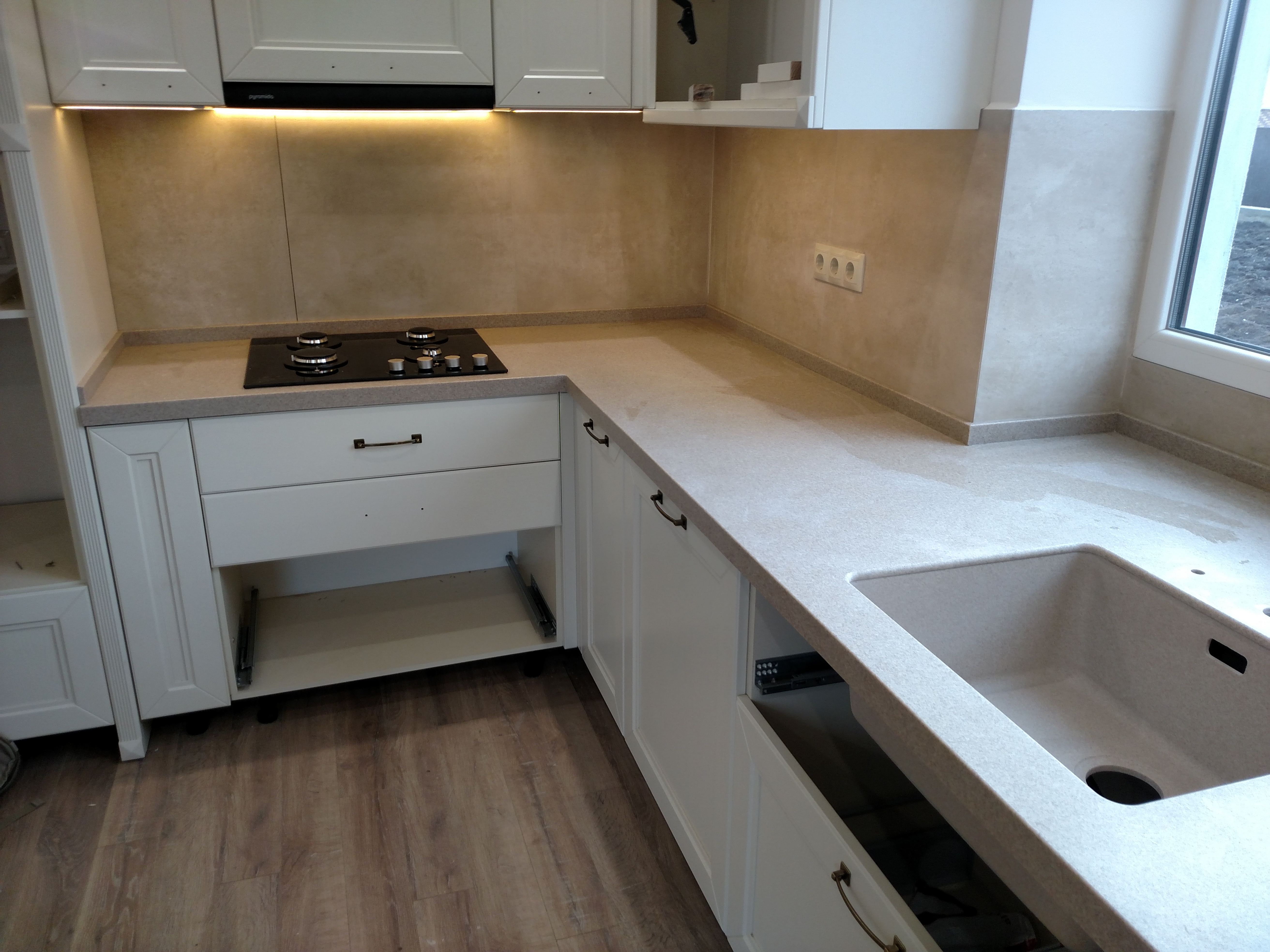 Приклад на фото. Розмір стільниці зі штучного каменю: 1800x2500 мм. Глибина обох сторін: 600 мм. У вартість стільниці входить: внутрішній, зовнішній радіус і мийка. Ціна даної стільниці зі штучного каменю 1450$.