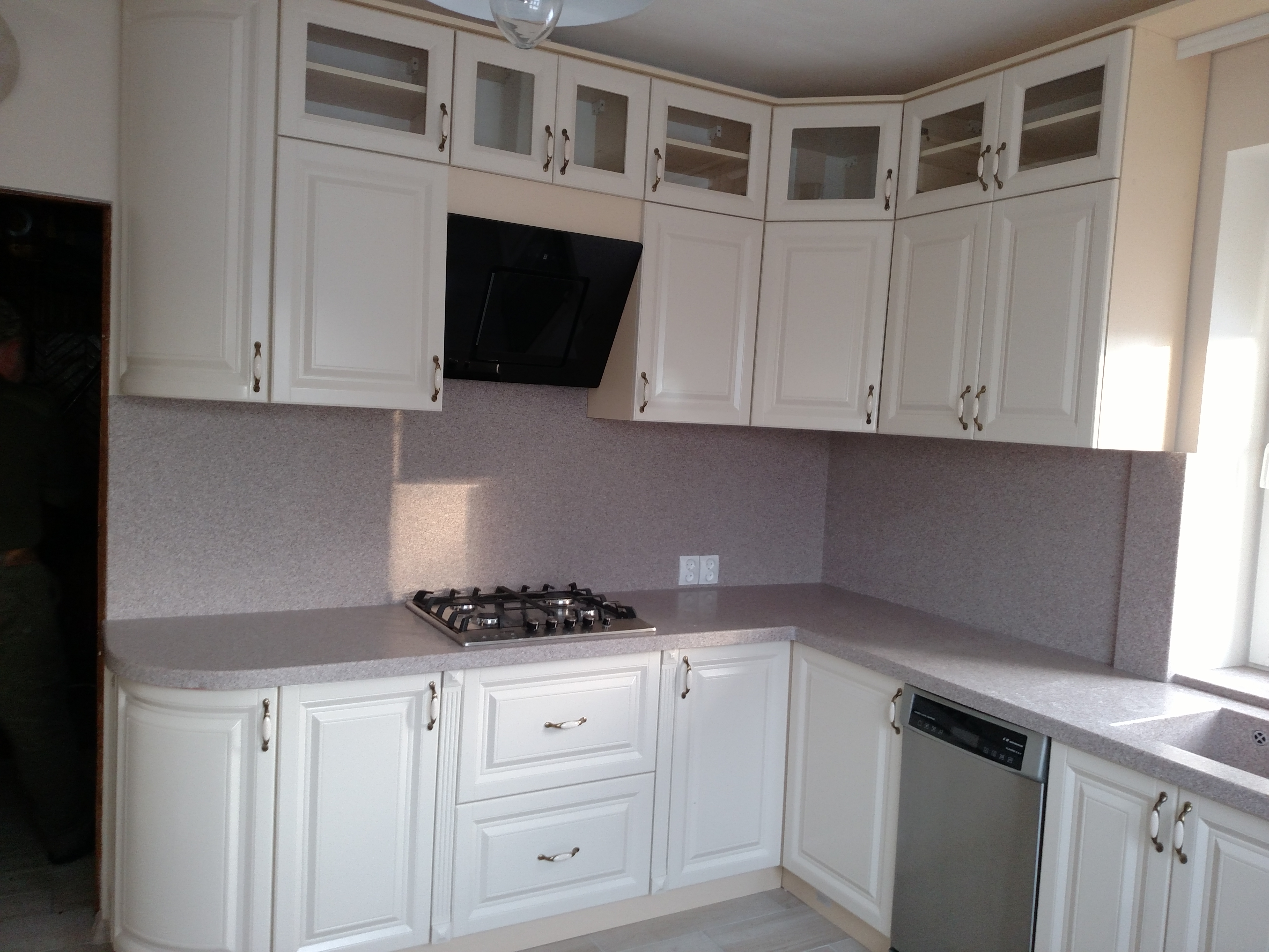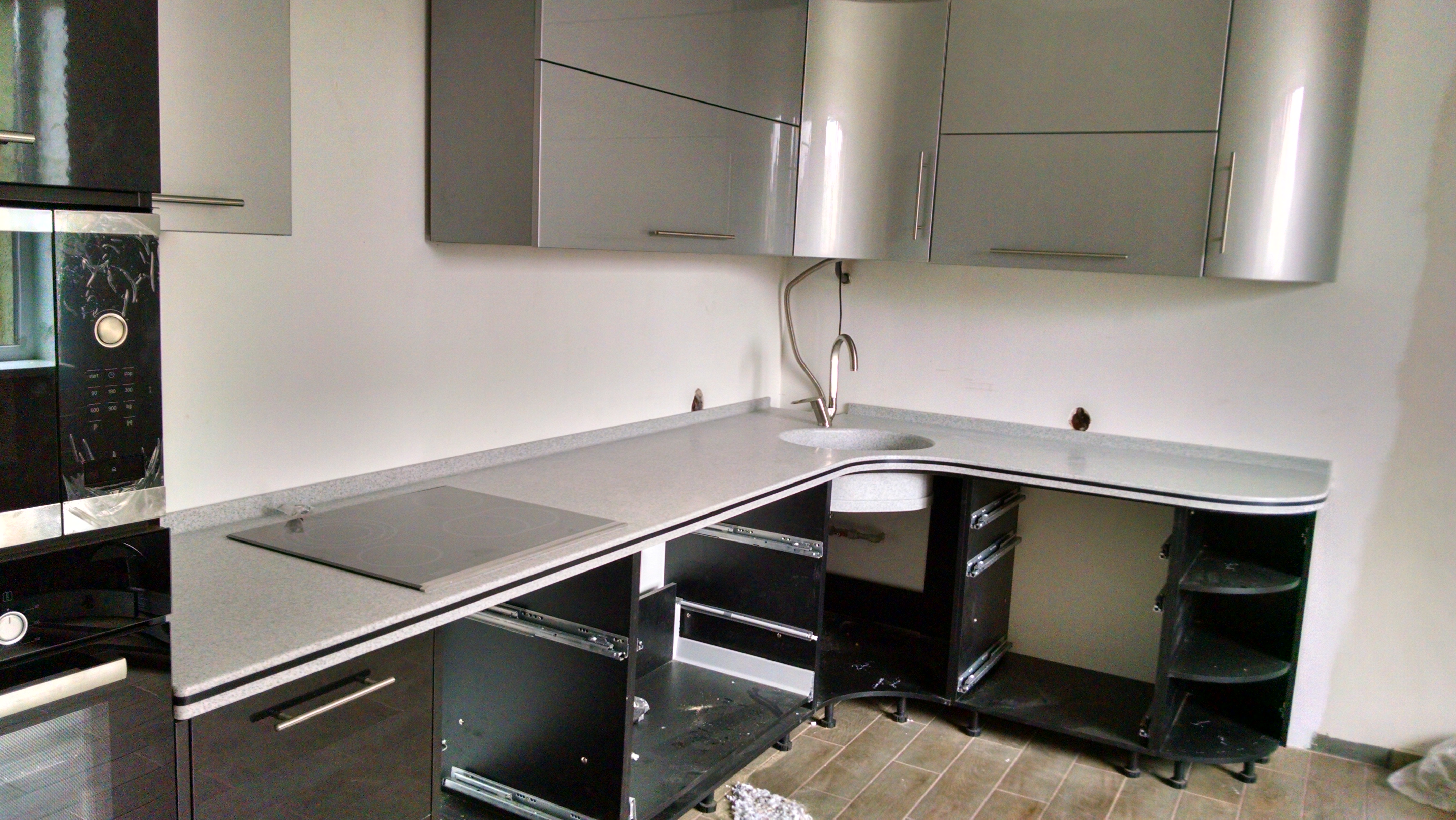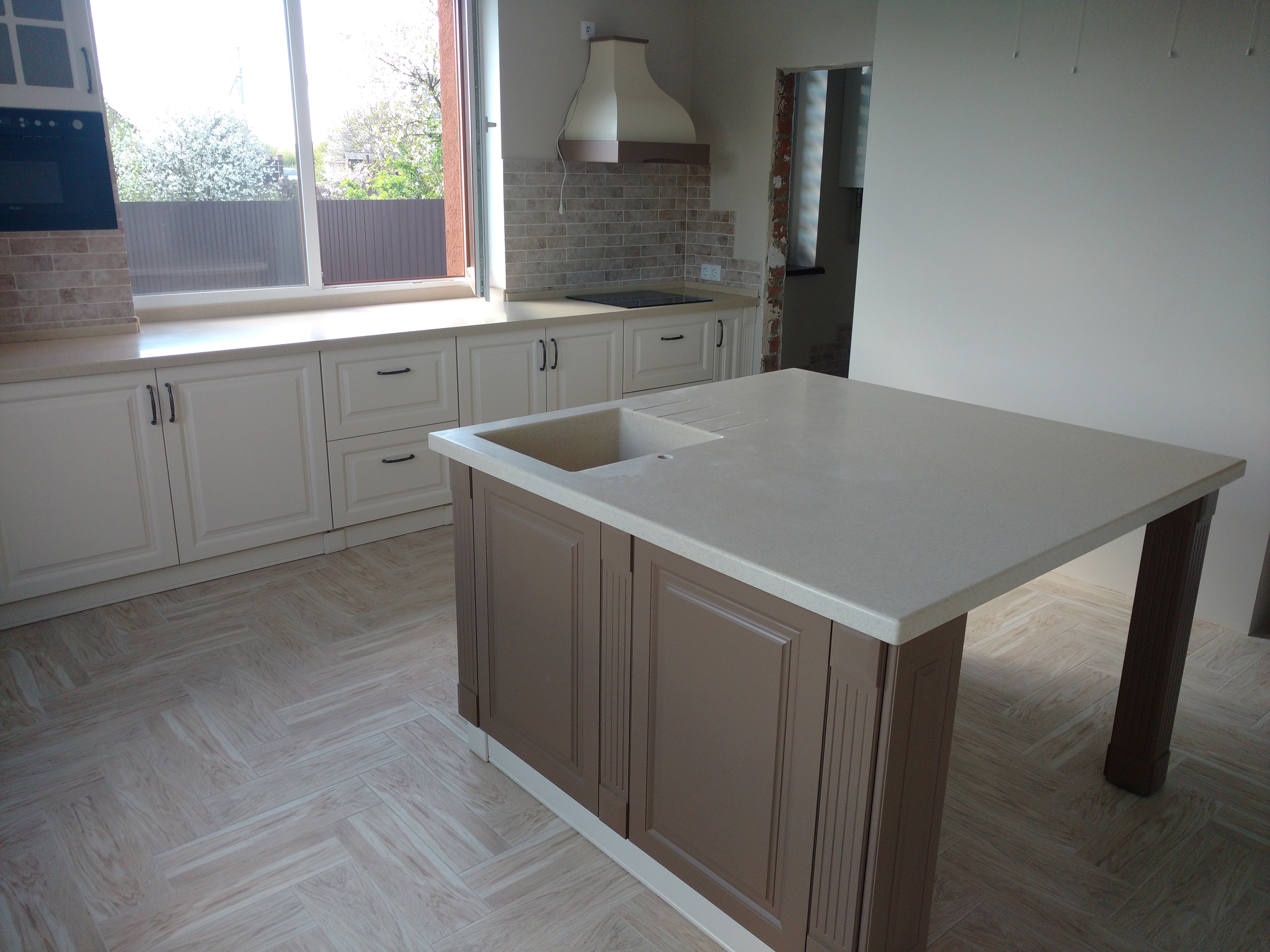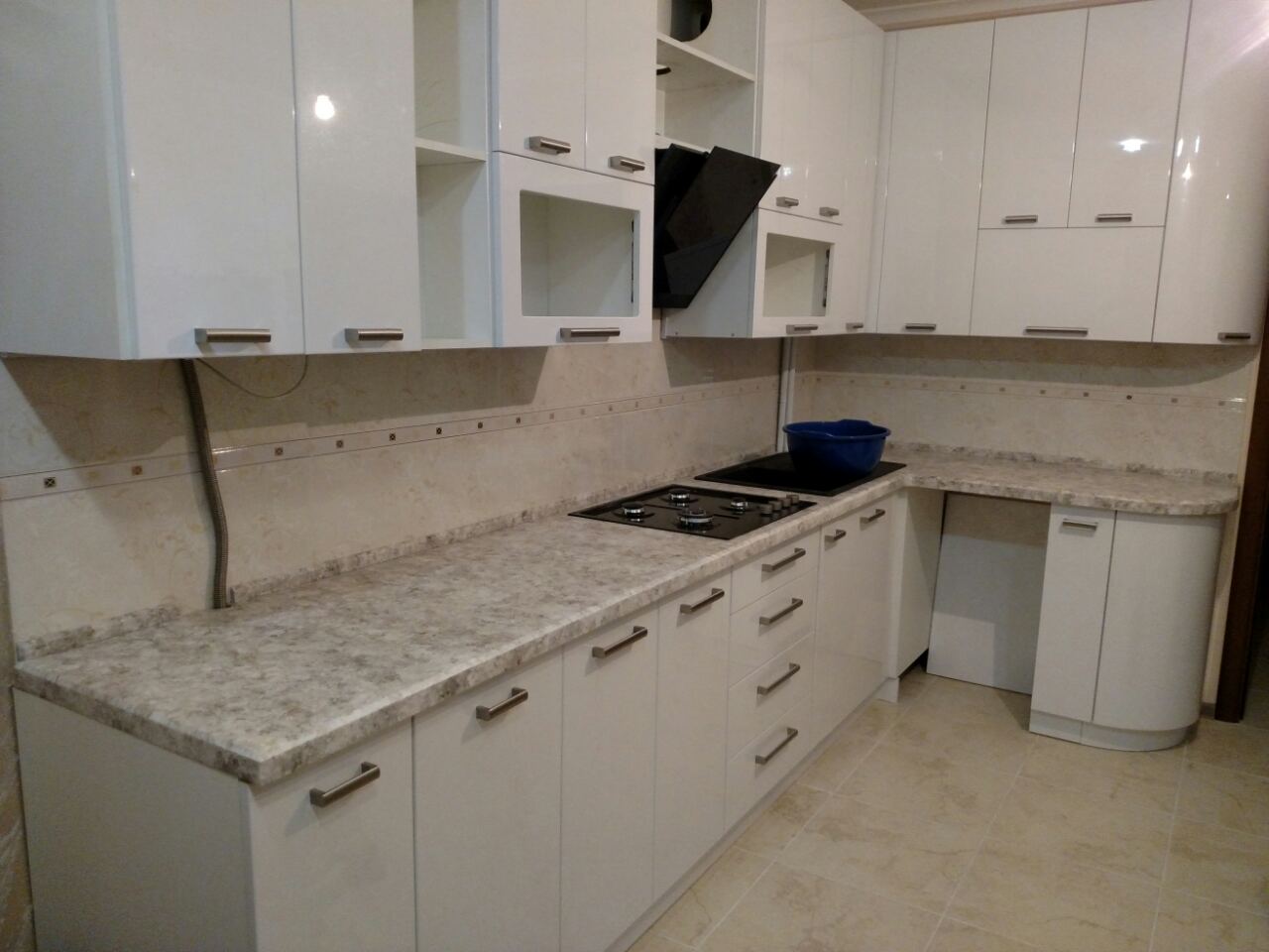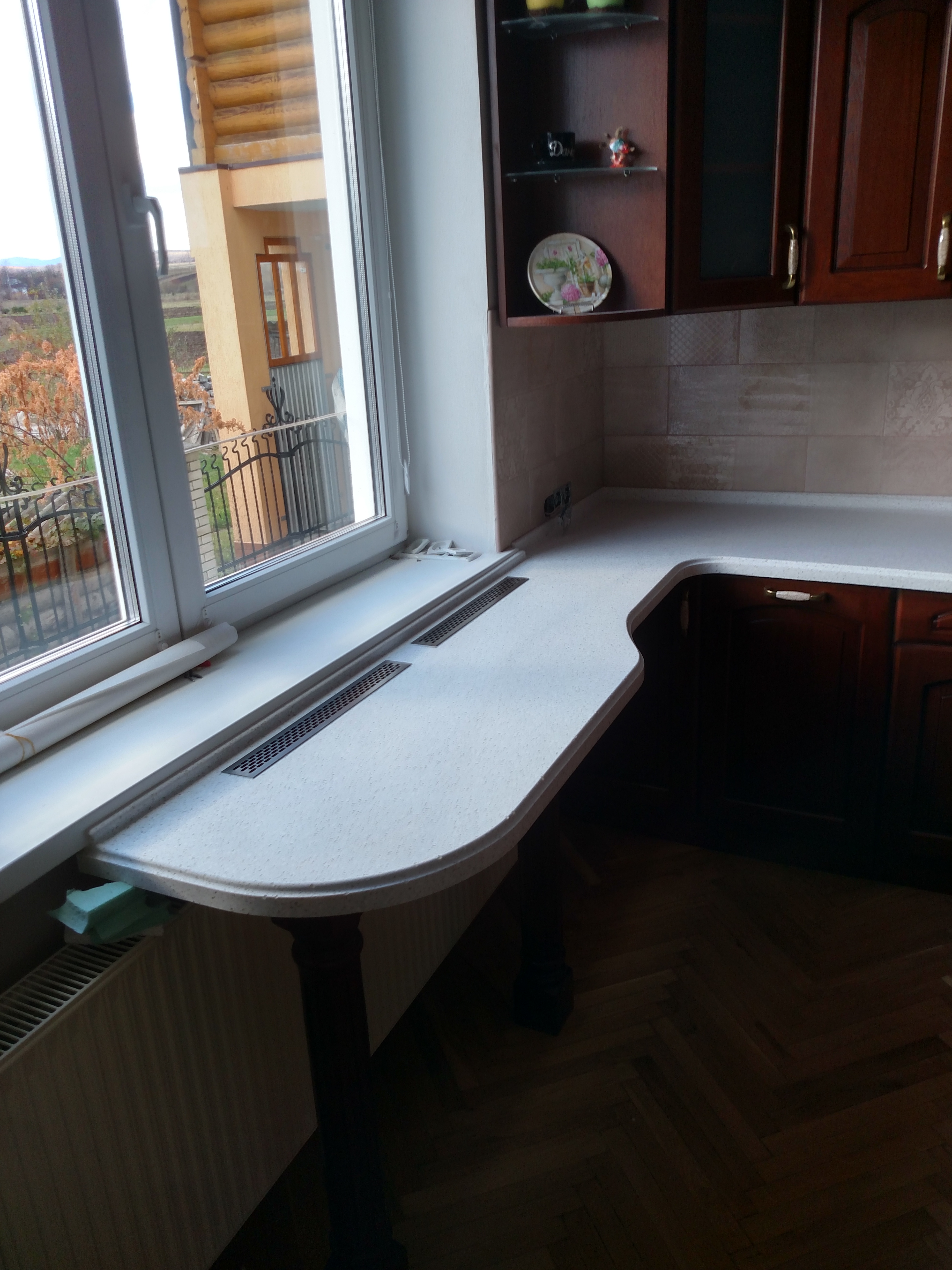Приклад на фото. Розмір стільниці зі штучного каменю: 1800x2500 мм. Глибина обох сторін: 600 мм. У вартість стільниці входить: внутрішній, зовнішній радіус і мийка. Ціна даної стільниці зі штучного каменю 1450$.