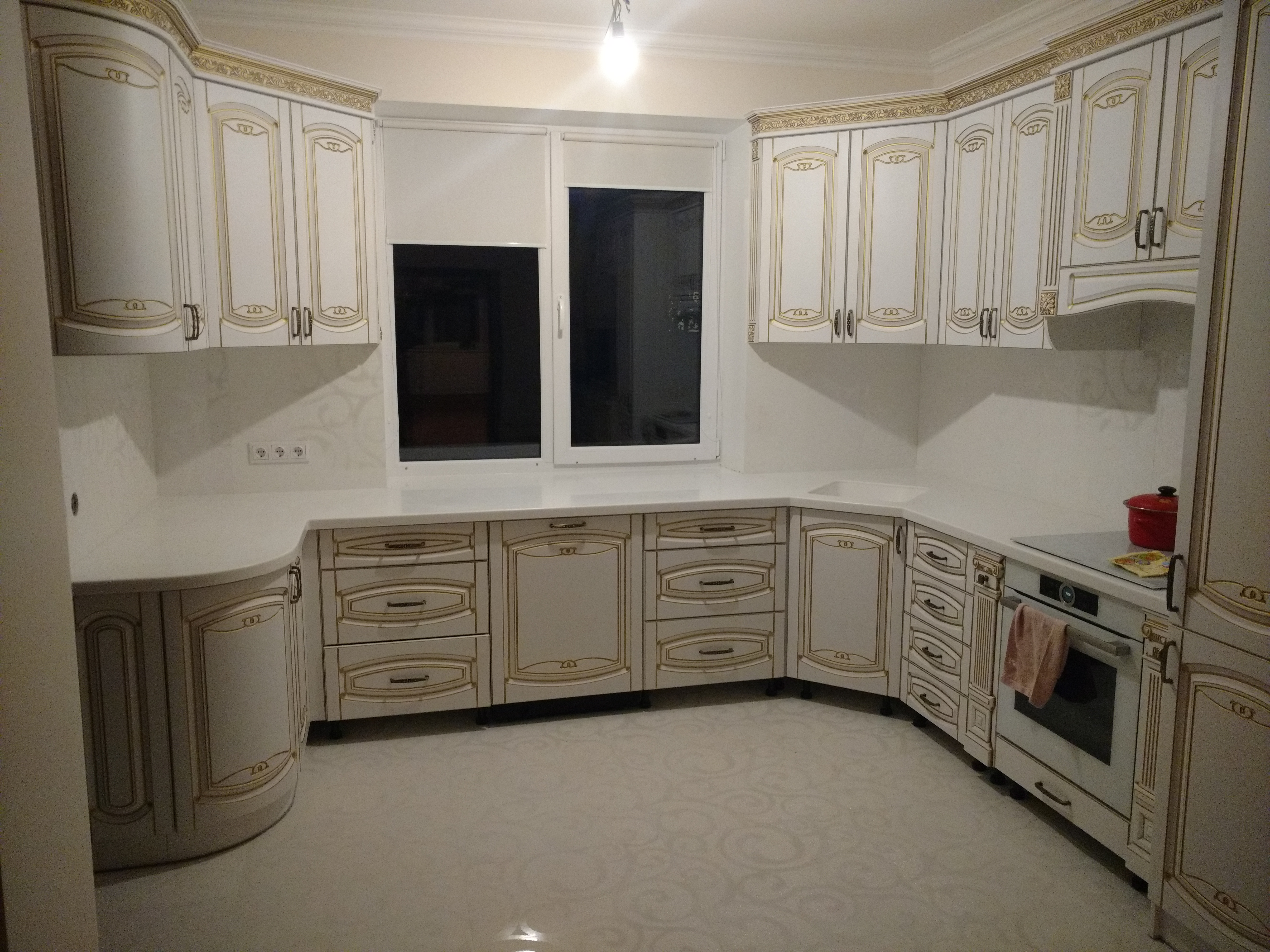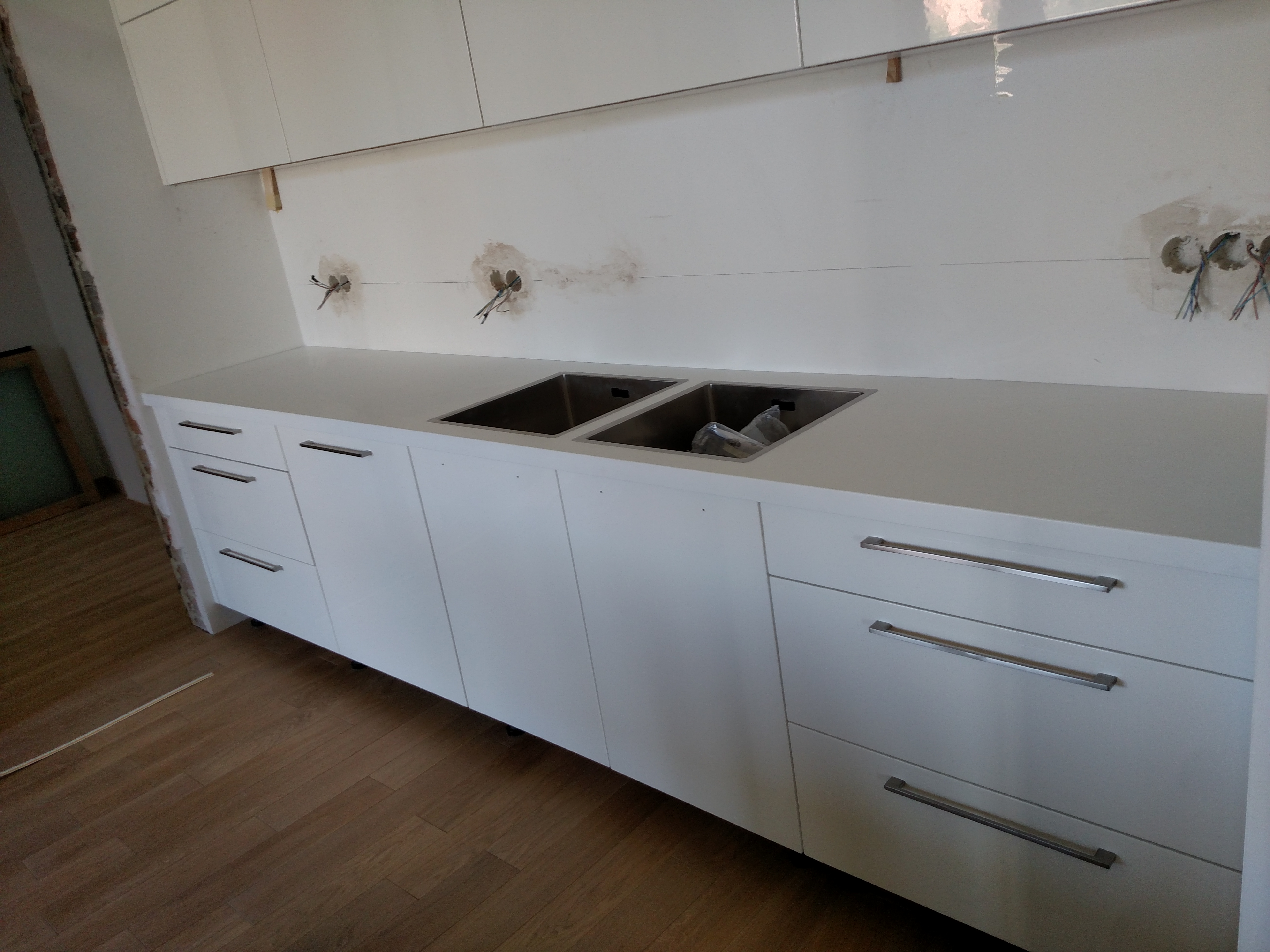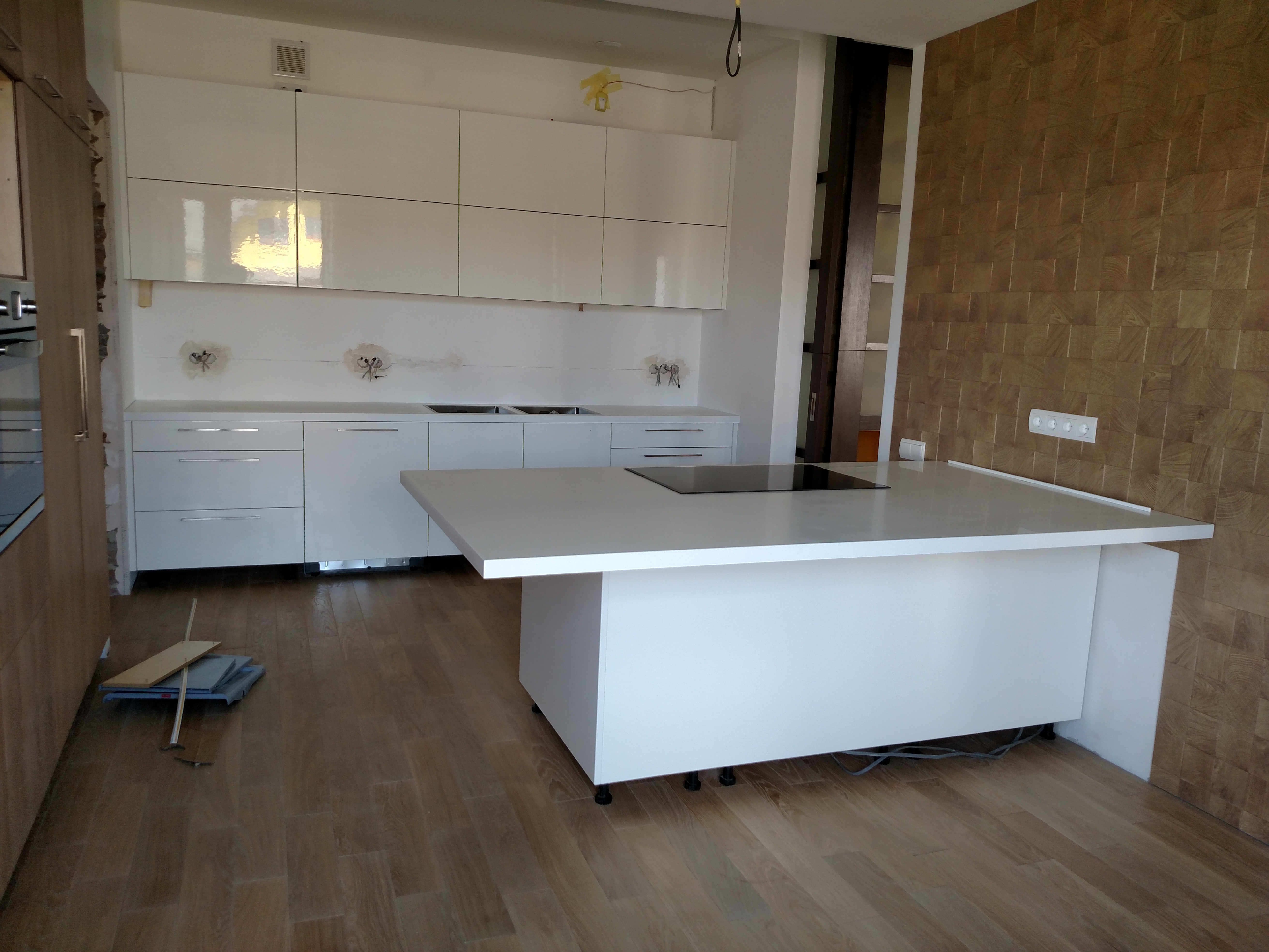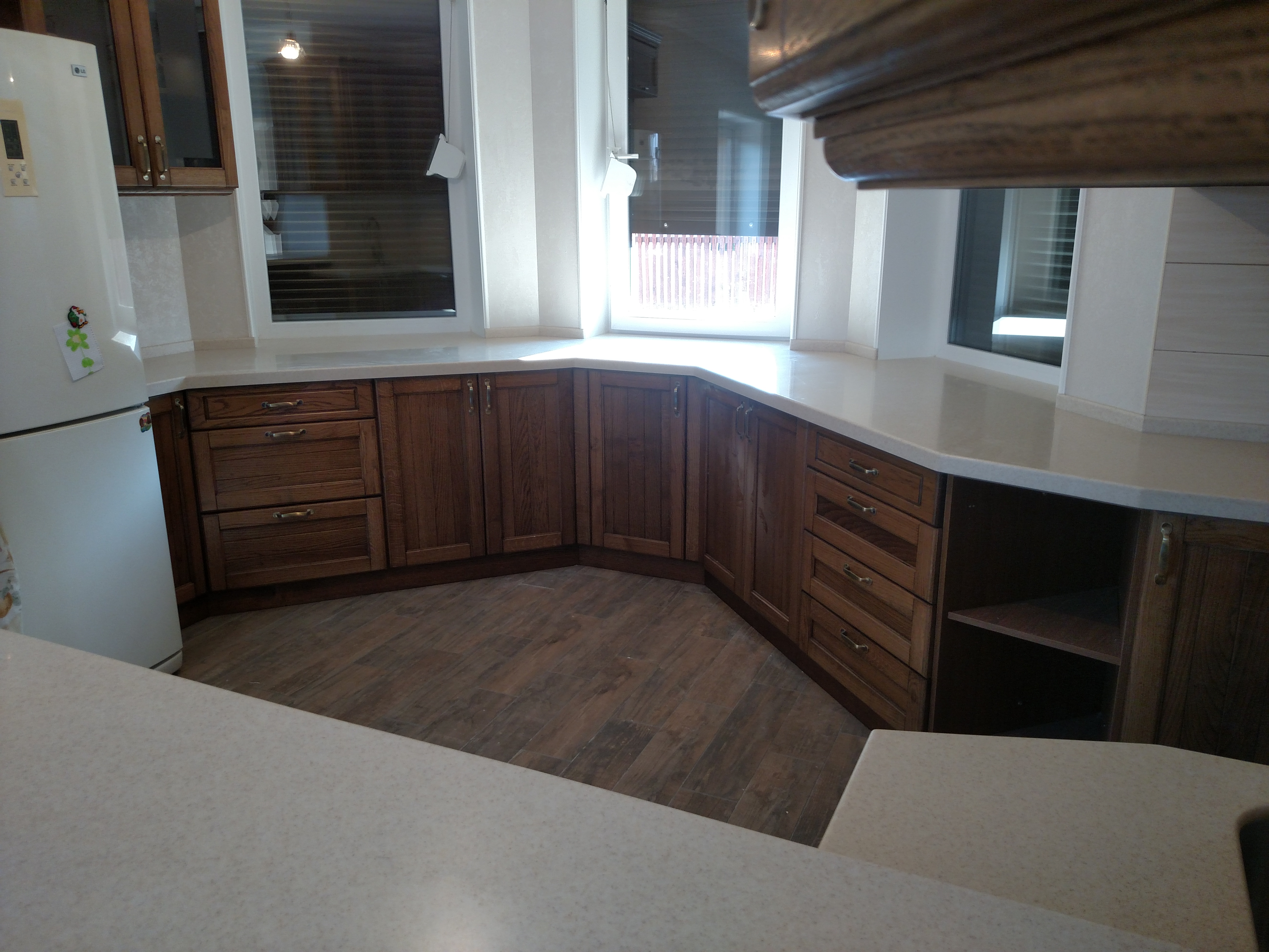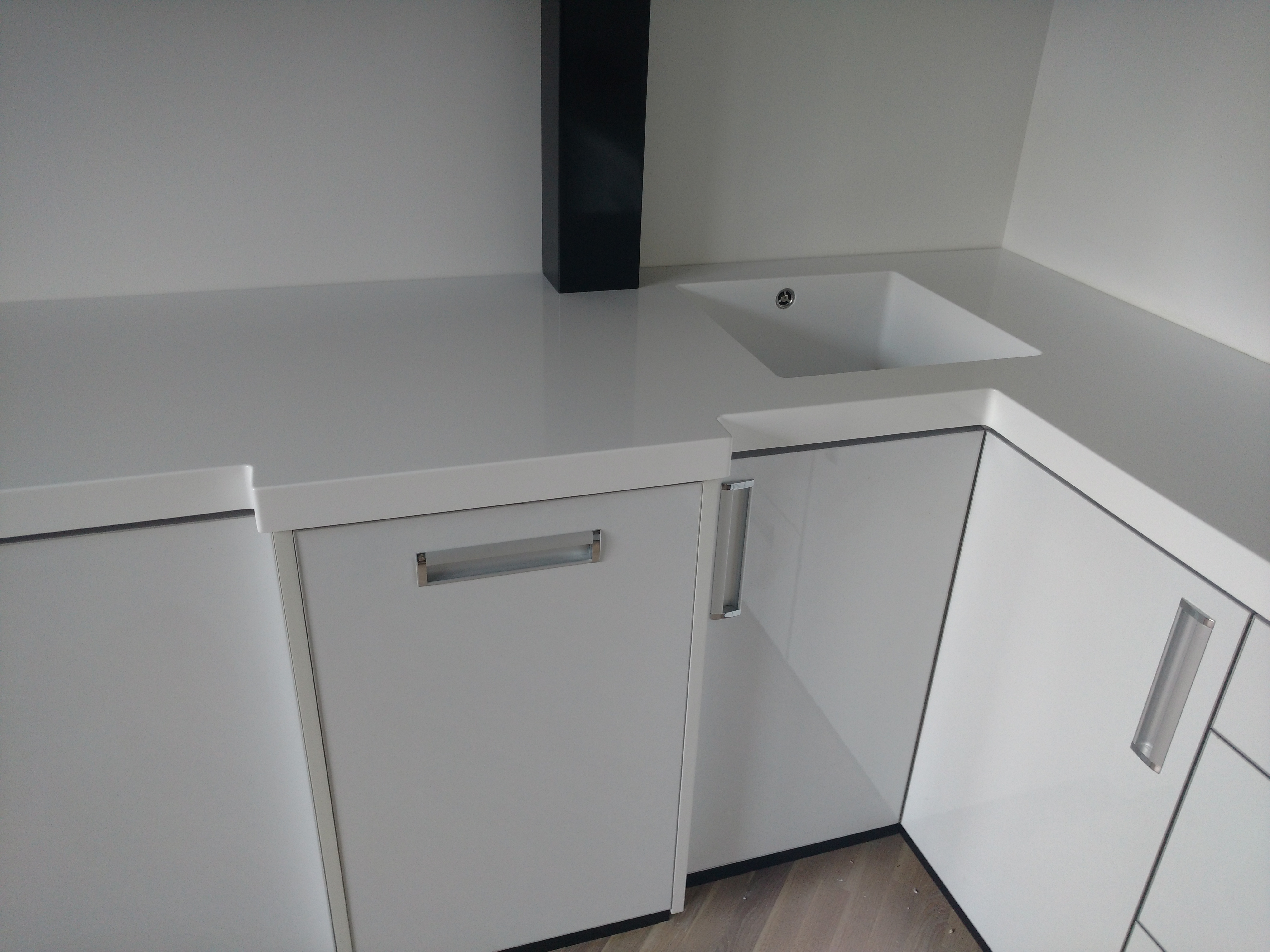 Приклад на фото. Розмір стільниці зі штучного каменю: 1800x2500 мм. Глибина обох сторін: 600 мм. У вартість стільниці входить: внутрішній, зовнішній радіус і мийка. Ціна даної стільниці зі штучного каменю 1450$.