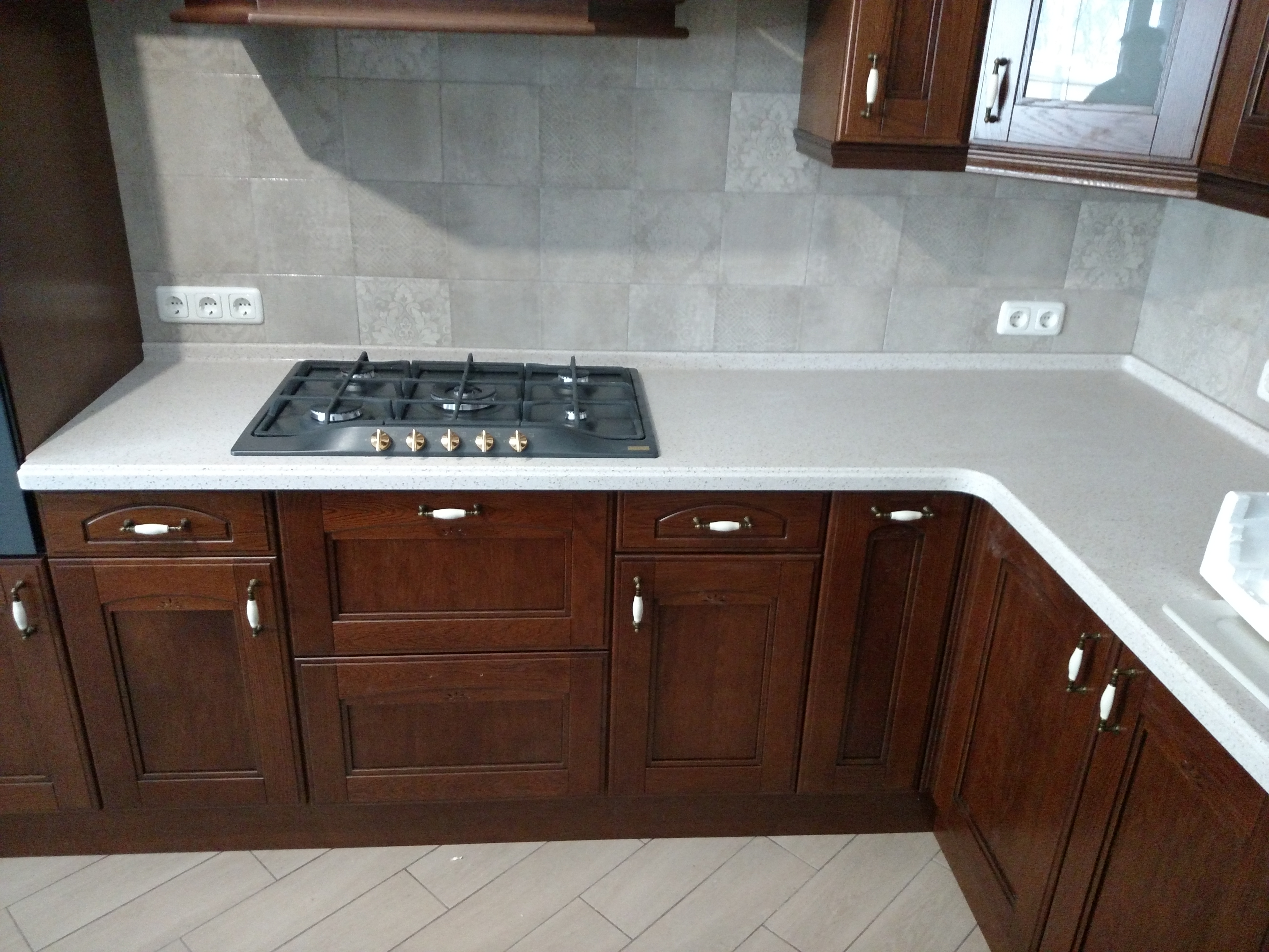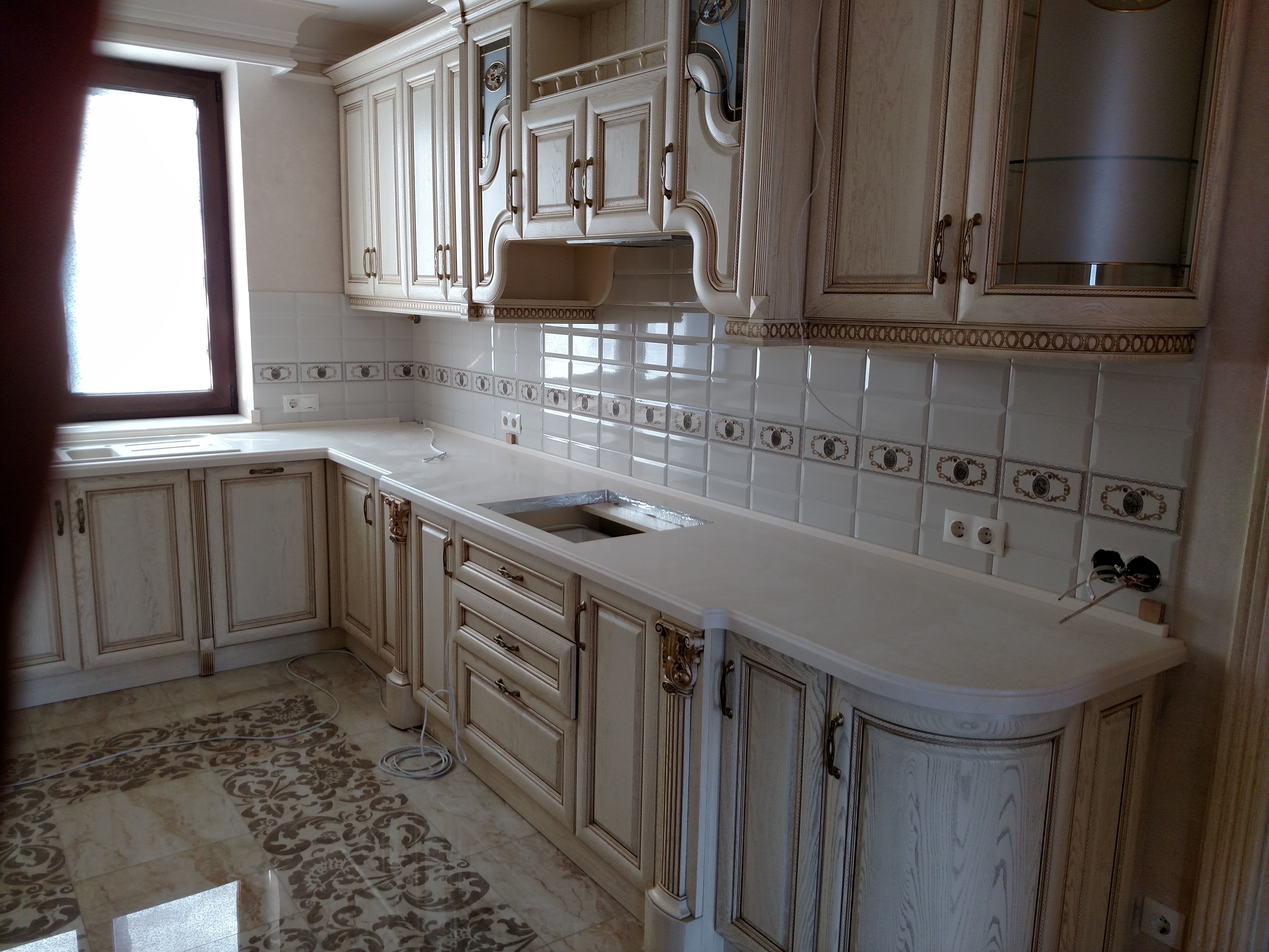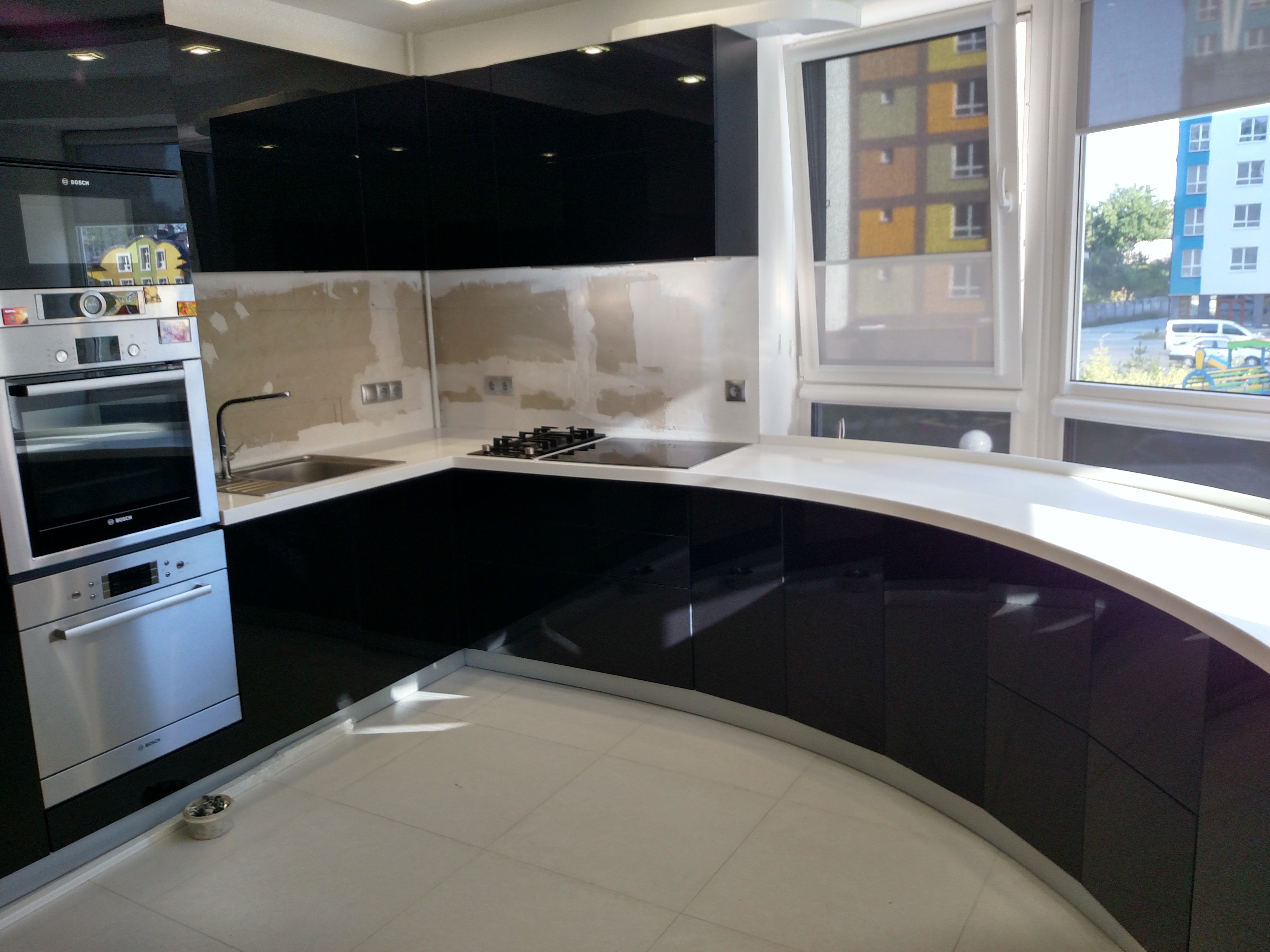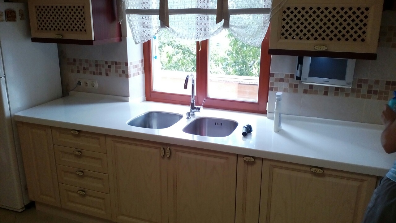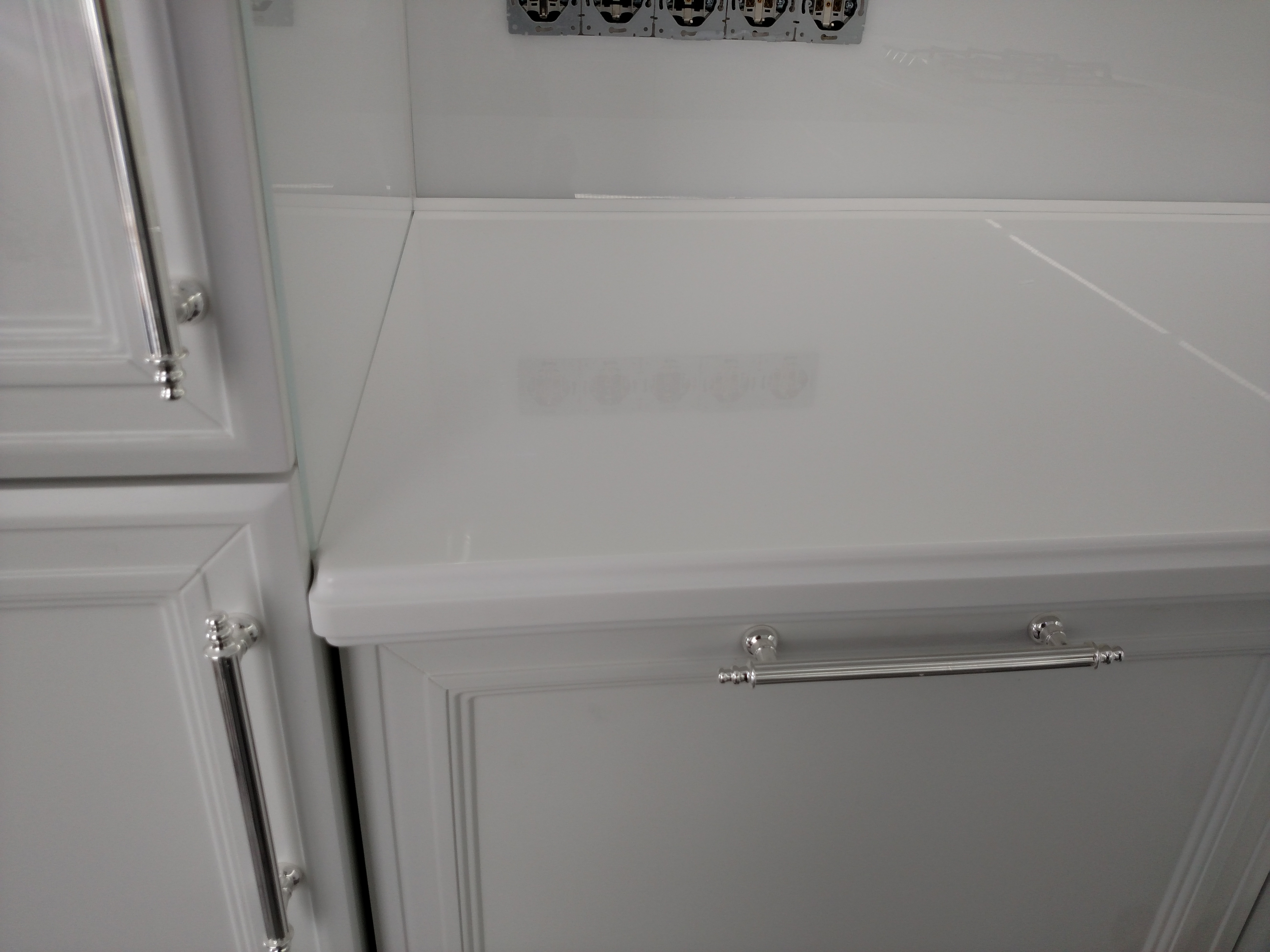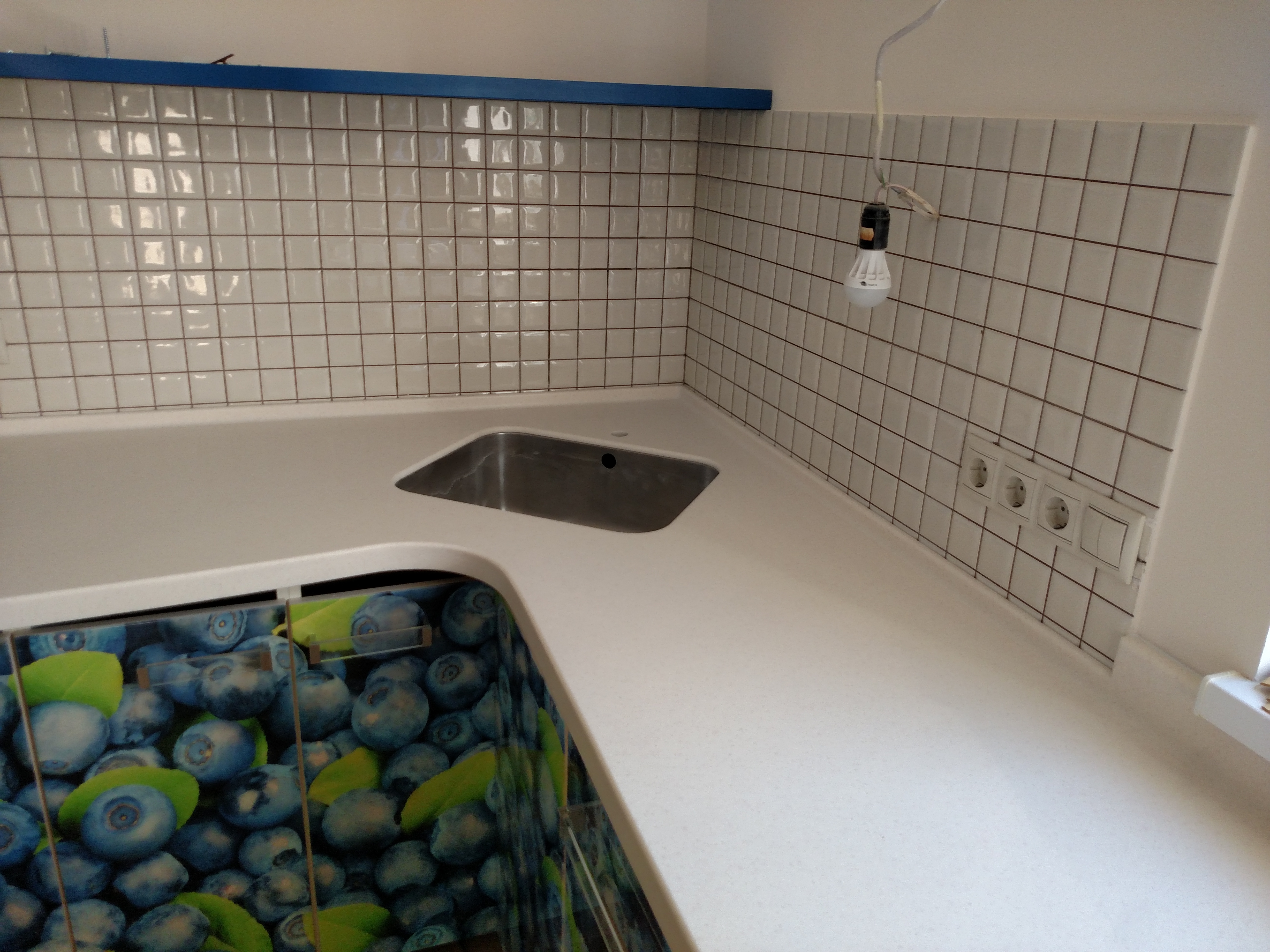 Приклад на фото. Розмір стільниці зі штучного каменю: 1800x2500 мм. Глибина обох сторін: 600 мм. У вартість стільниці входить: внутрішній, зовнішній радіус і мийка. Ціна даної стільниці зі штучного каменю 1450$.