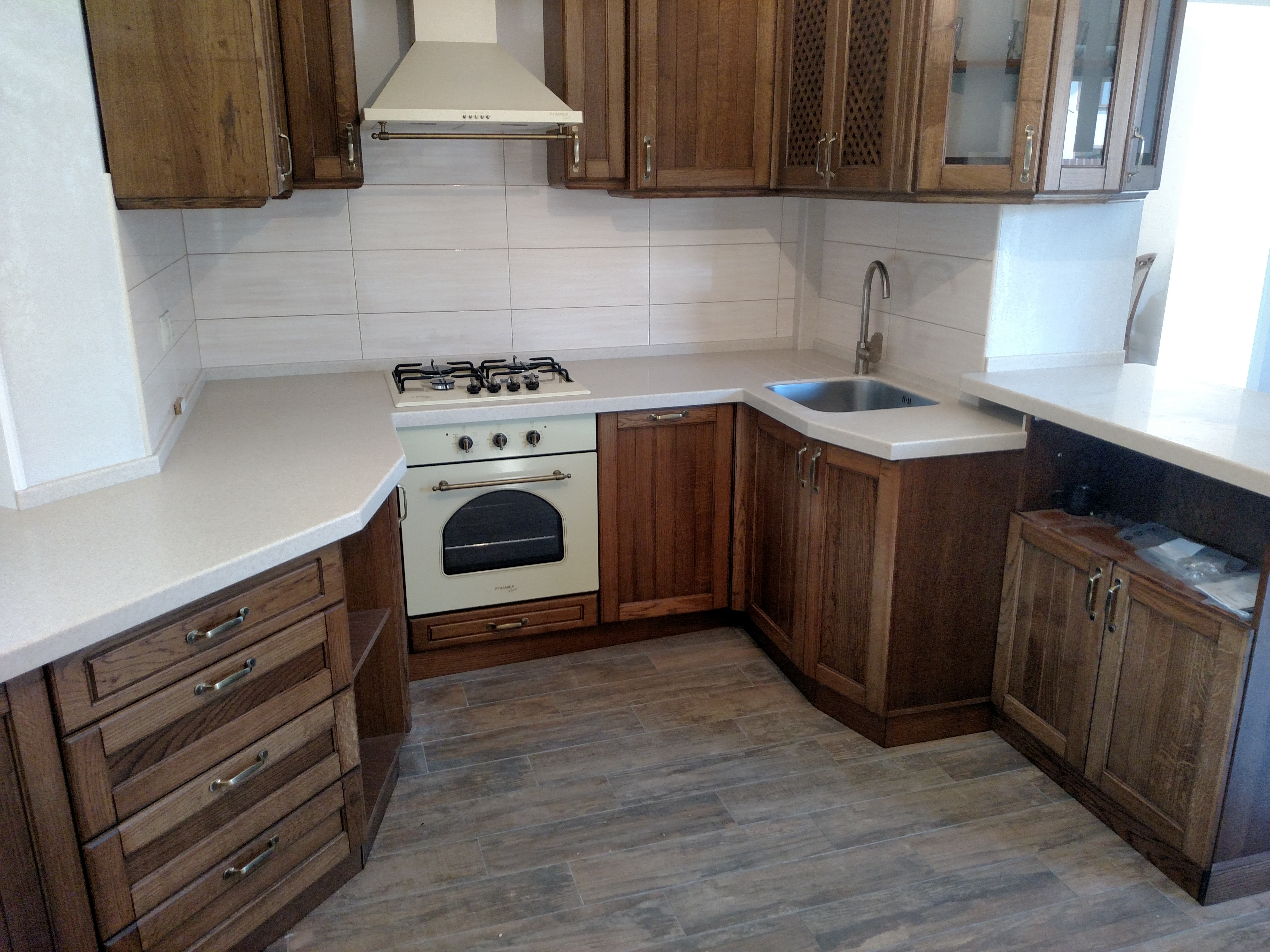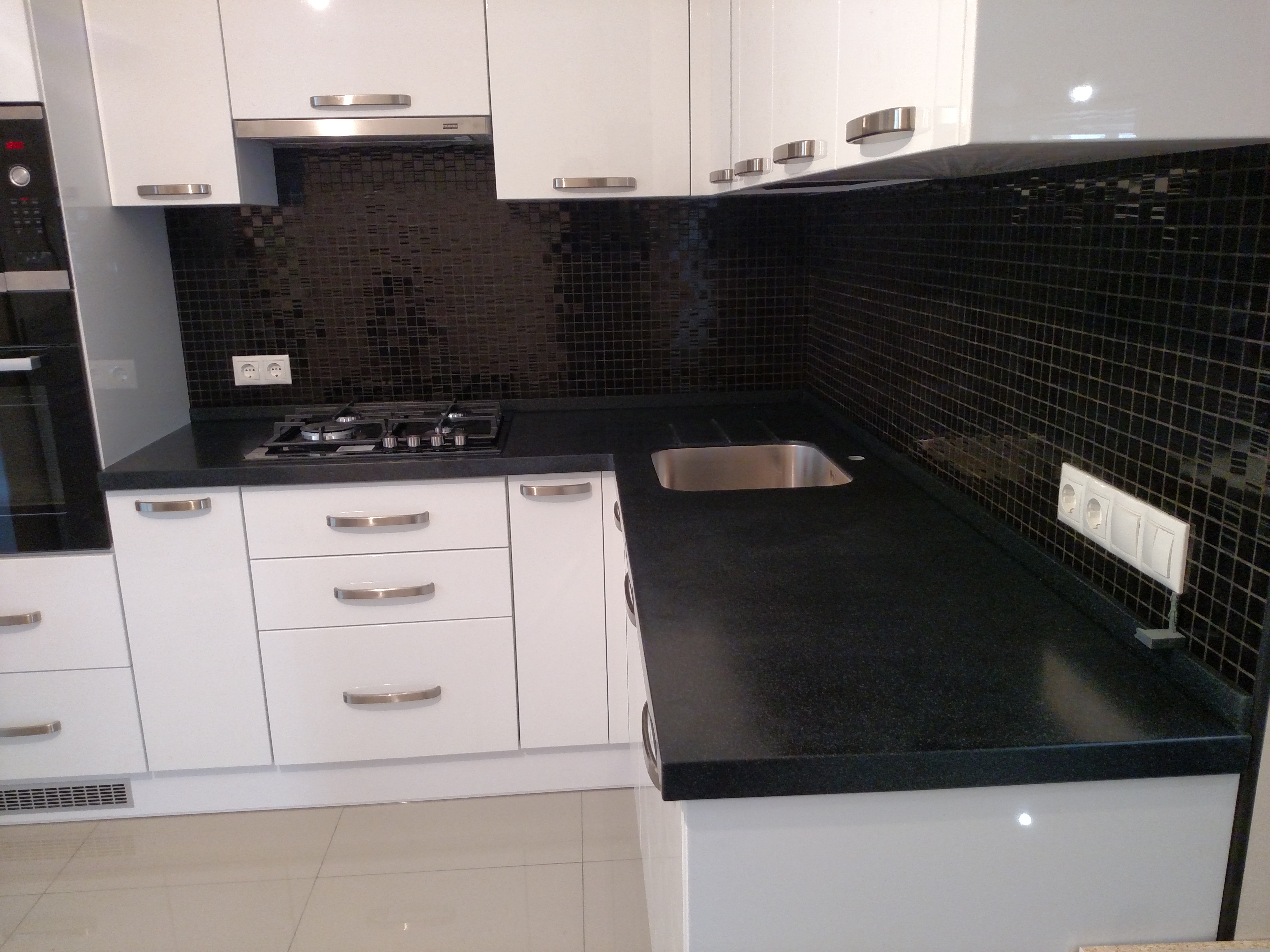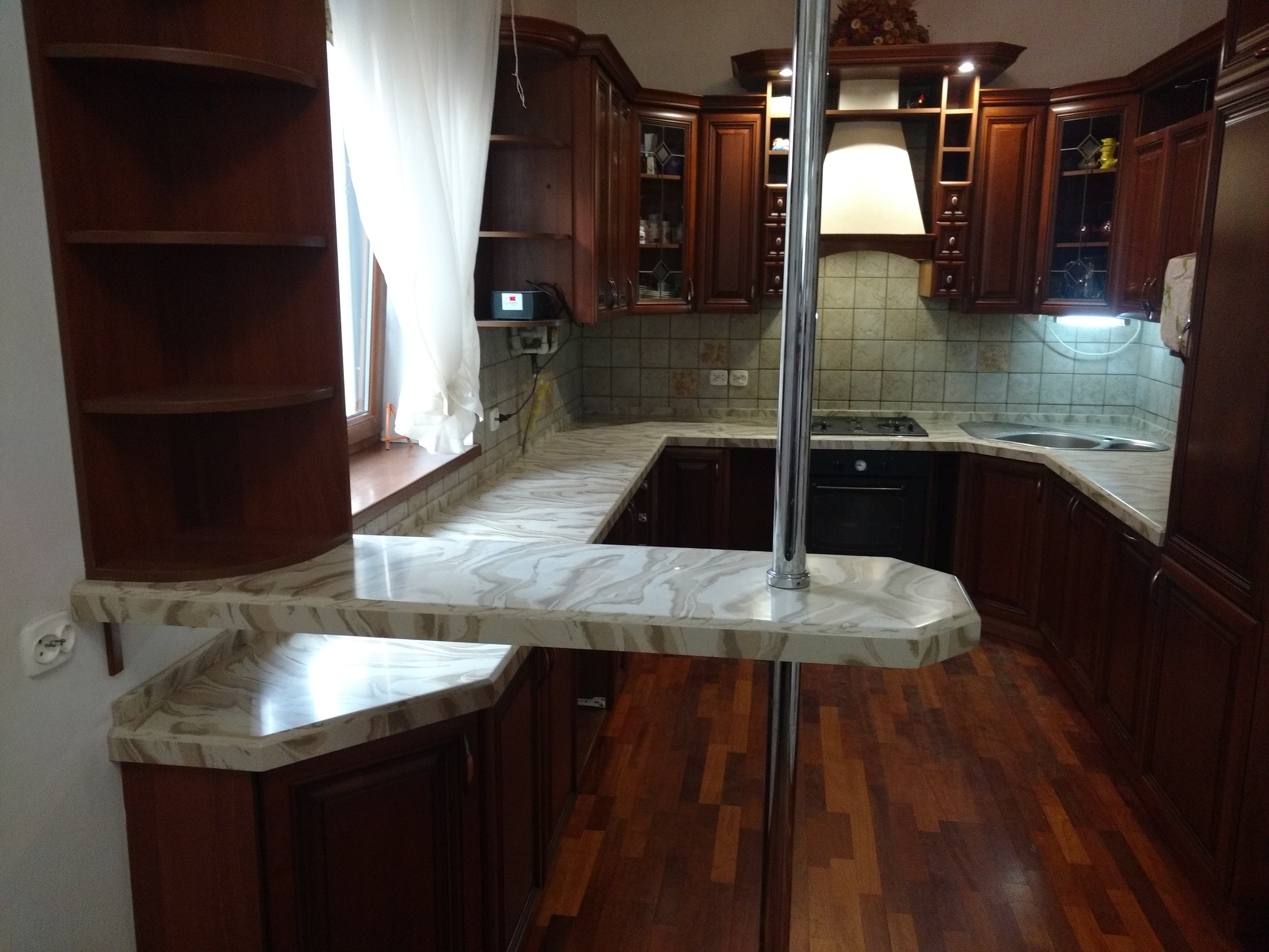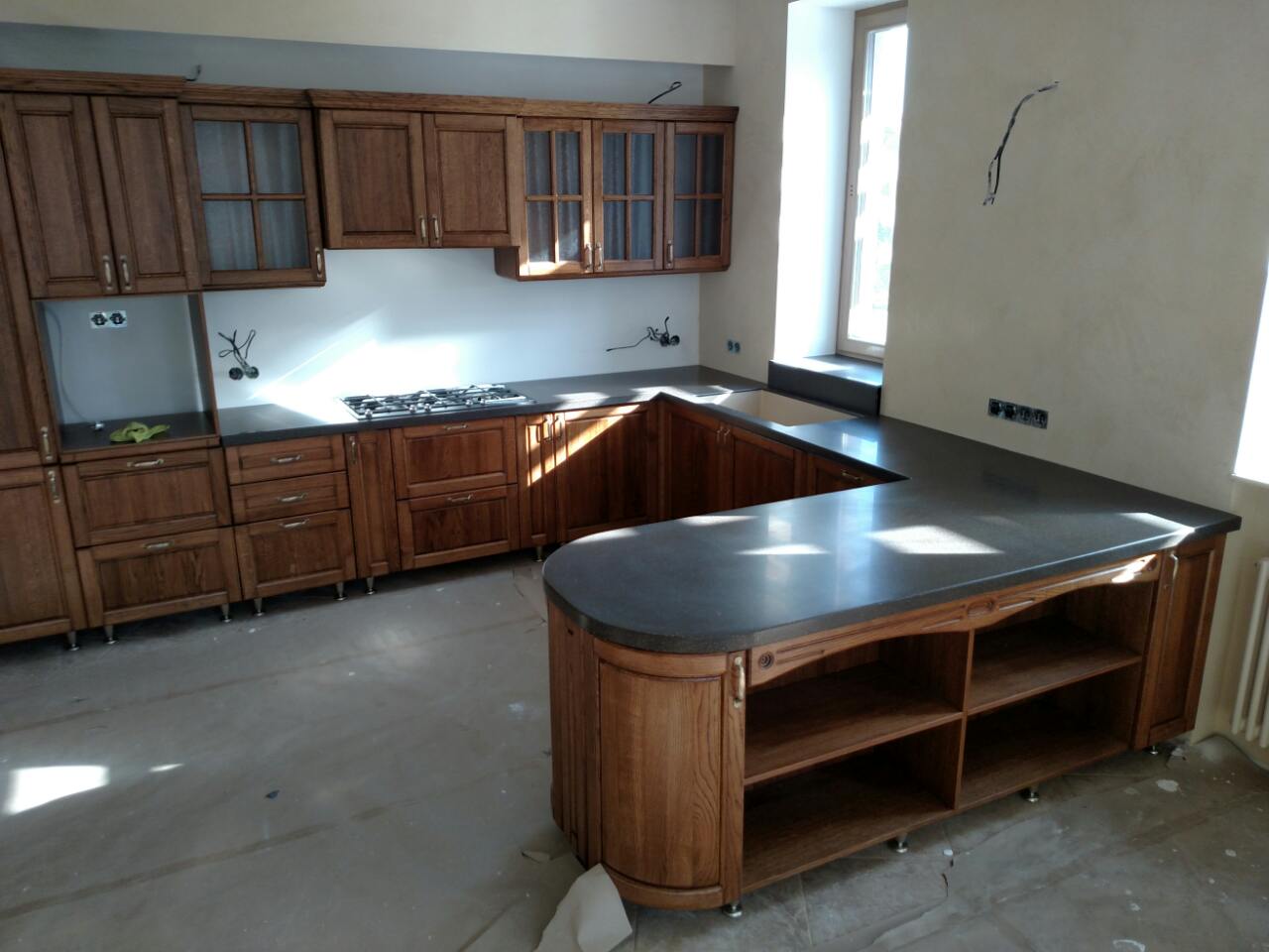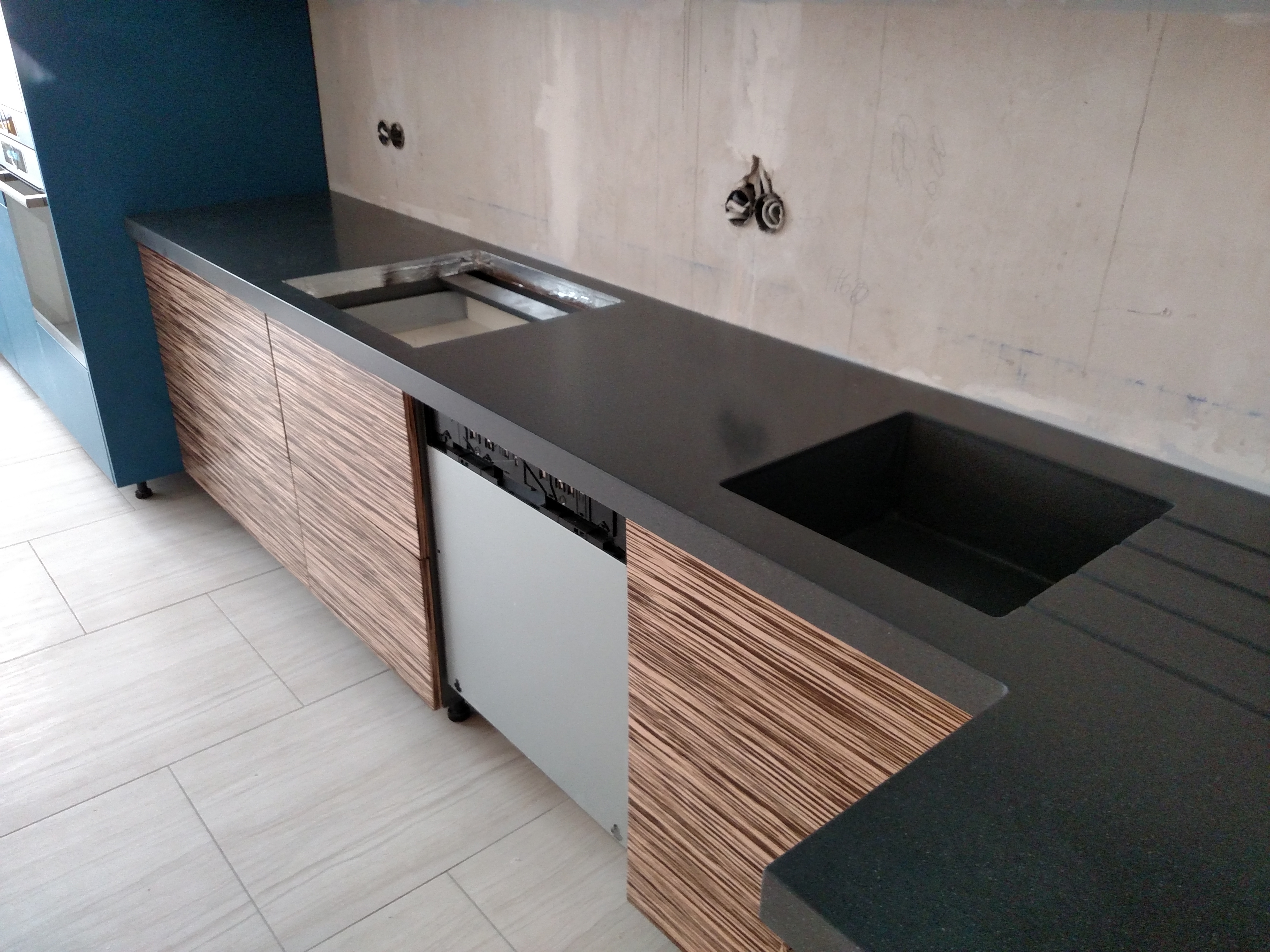 Приклад на фото. Розмір стільниці зі штучного каменю: 1800x2500 мм. Глибина обох сторін: 600 мм. У вартість стільниці входить: внутрішній, зовнішній радіус і мийка. Ціна даної стільниці зі штучного каменю 1450$.