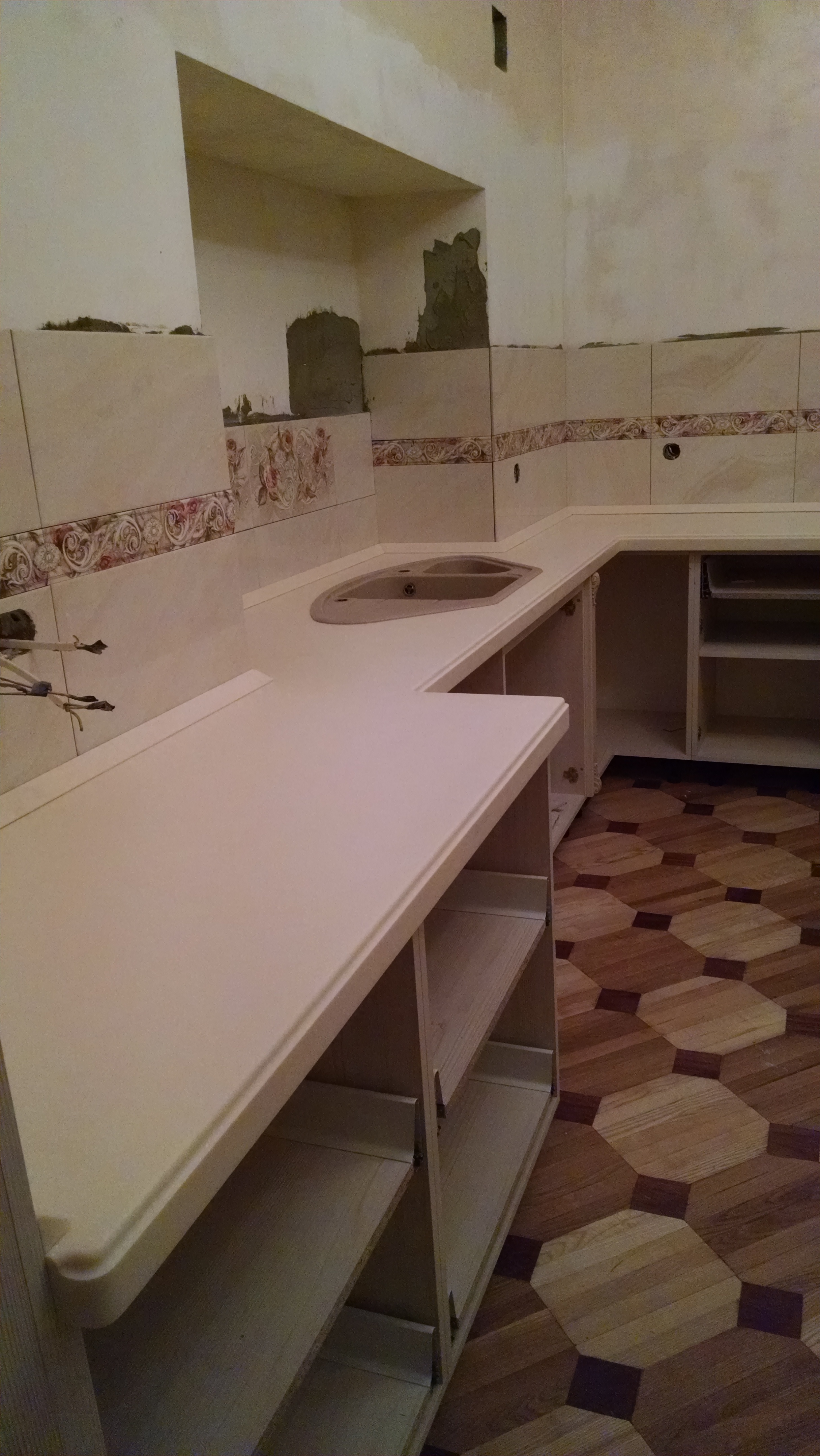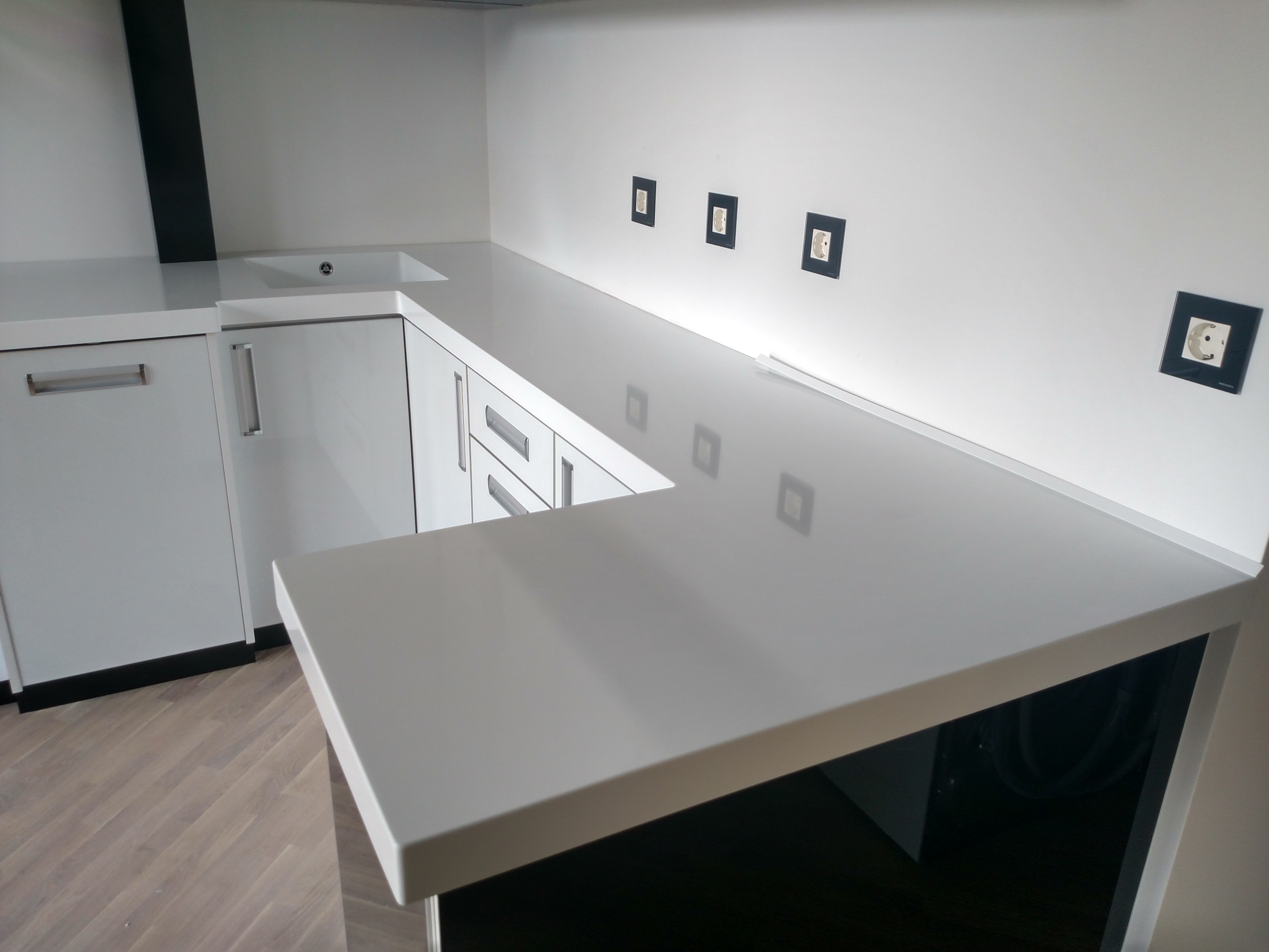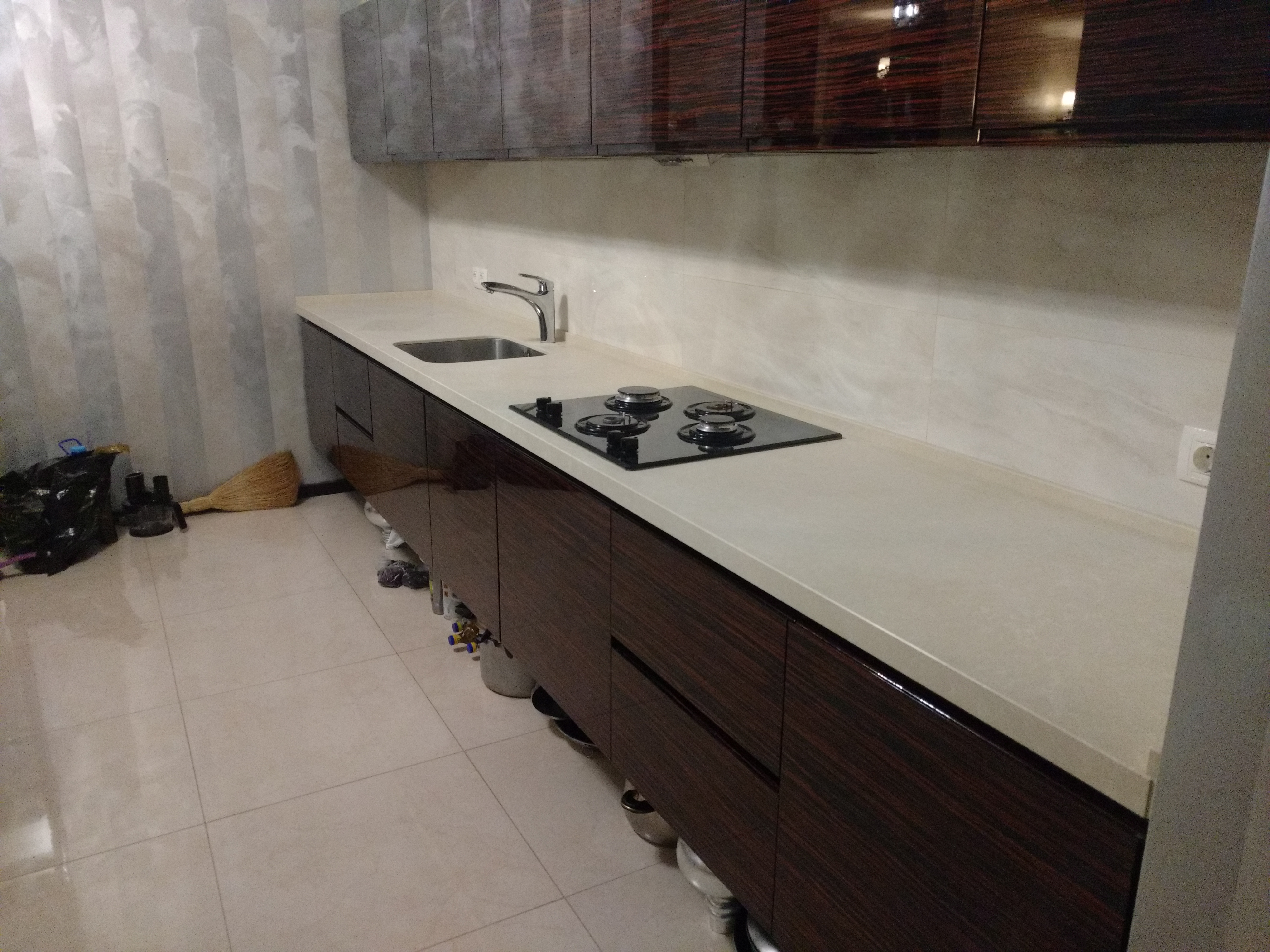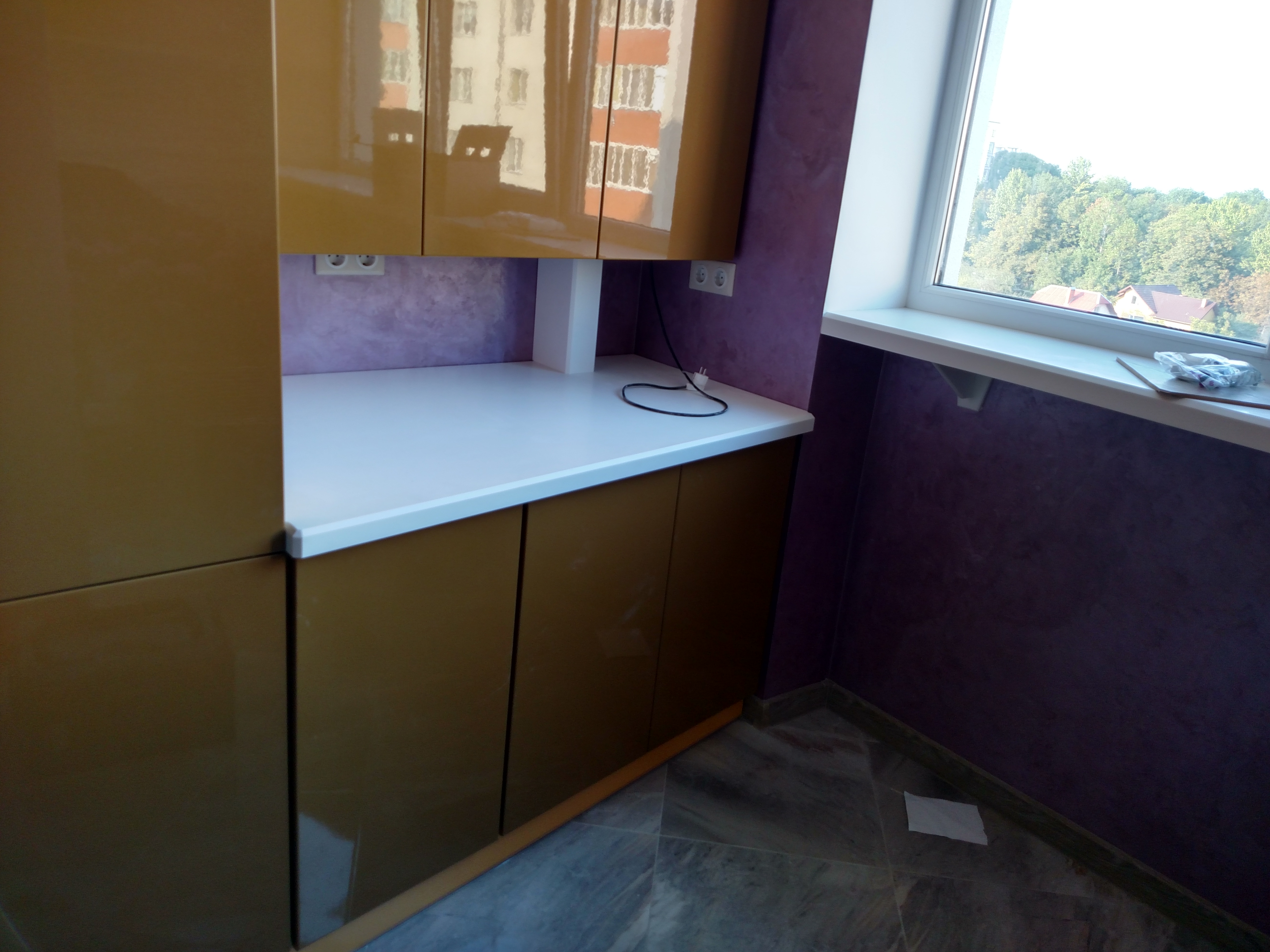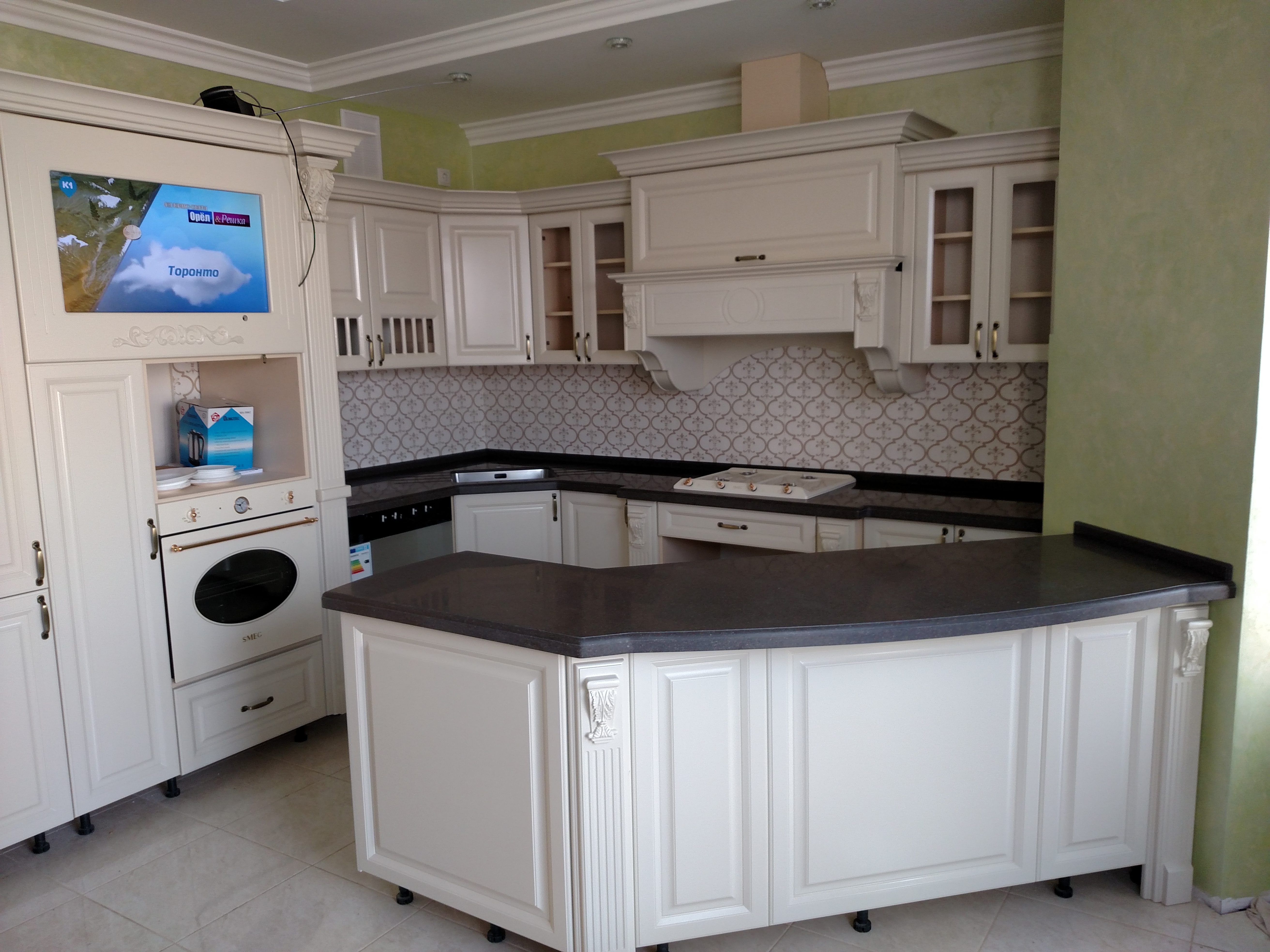 Приклад на фото. Розмір стільниці зі штучного каменю: 1800x2500 мм. Глибина обох сторін: 600 мм. У вартість стільниці входить: внутрішній, зовнішній радіус і мийка. Ціна даної стільниці зі штучного каменю 1450$.