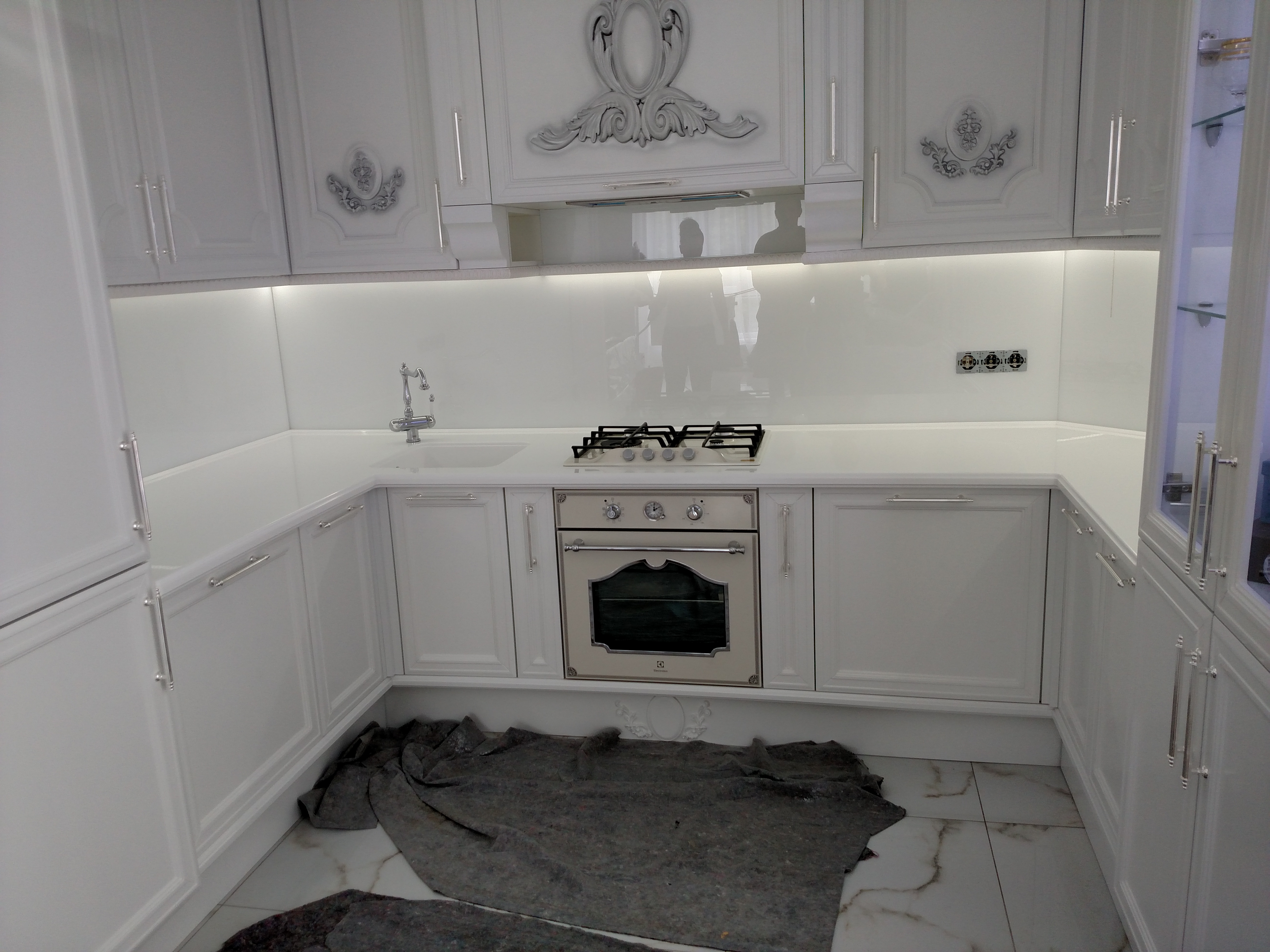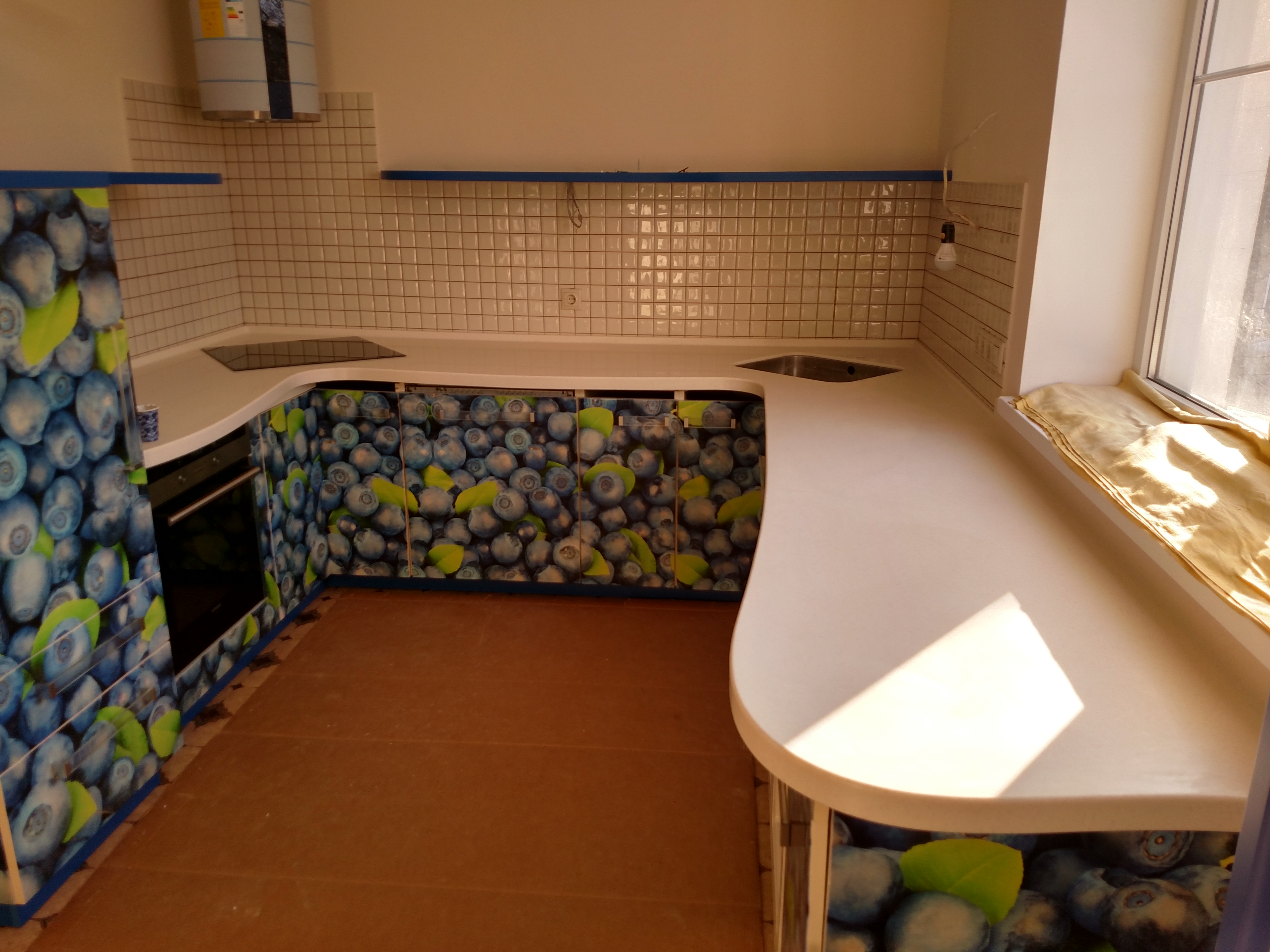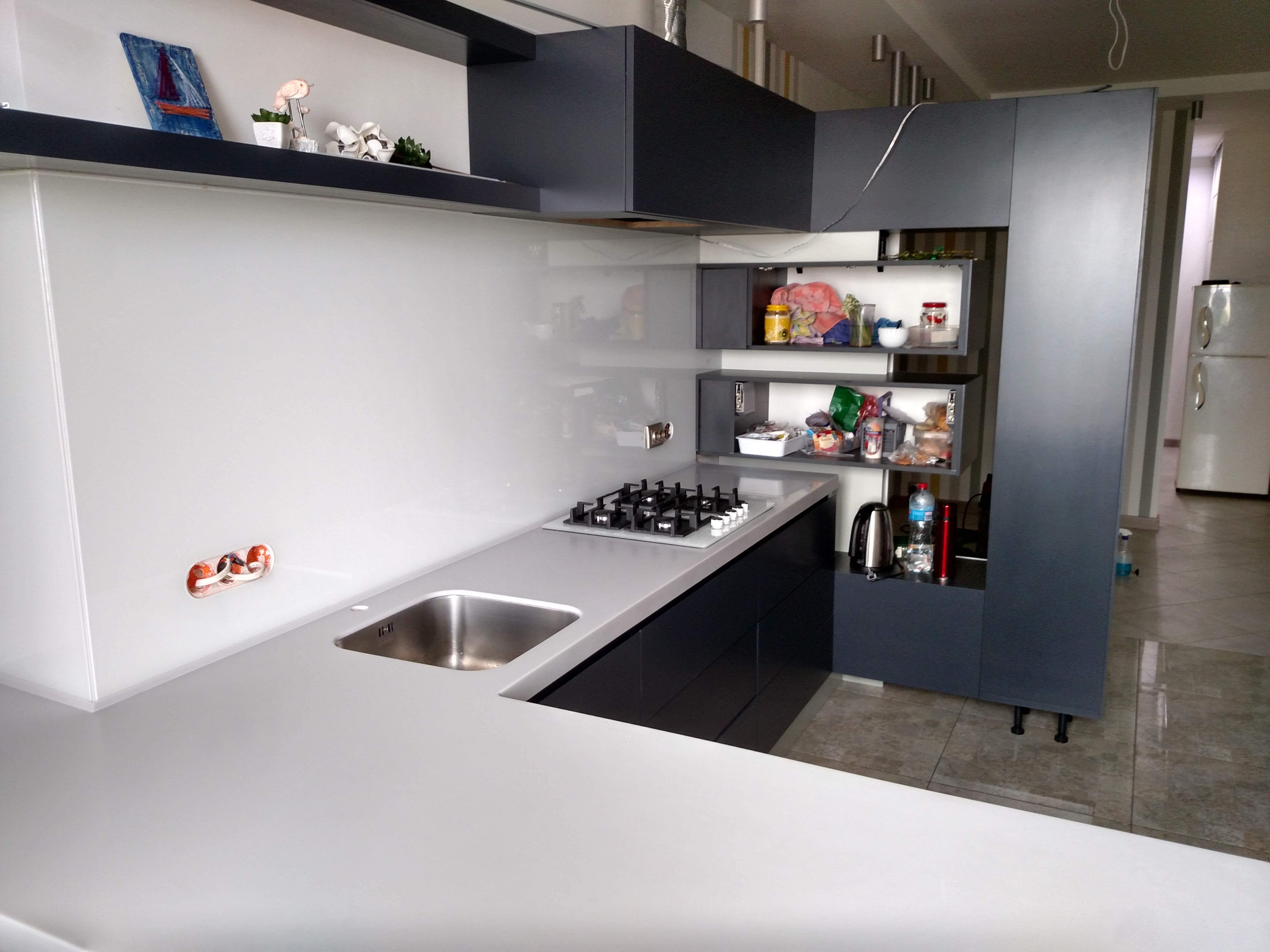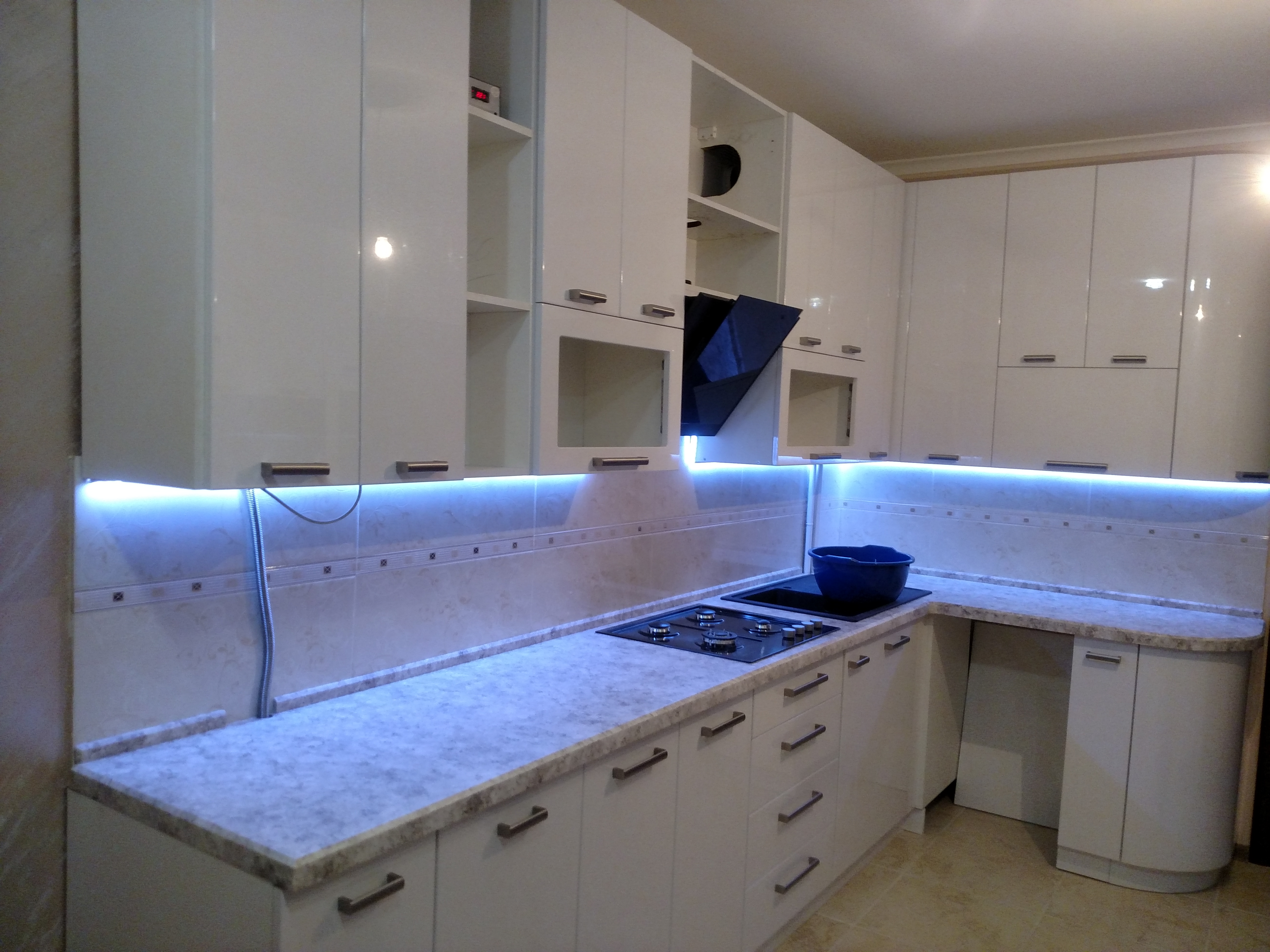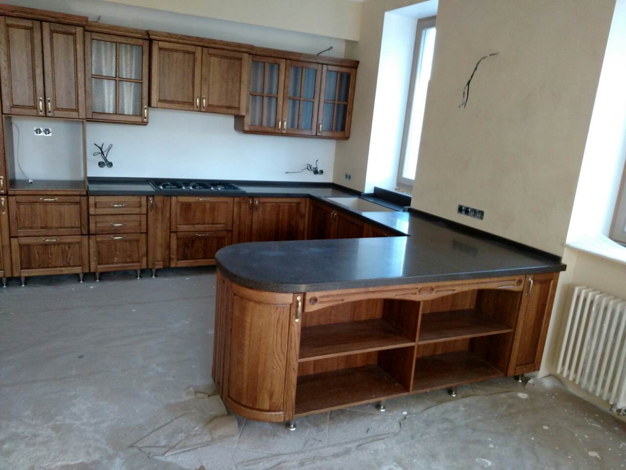 Приклад на фото. Розмір стільниці зі штучного каменю: 1800x2500 мм. Глибина обох сторін: 600 мм. У вартість стільниці входить: внутрішній, зовнішній радіус і мийка. Ціна даної стільниці зі штучного каменю 1450$.