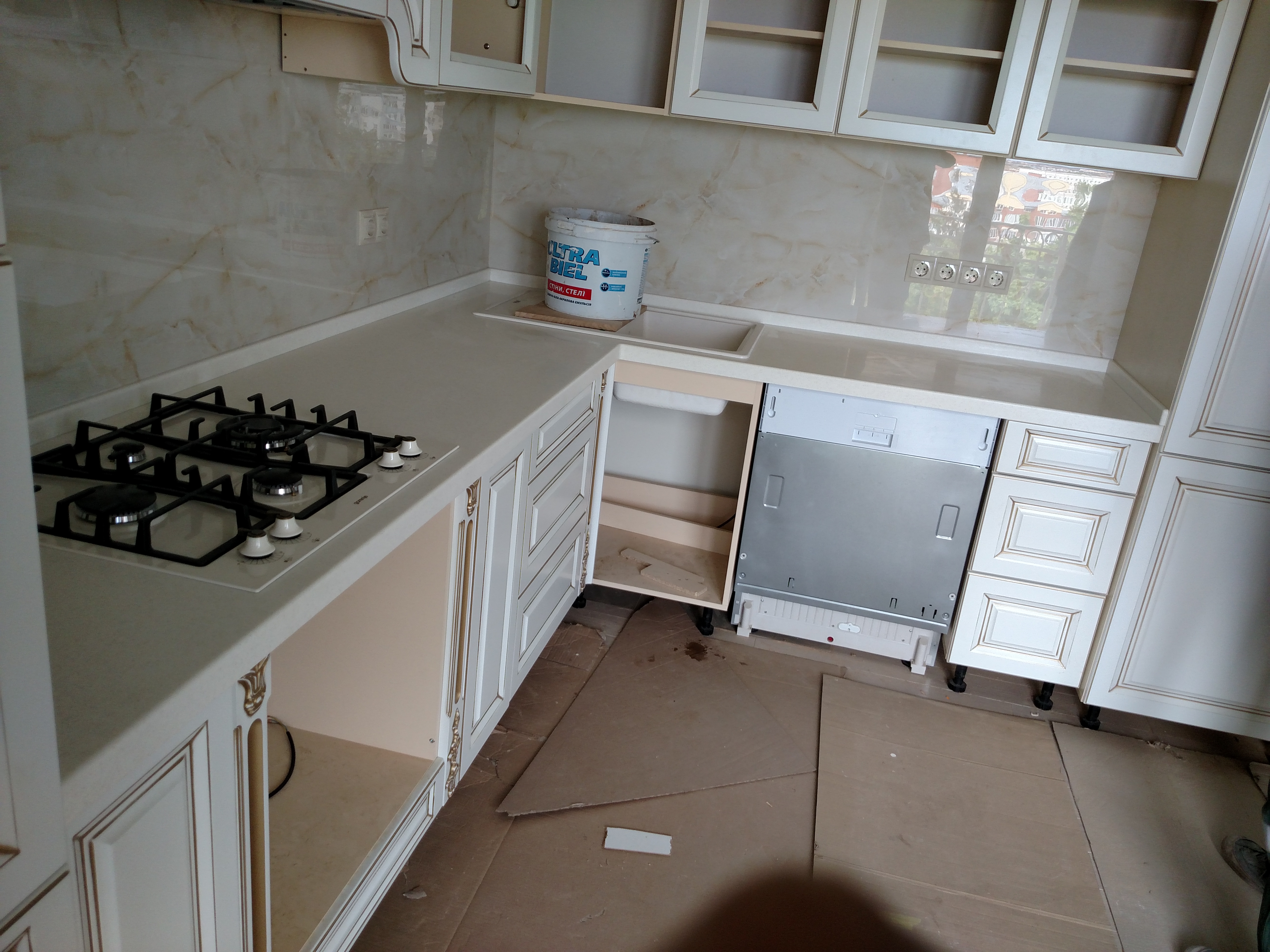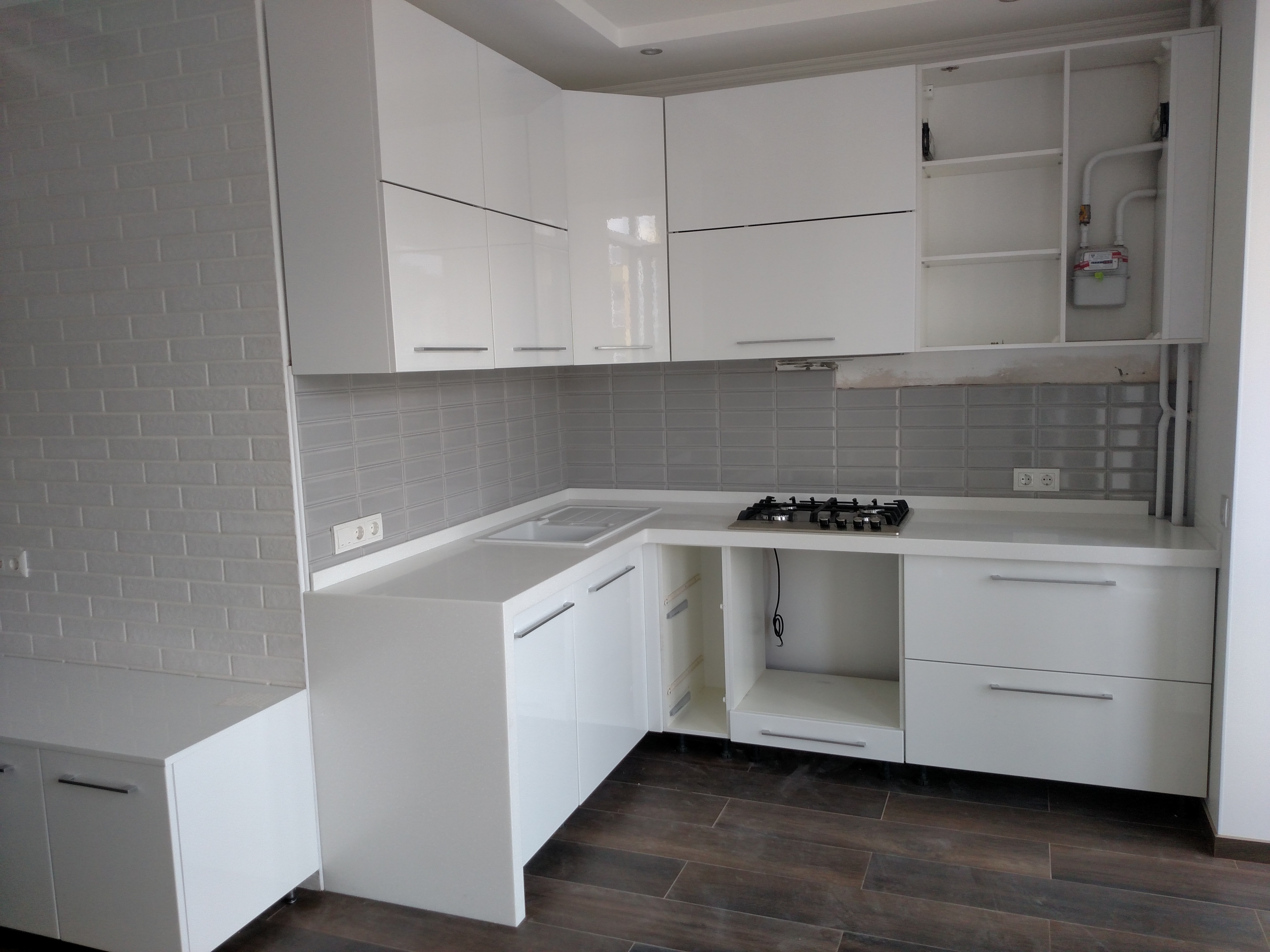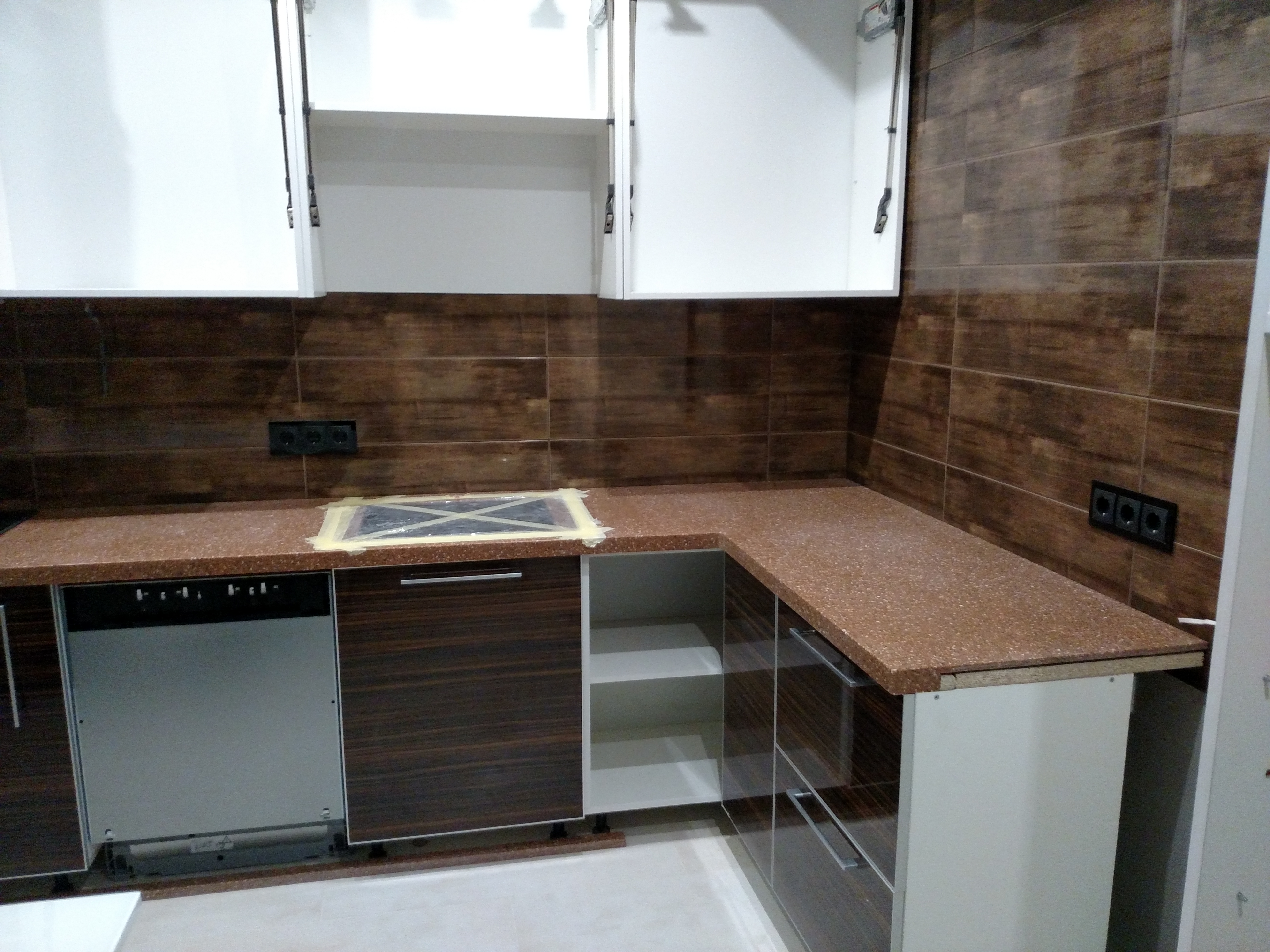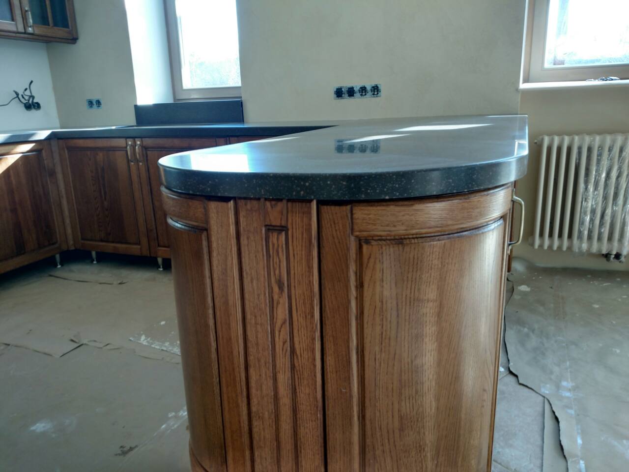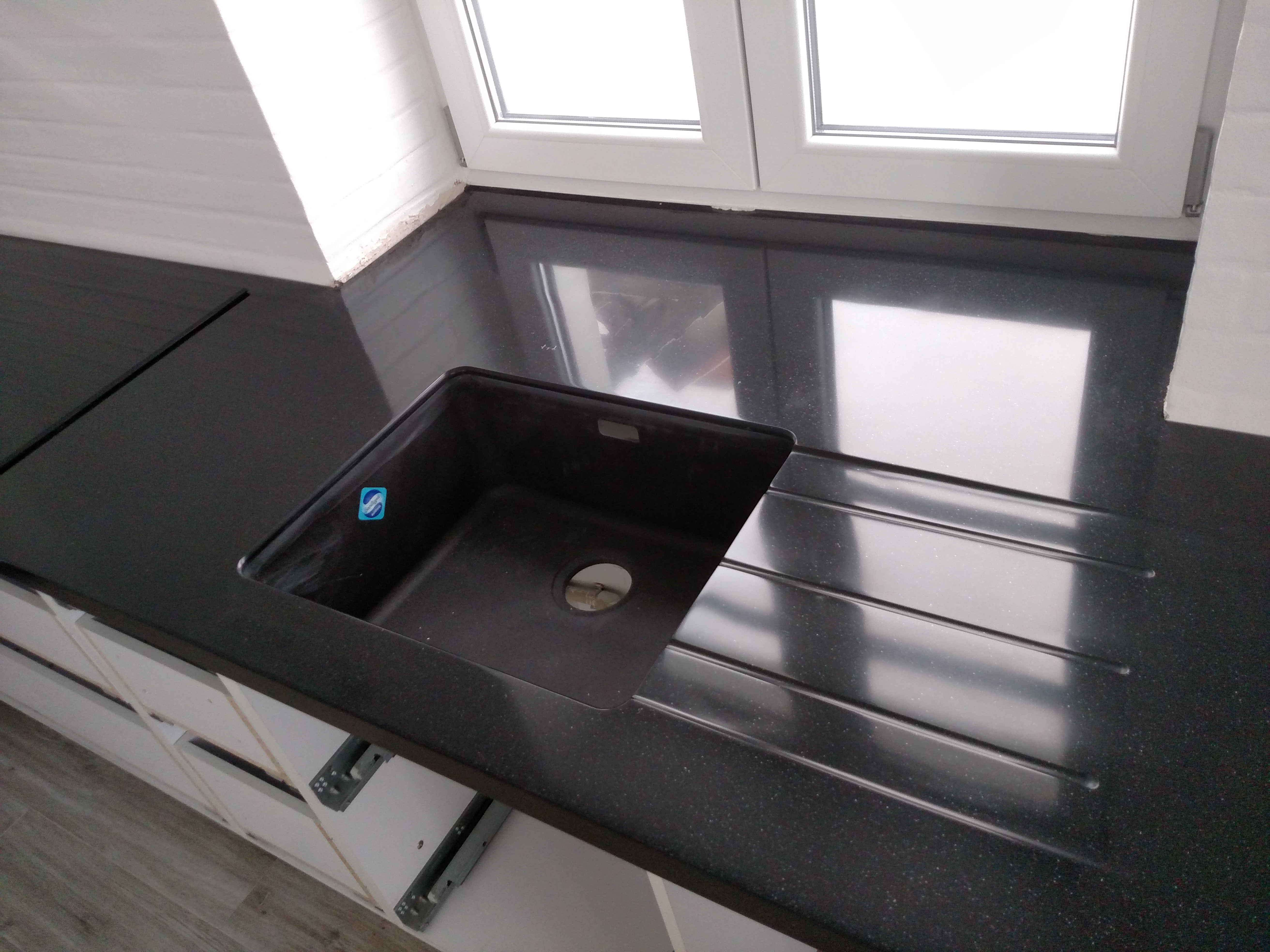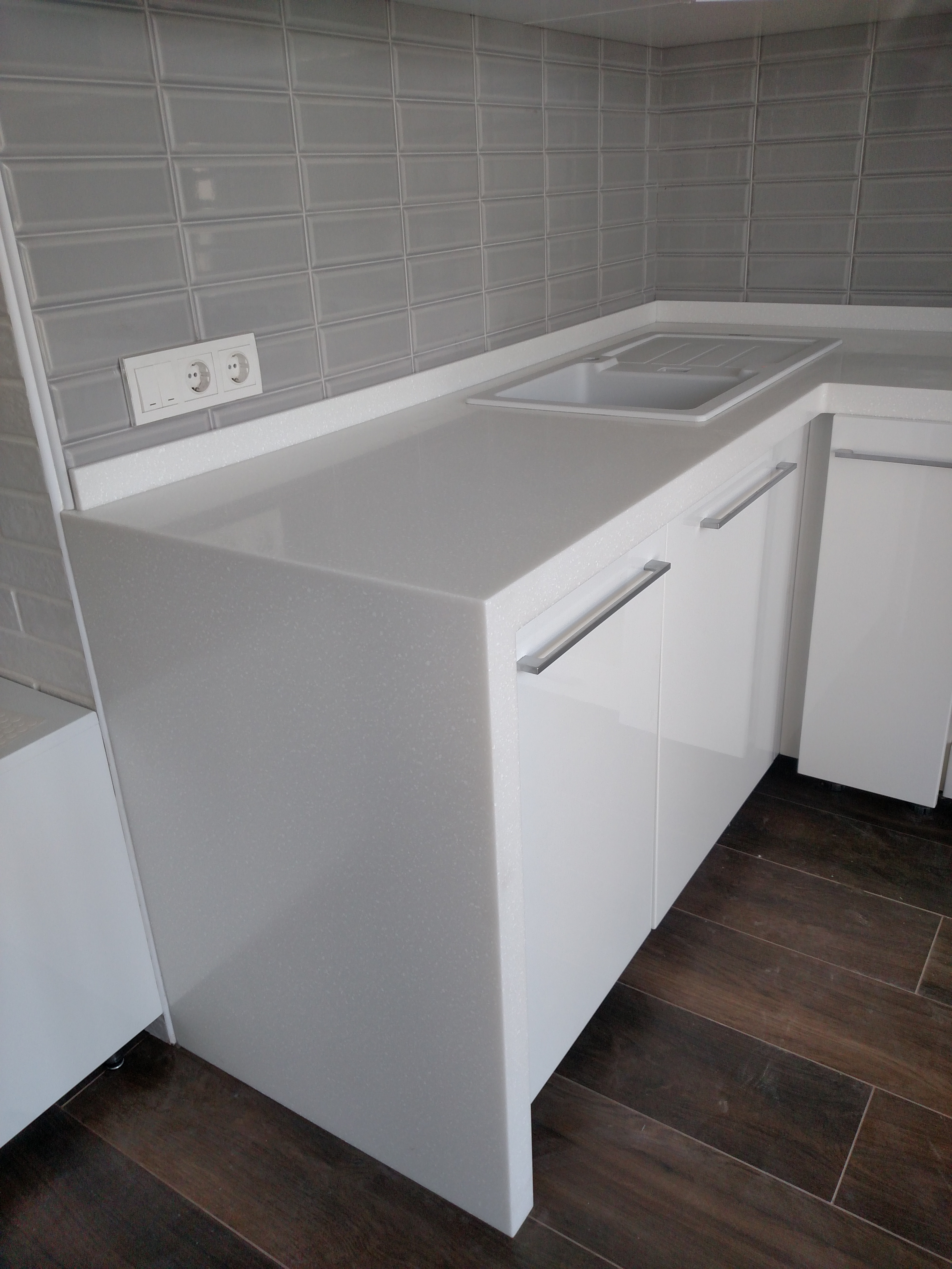 Приклад на фото. Розмір стільниці зі штучного каменю: 1800x2500 мм. Глибина обох сторін: 600 мм. У вартість стільниці входить: внутрішній, зовнішній радіус і мийка. Ціна даної стільниці зі штучного каменю 1450$.