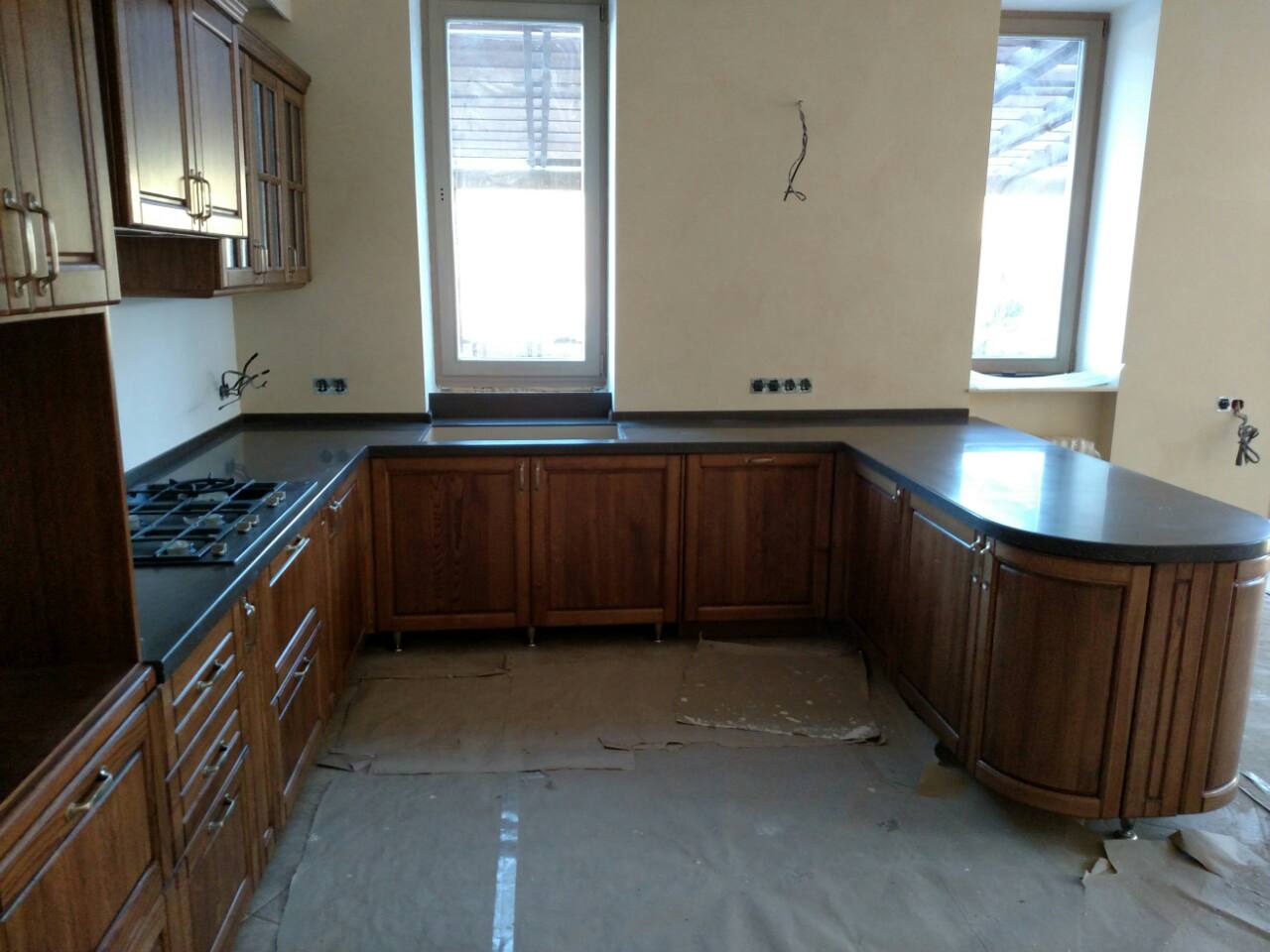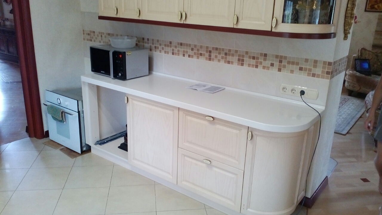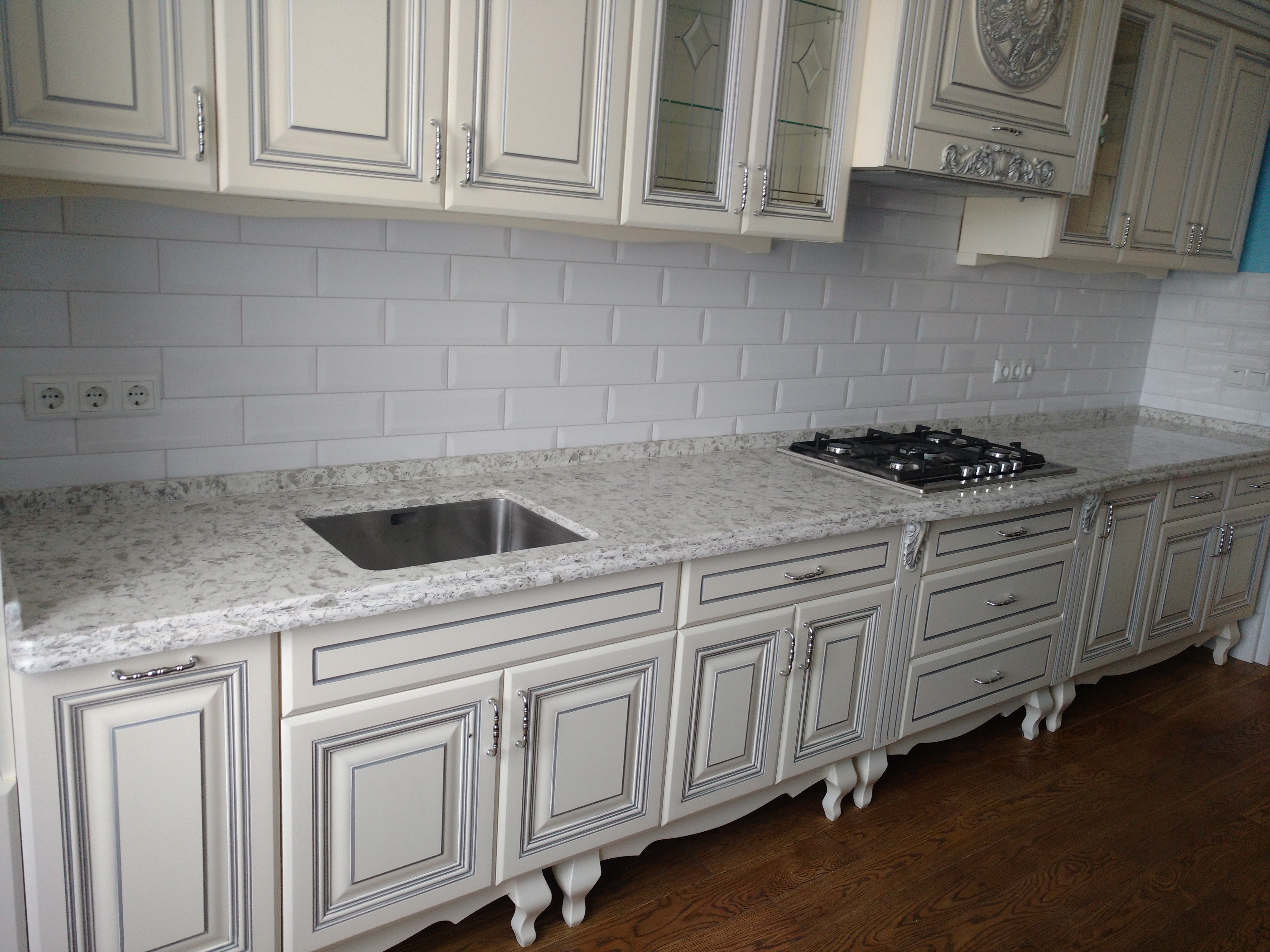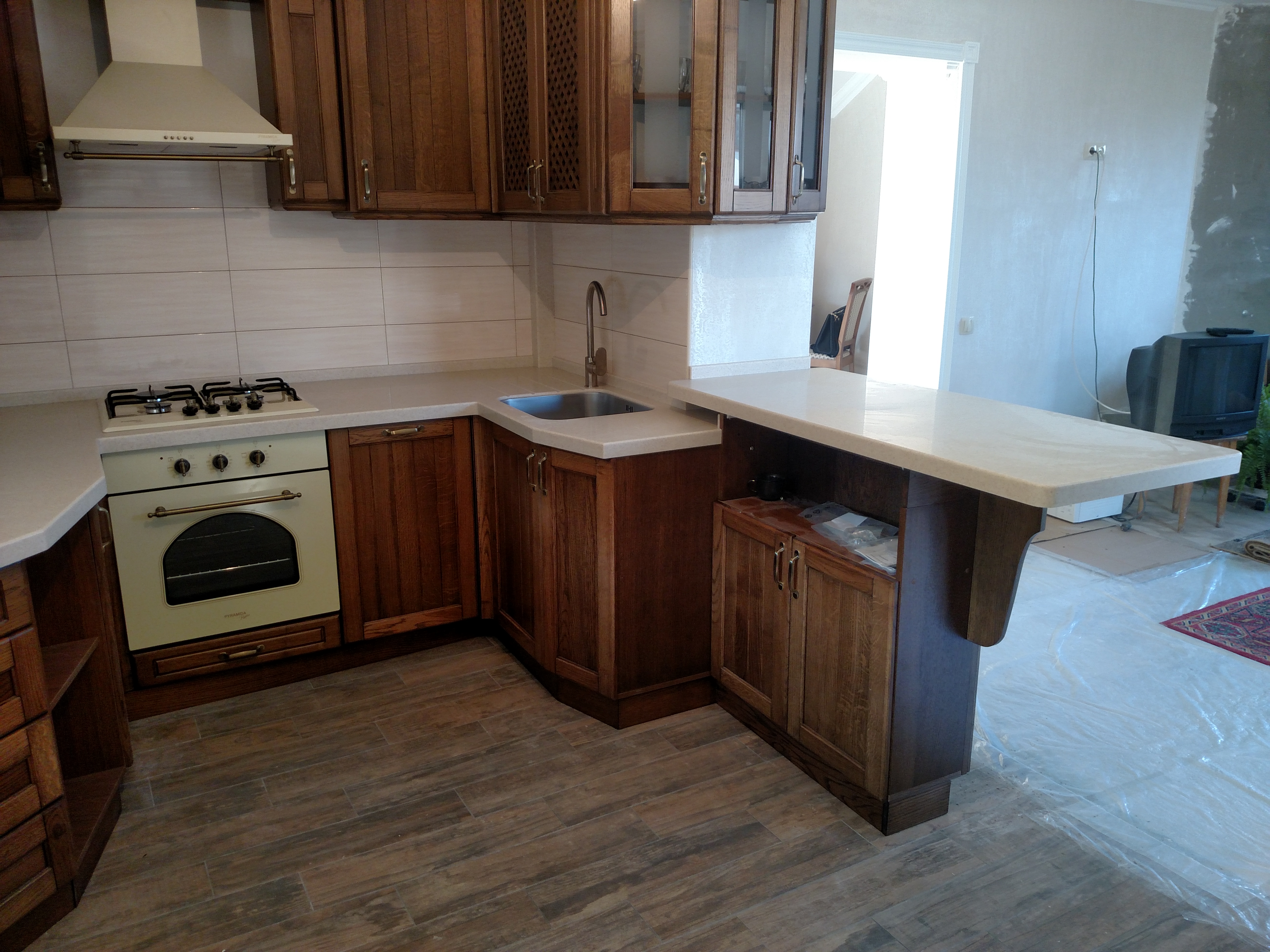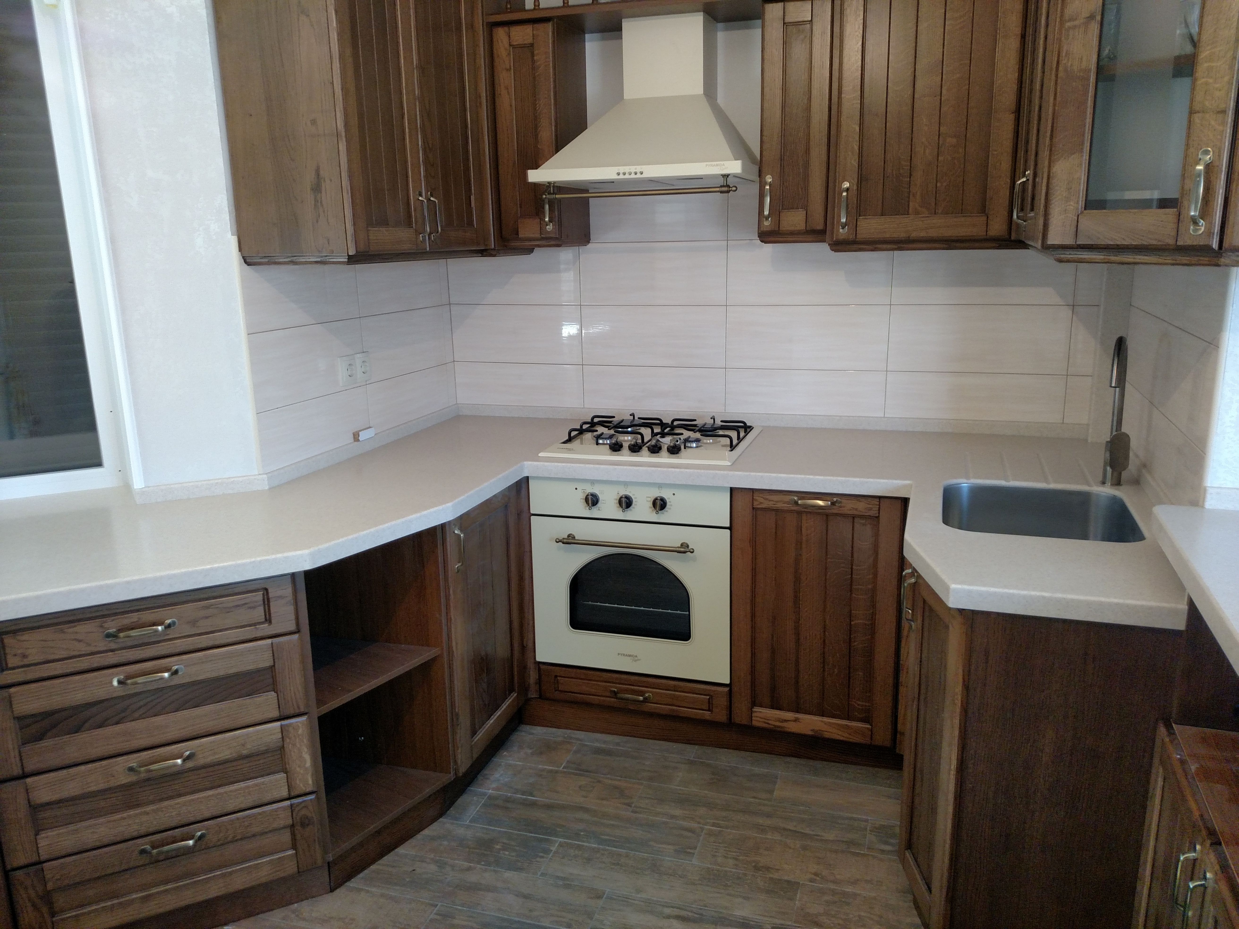 Приклад на фото. Розмір стільниці зі штучного каменю: 1800x2500 мм. Глибина обох сторін: 600 мм. У вартість стільниці входить: внутрішній, зовнішній радіус і мийка. Ціна даної стільниці зі штучного каменю 1450$.