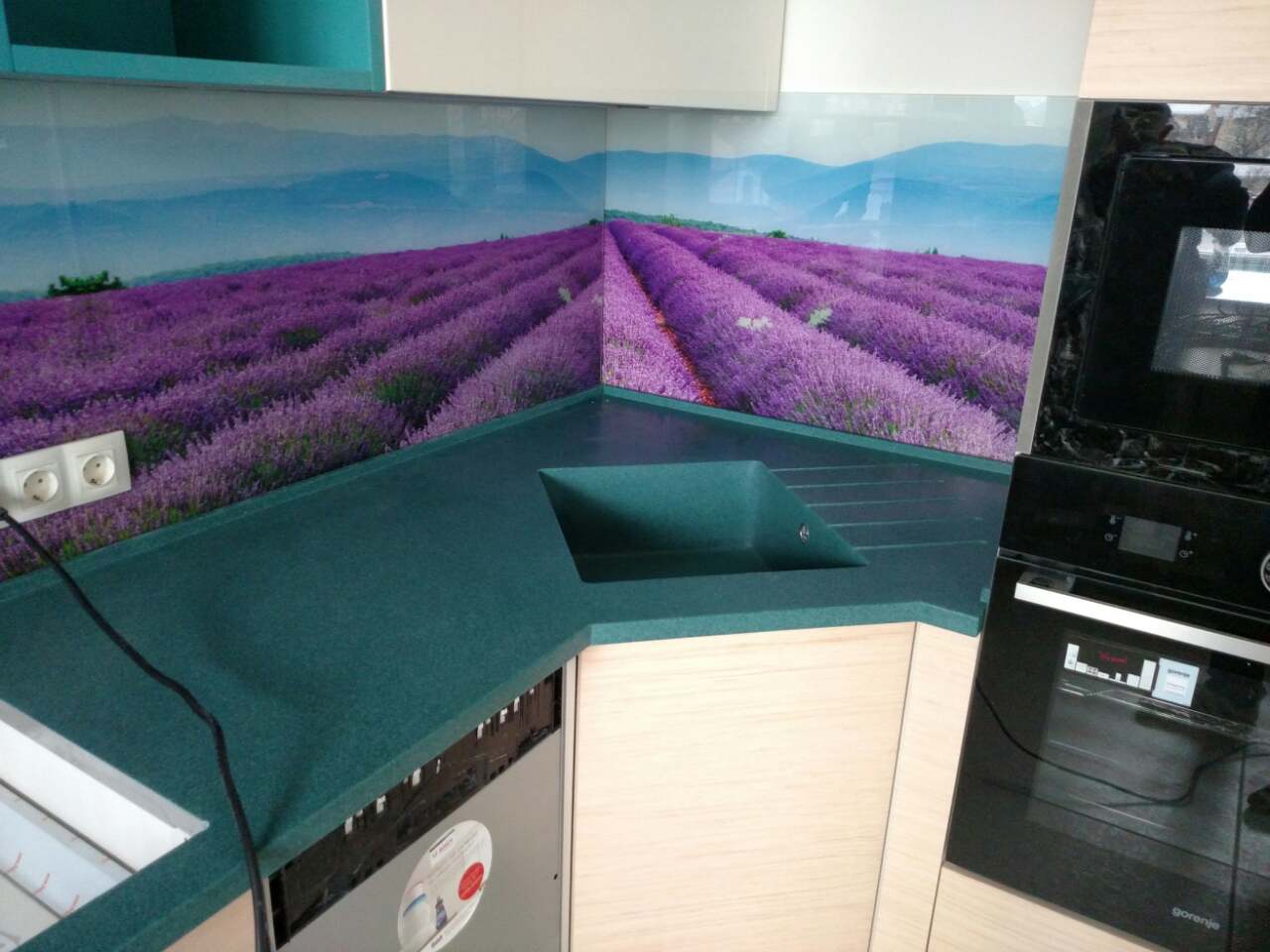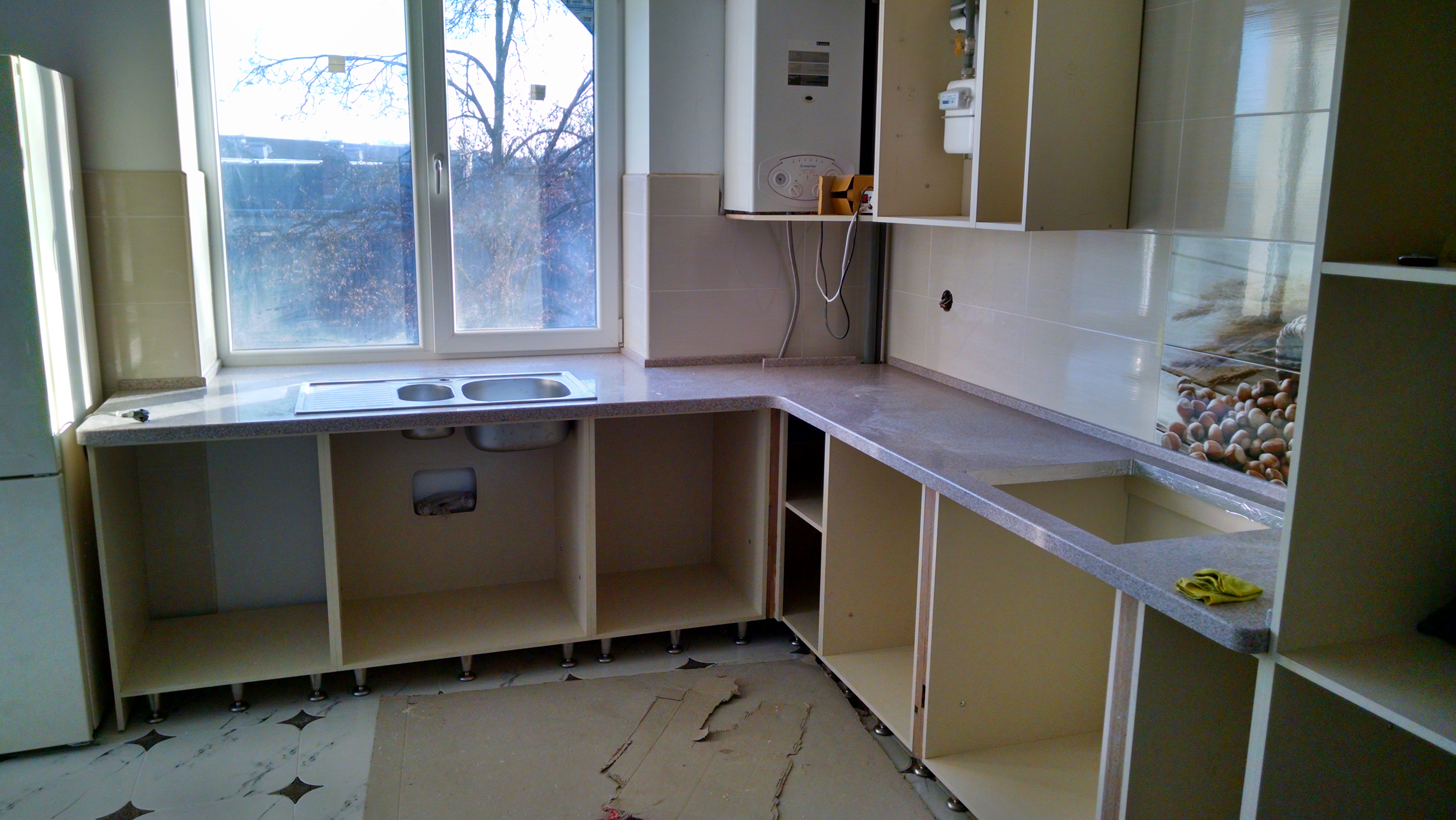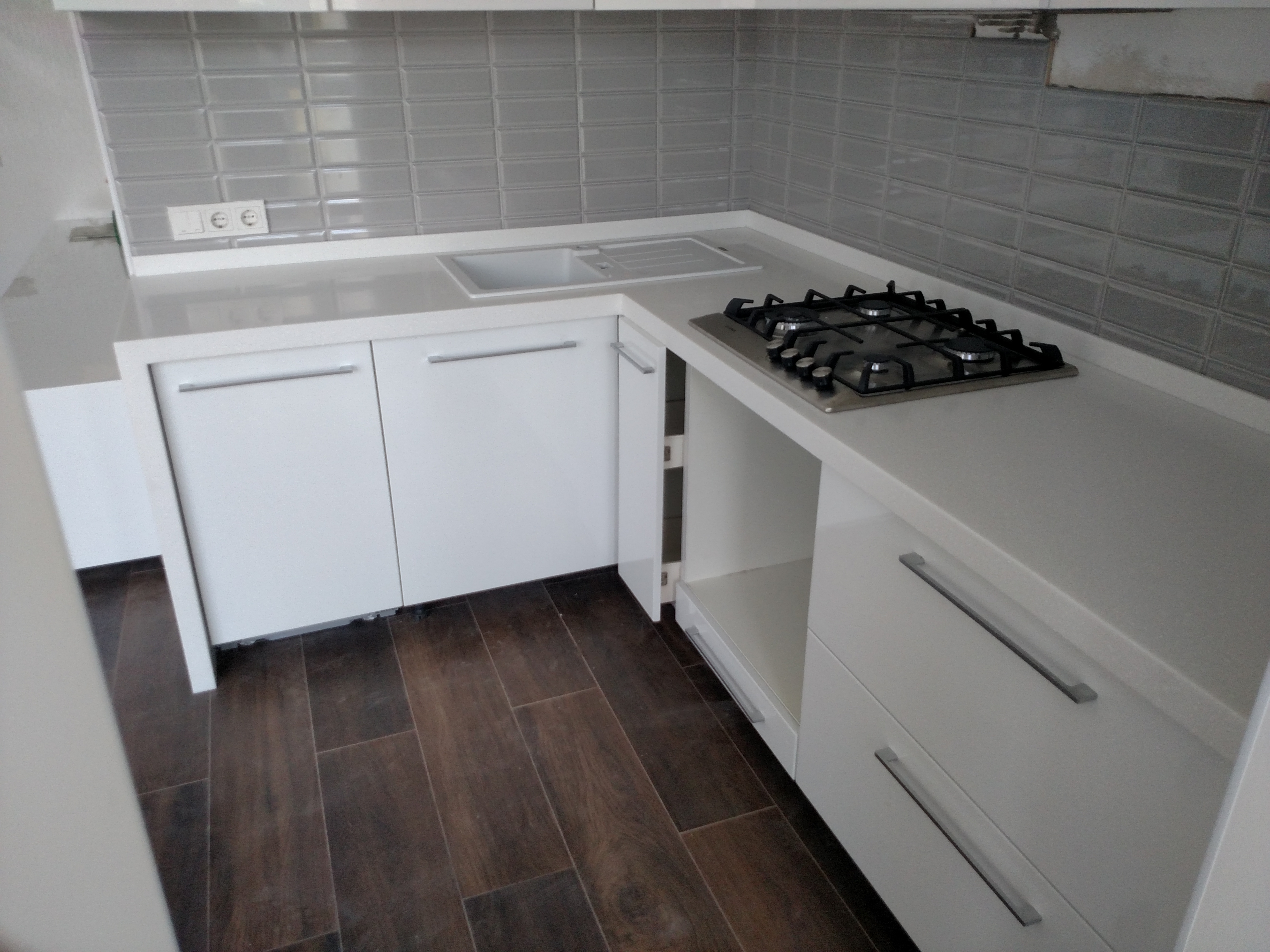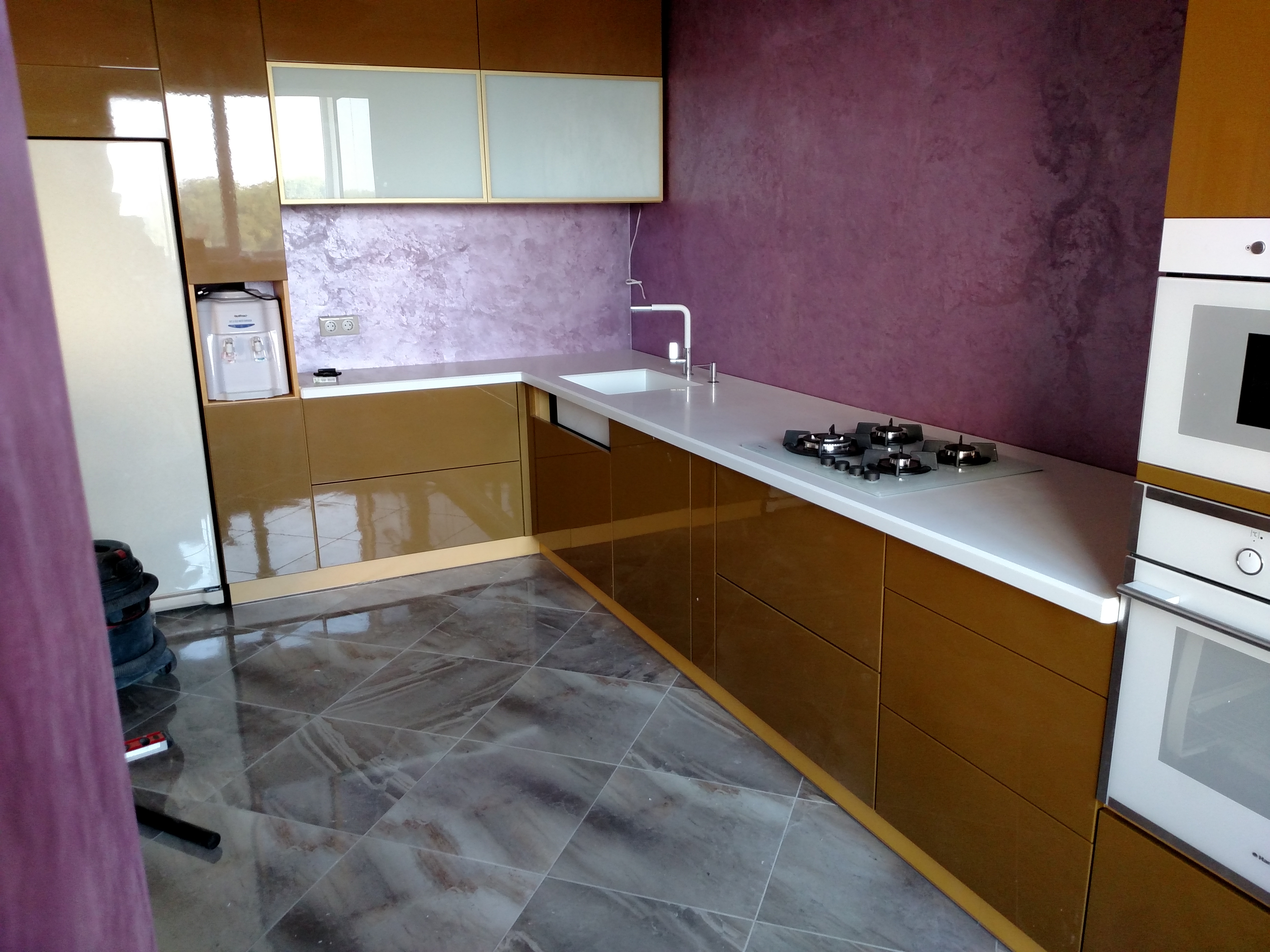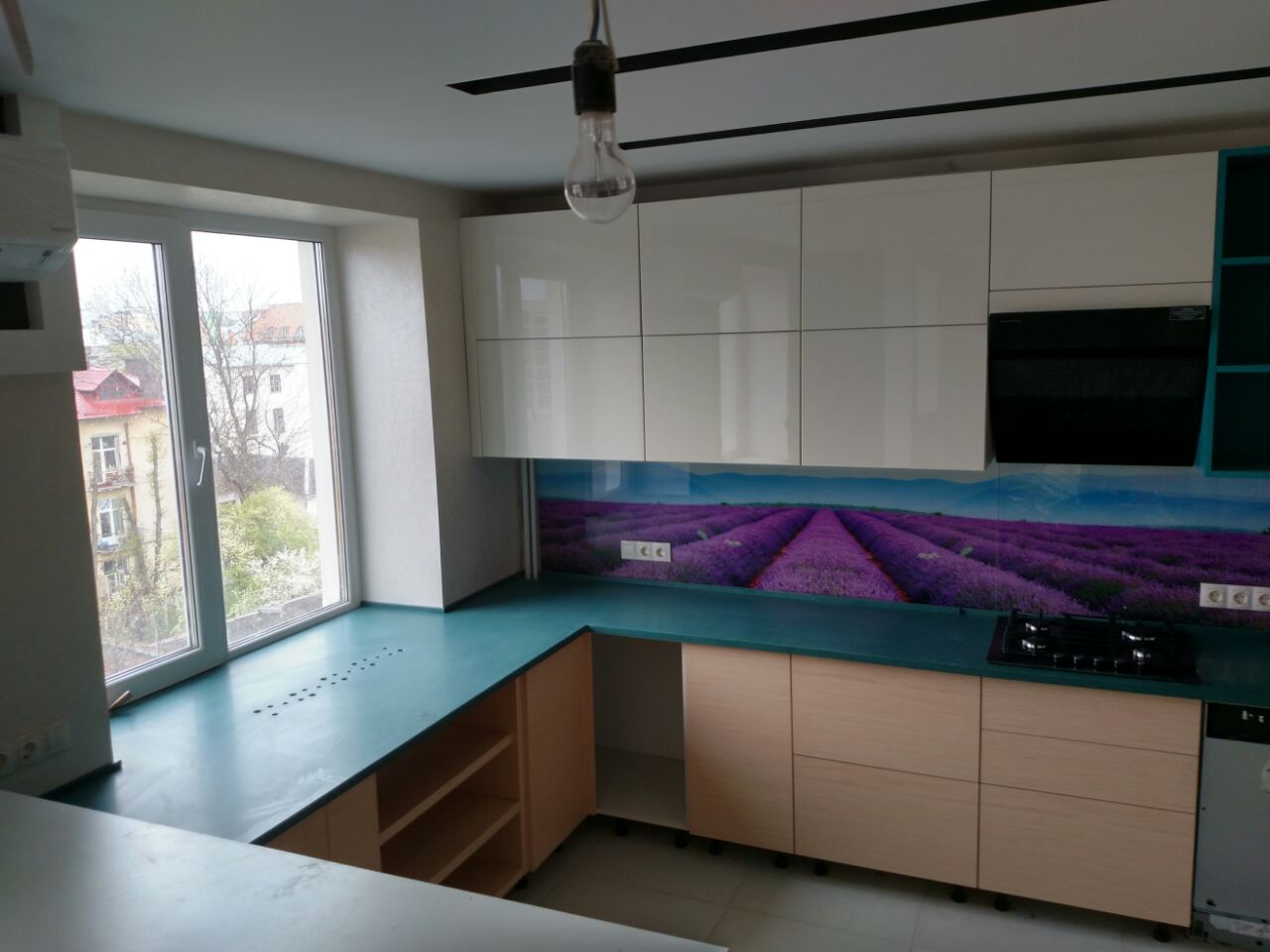 Приклад на фото. Розмір стільниці зі штучного каменю: 1800x2500 мм. Глибина обох сторін: 600 мм. У вартість стільниці входить: внутрішній, зовнішній радіус і мийка. Ціна даної стільниці зі штучного каменю 1450$.