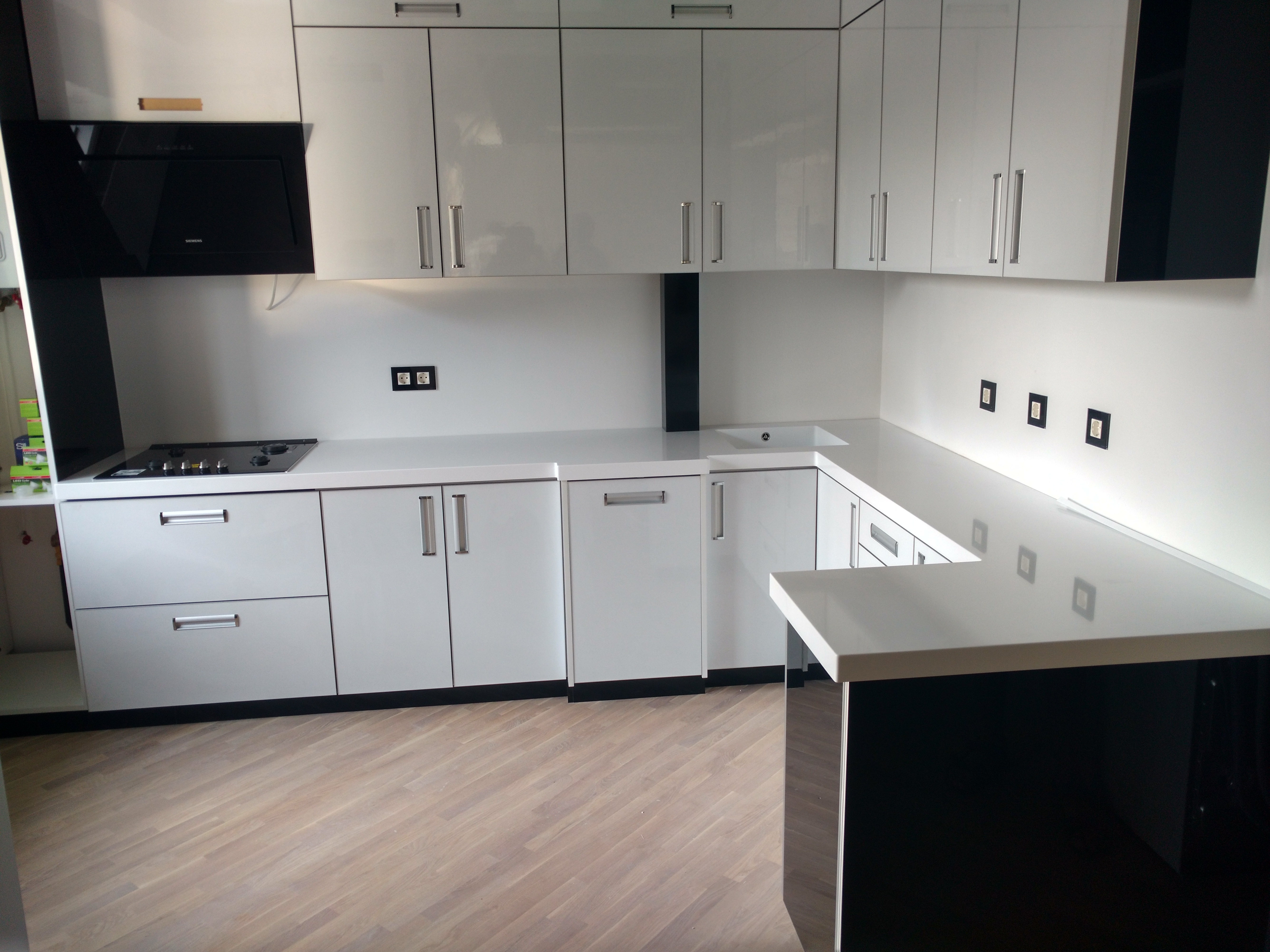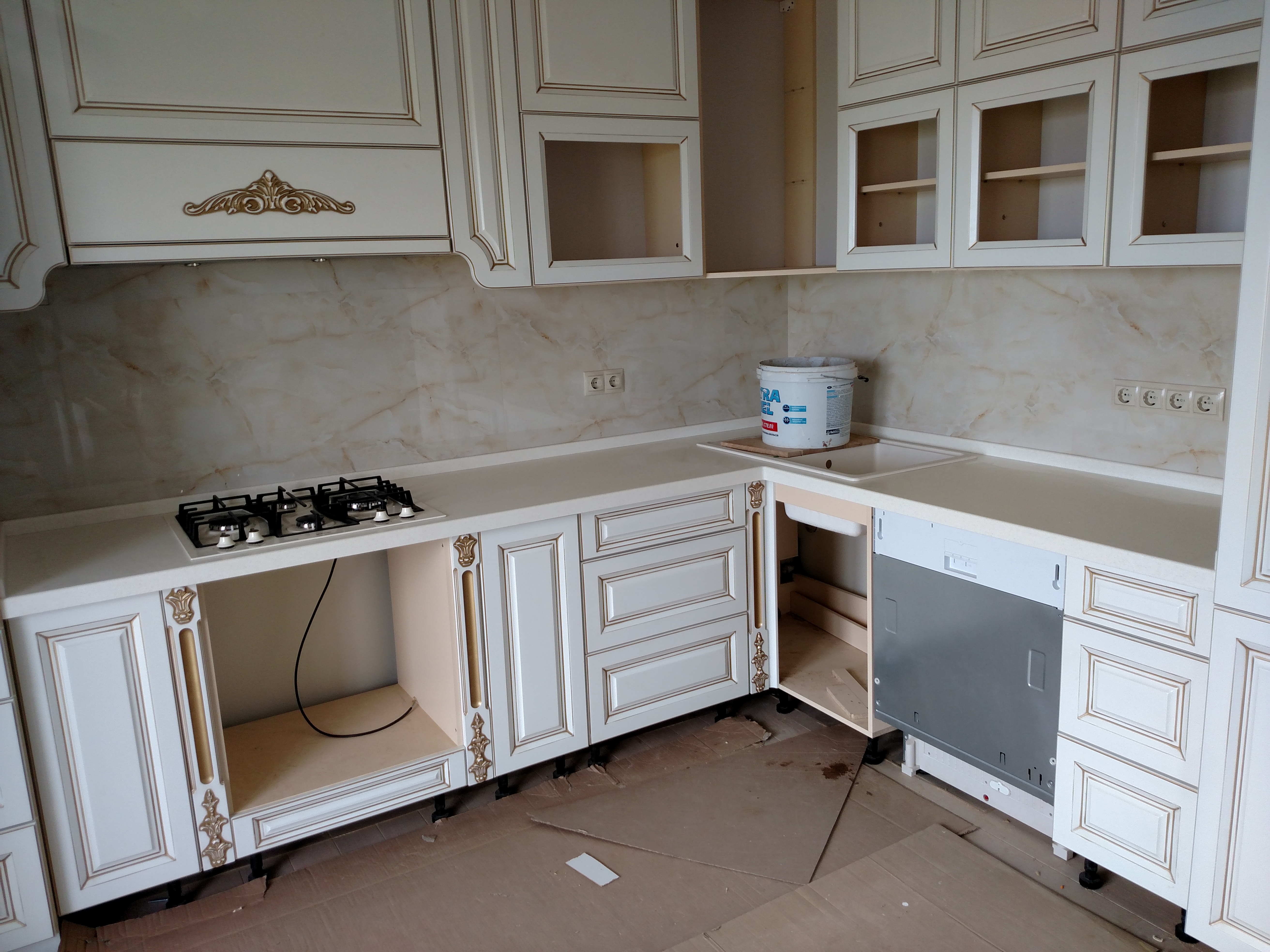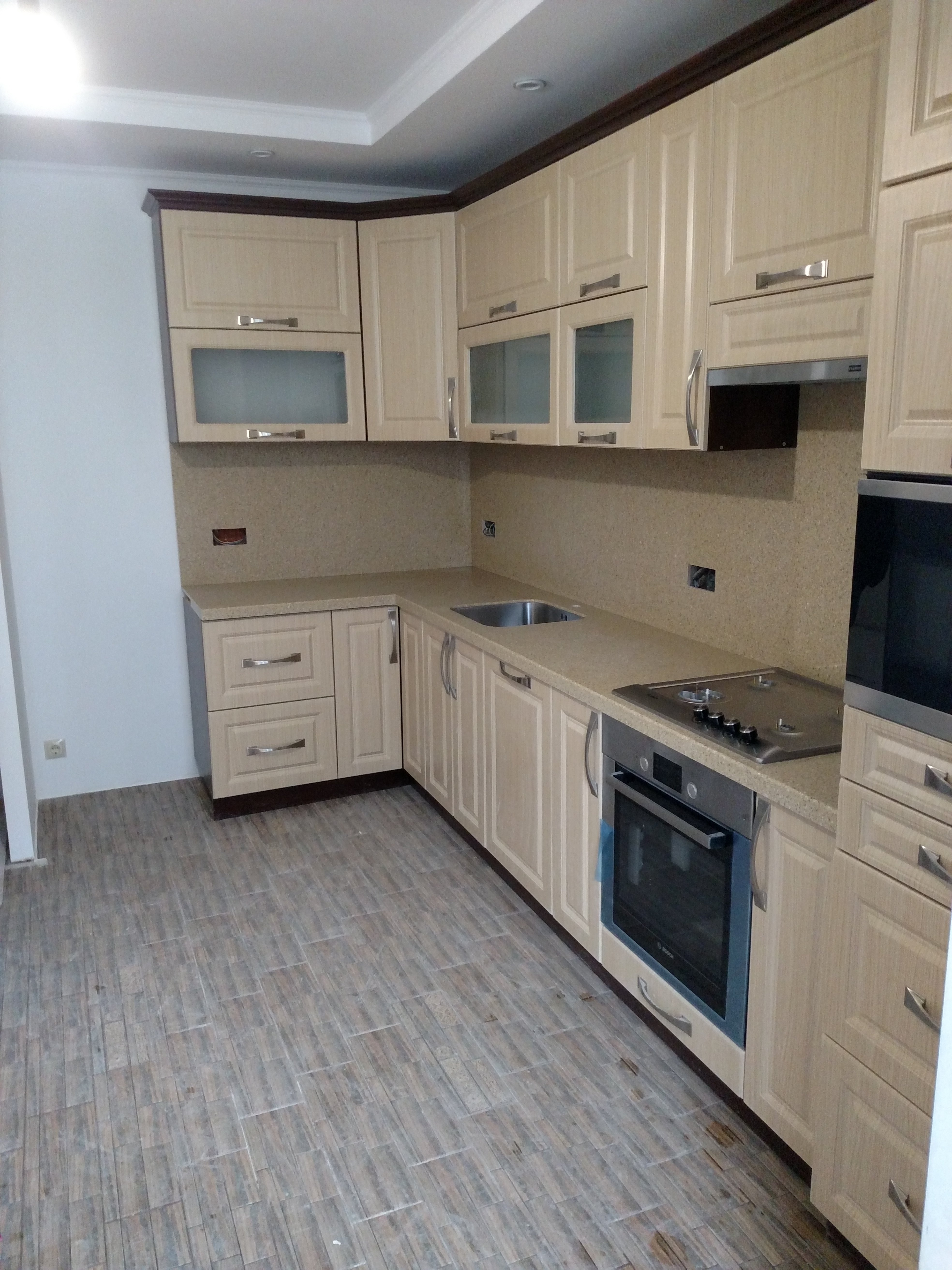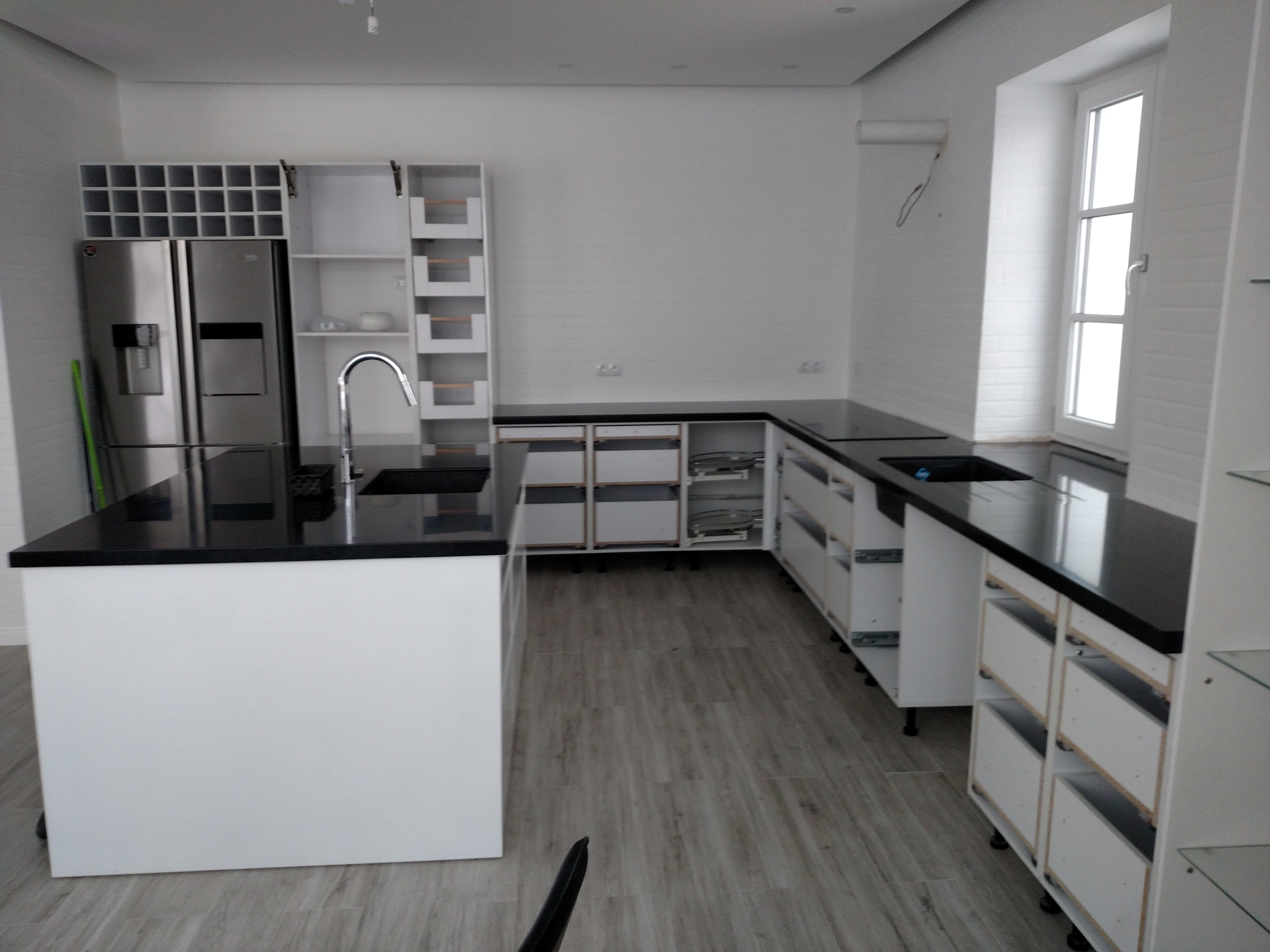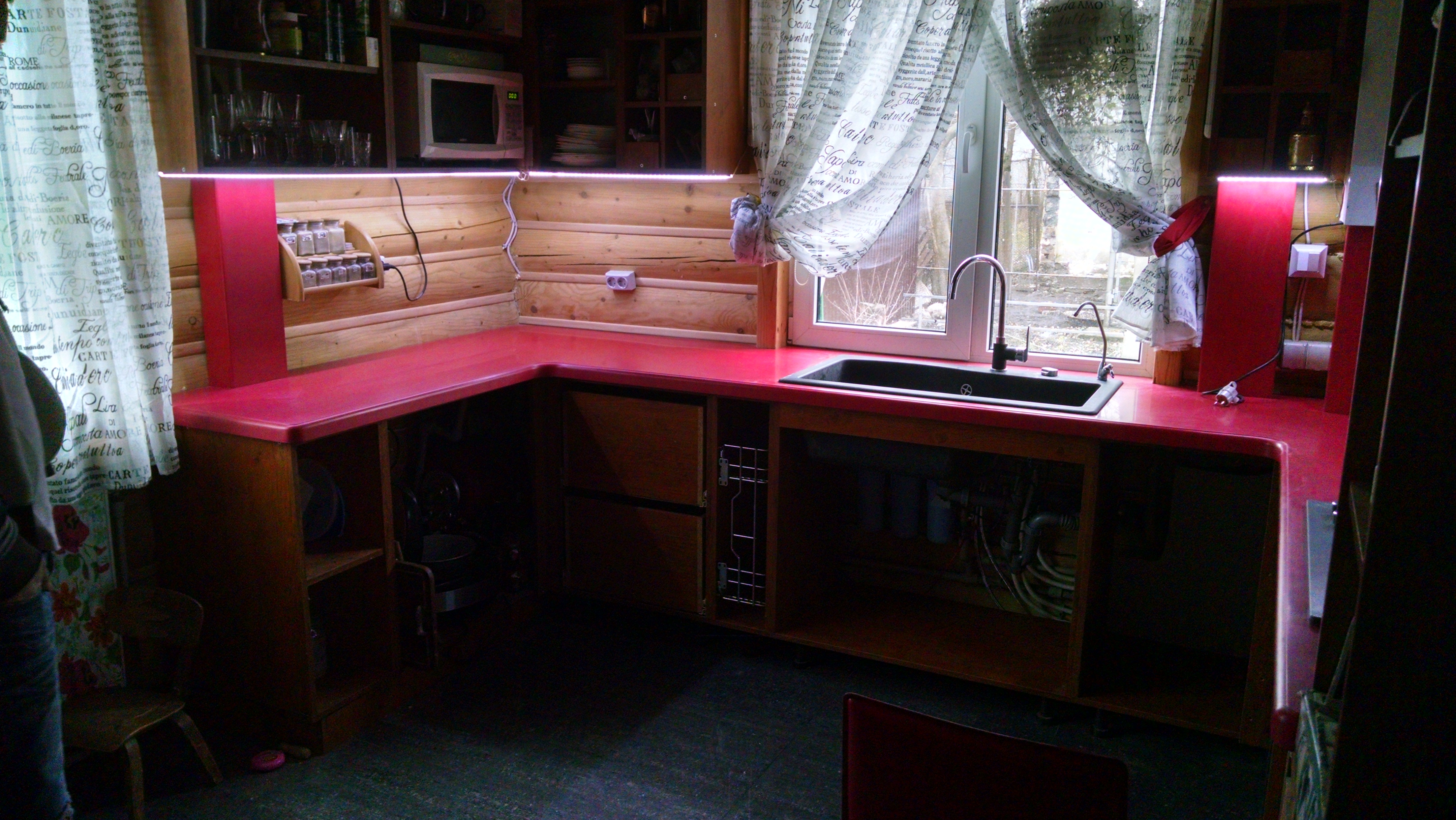 Приклад на фото. Розмір стільниці зі штучного каменю: 1800x2500 мм. Глибина обох сторін: 600 мм. У вартість стільниці входить: внутрішній, зовнішній радіус і мийка. Ціна даної стільниці зі штучного каменю 1450$.