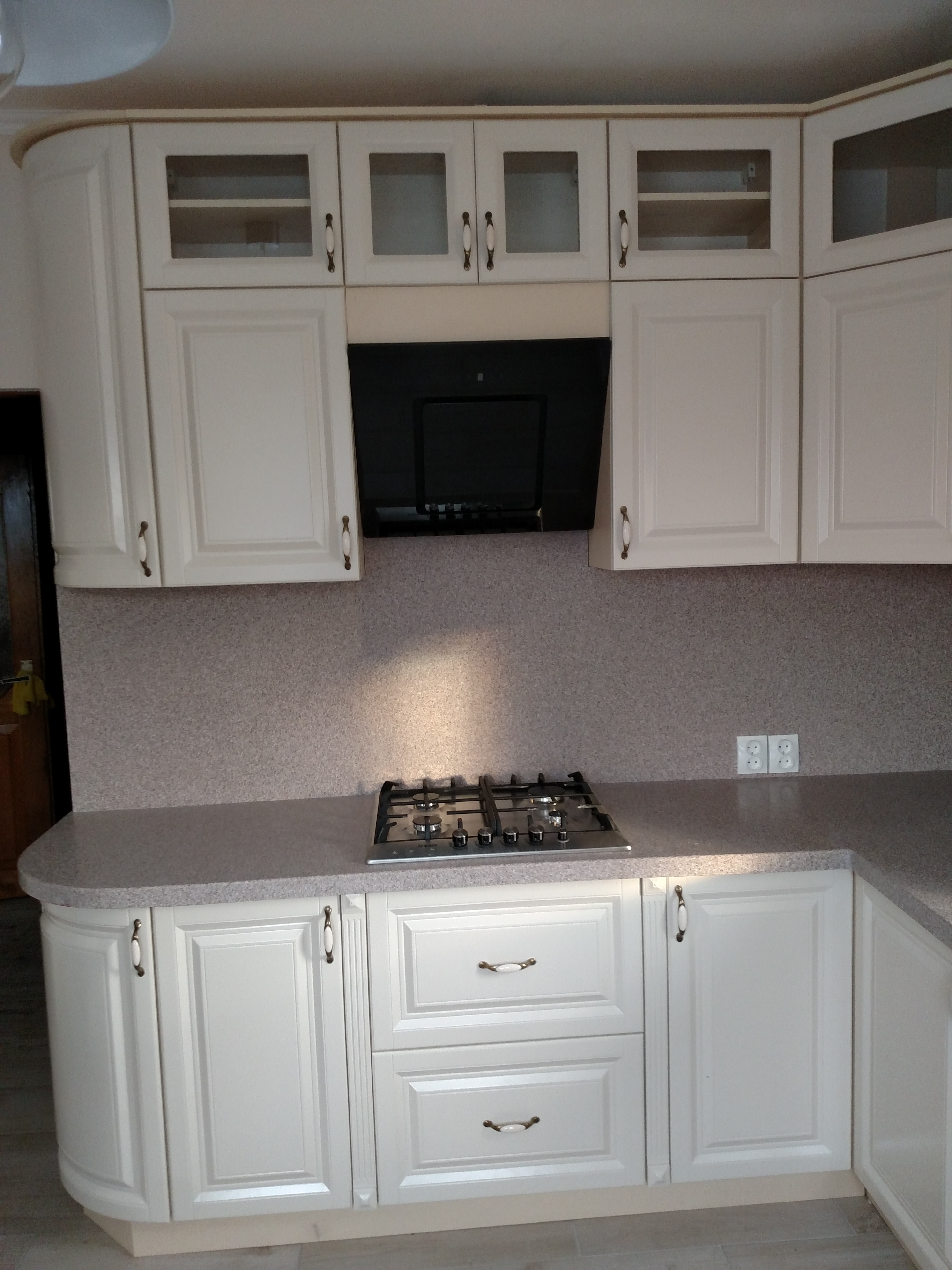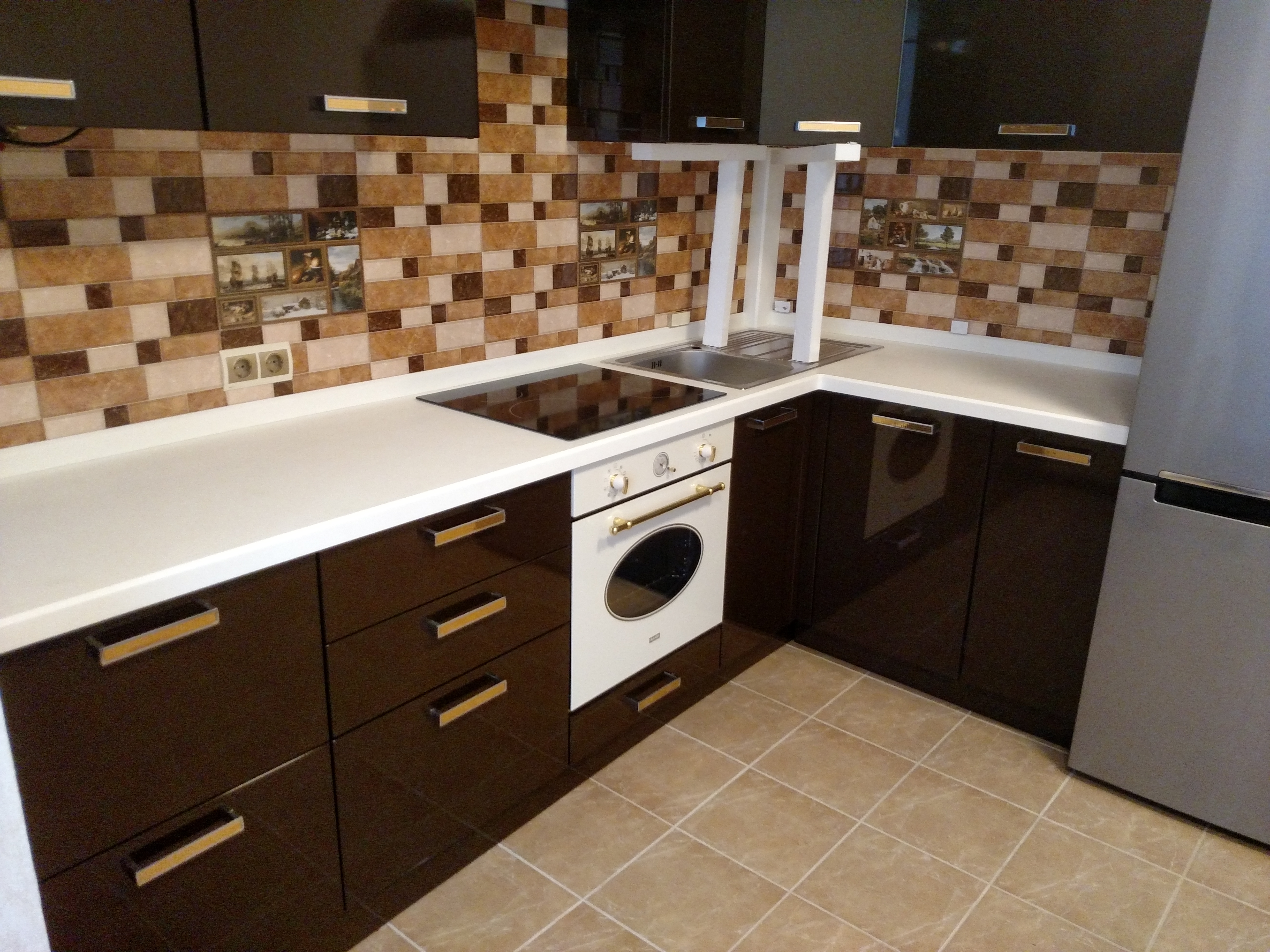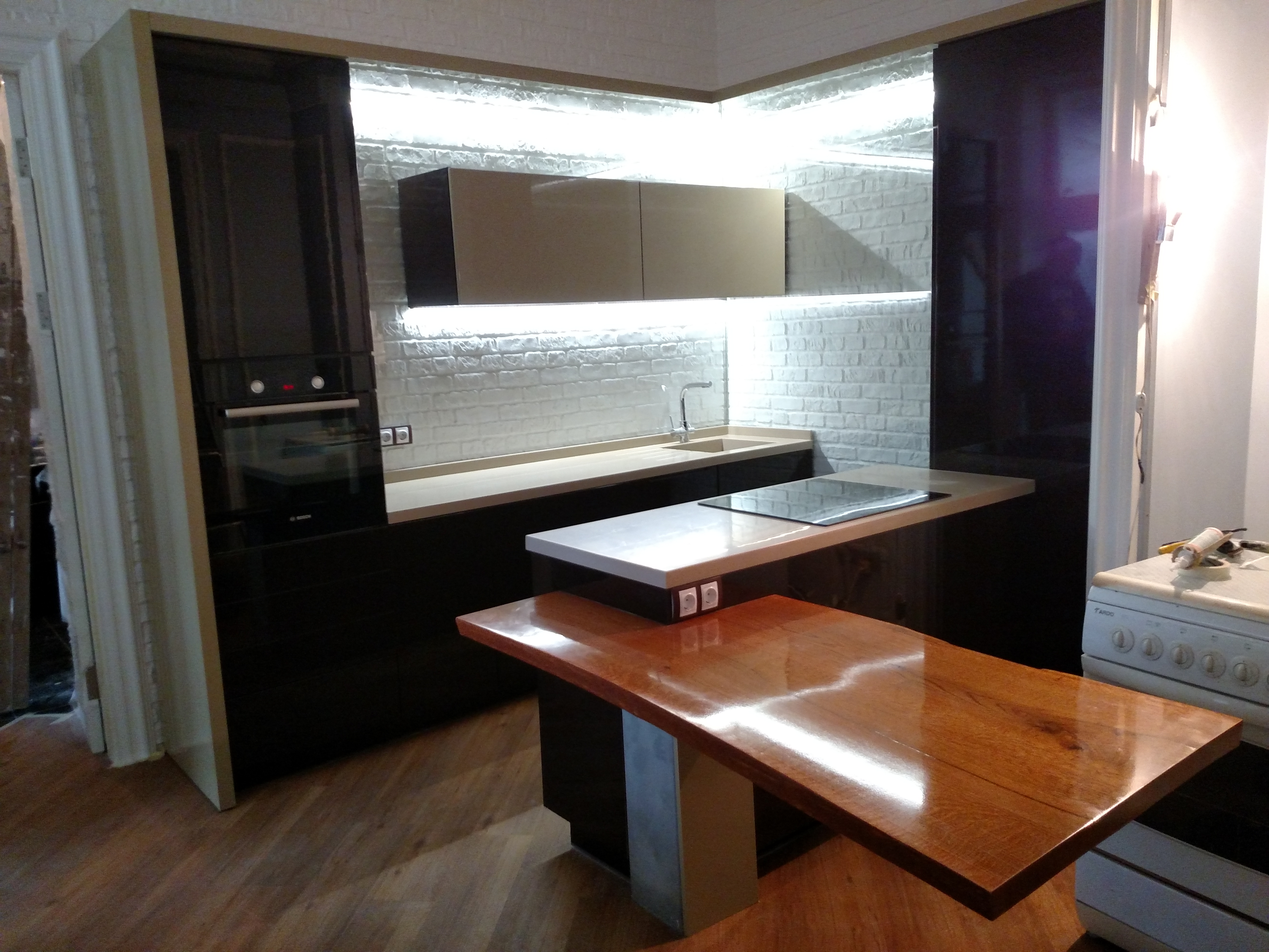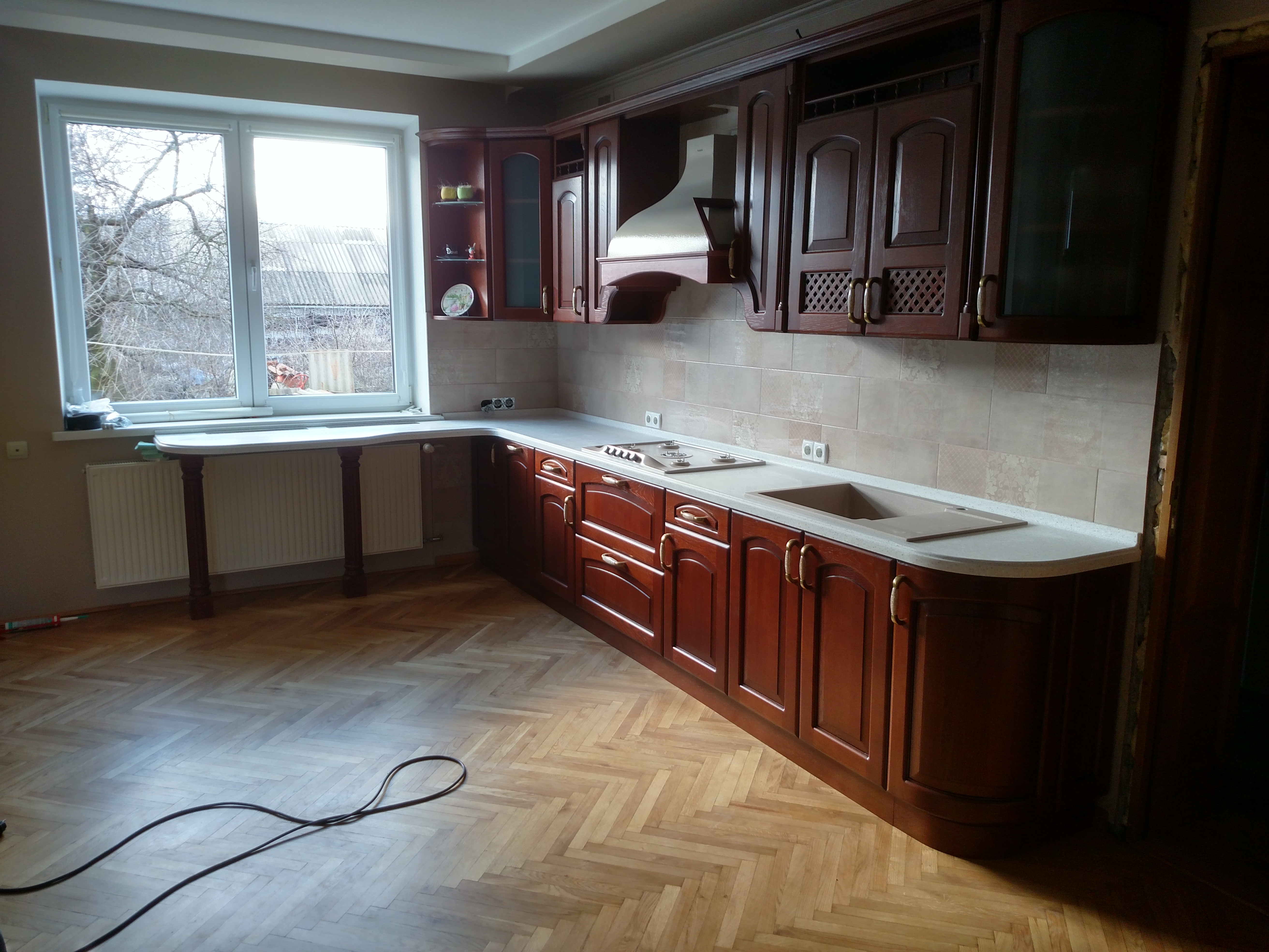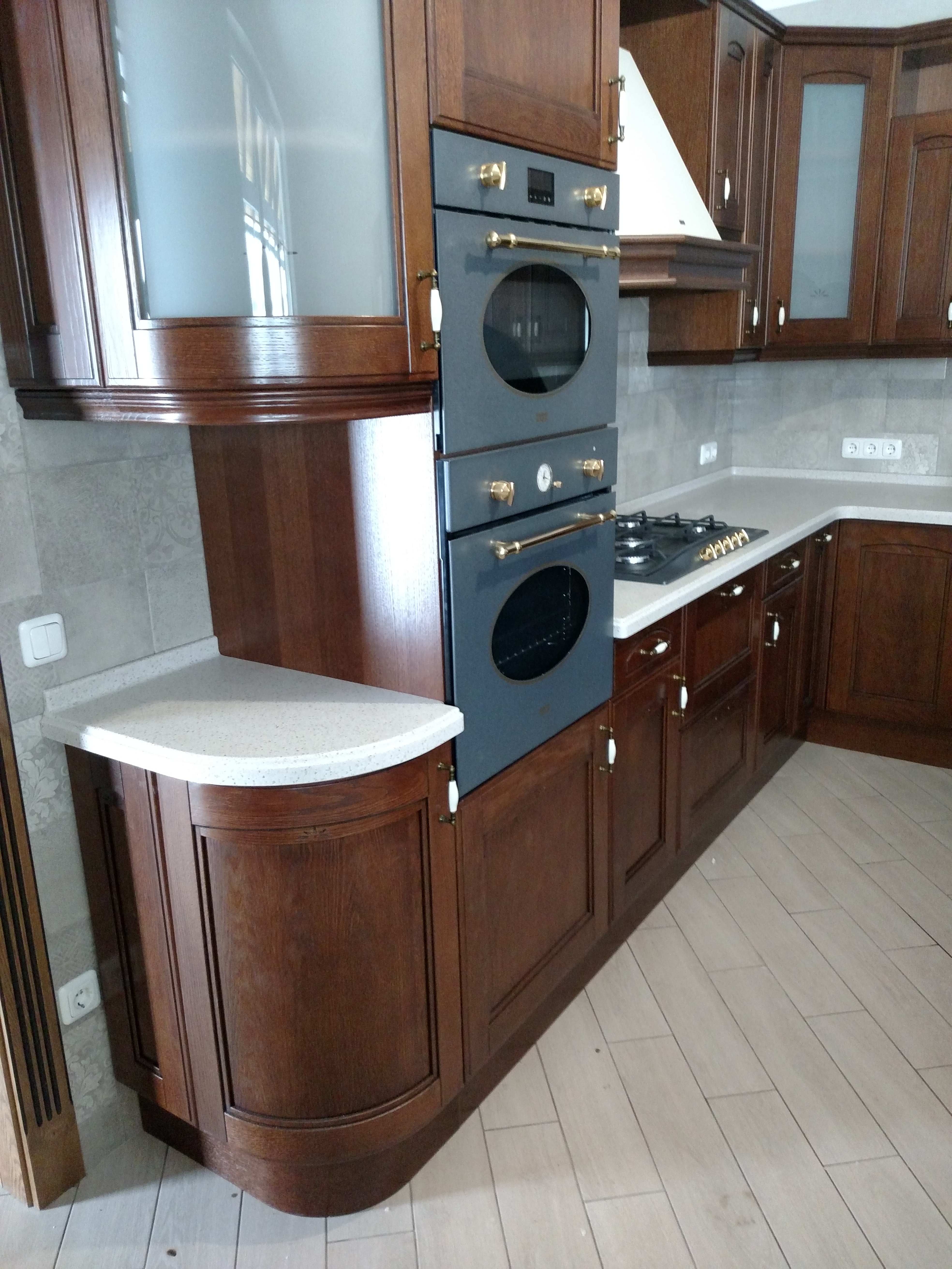 Приклад на фото. Розмір стільниці зі штучного каменю: 1800x2500 мм. Глибина обох сторін: 600 мм. У вартість стільниці входить: внутрішній, зовнішній радіус і мийка. Ціна даної стільниці зі штучного каменю 1450$.