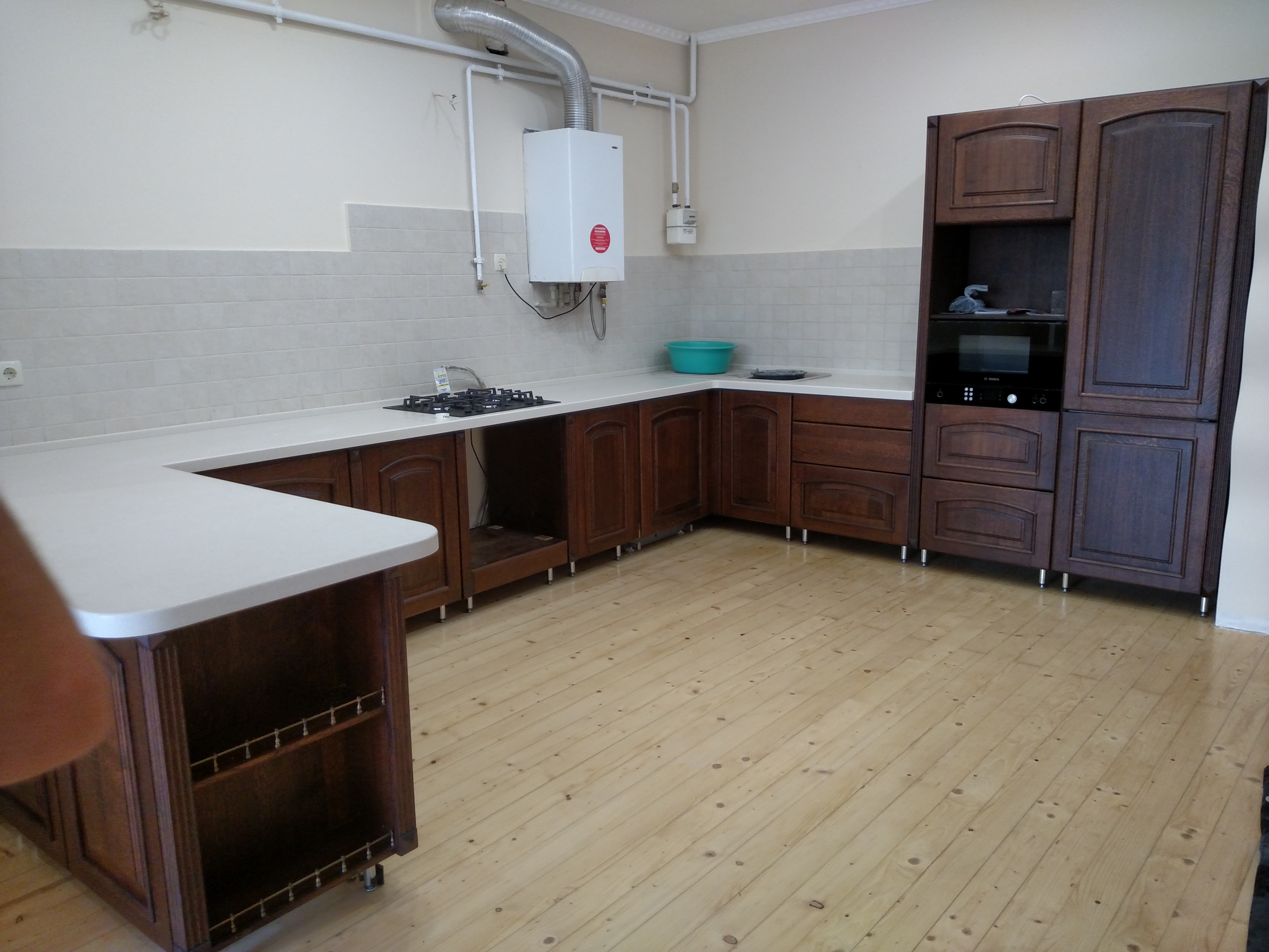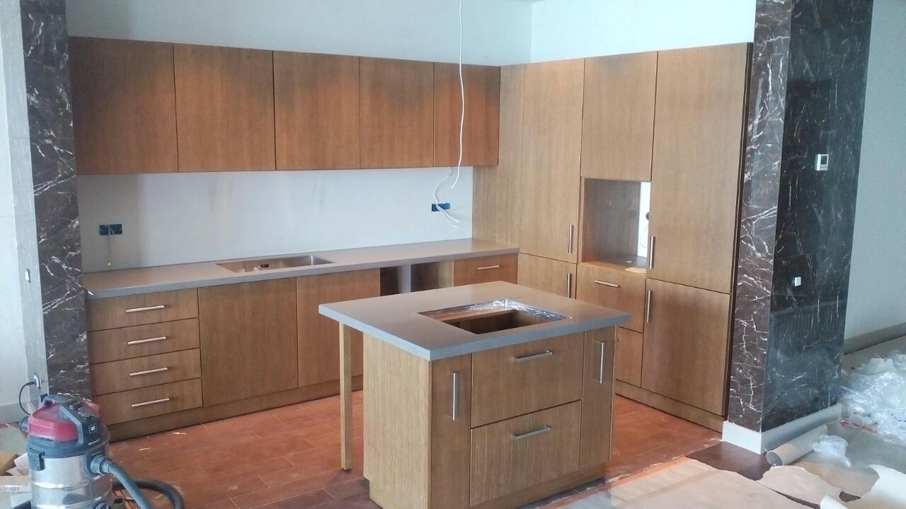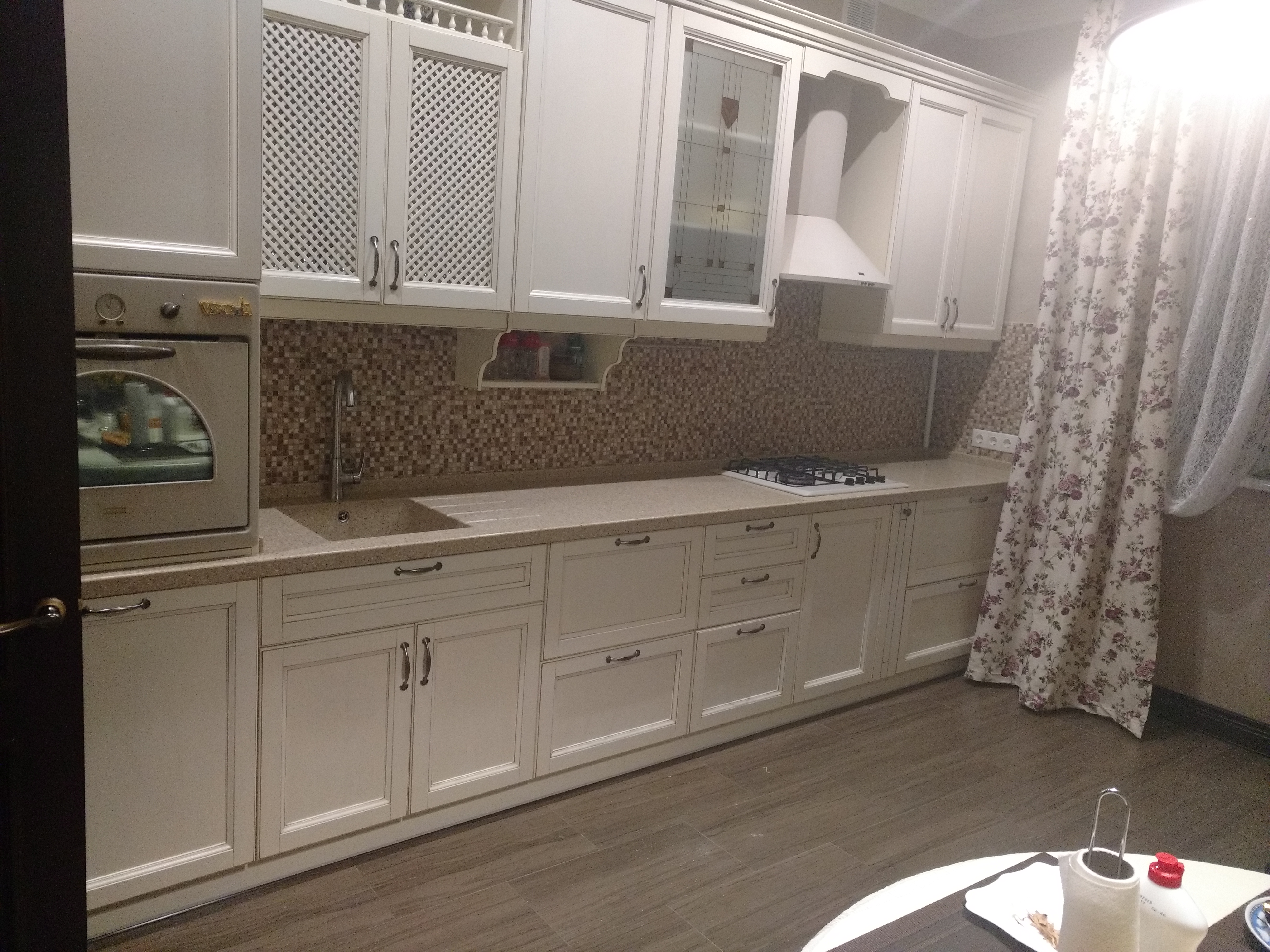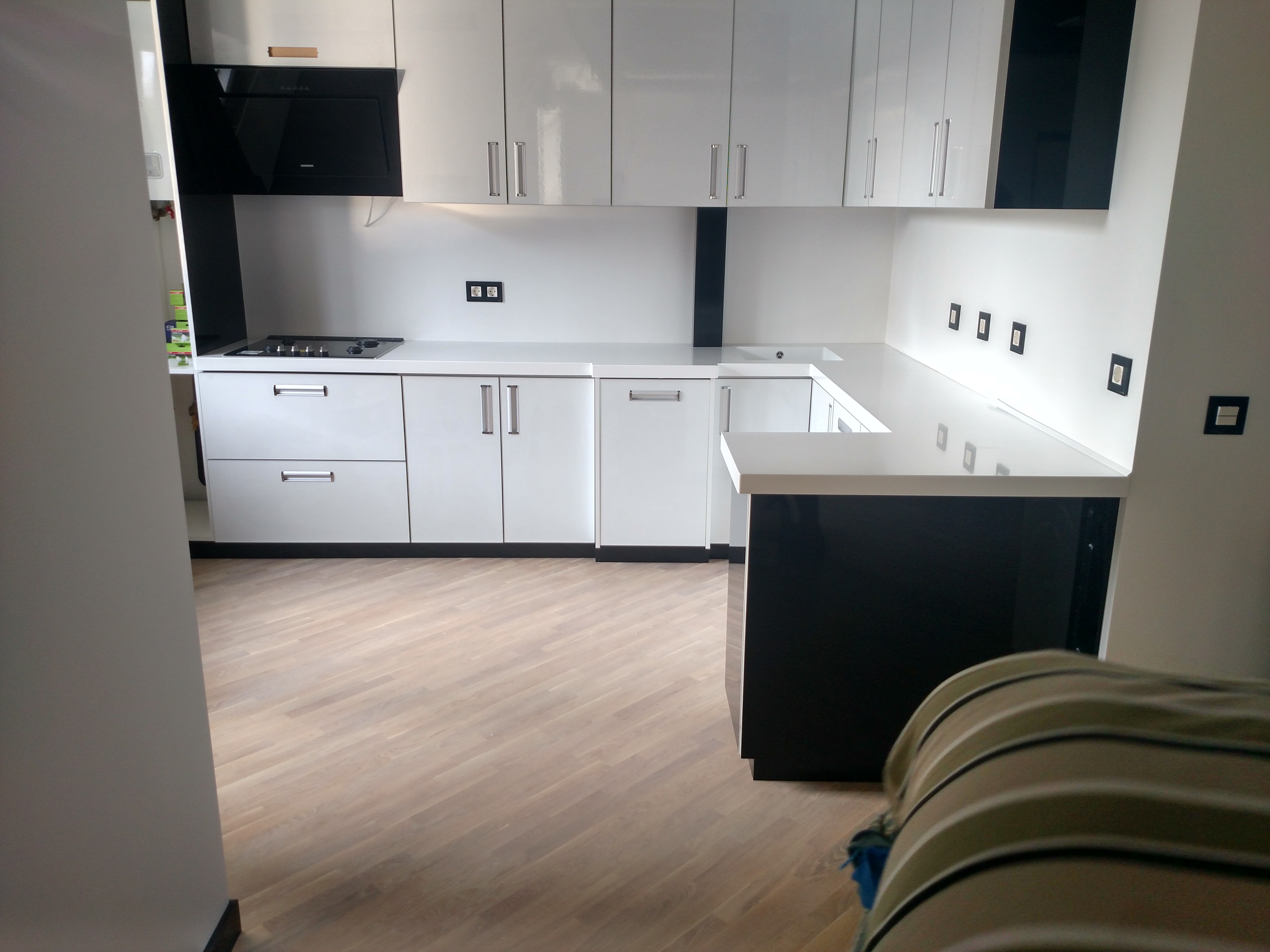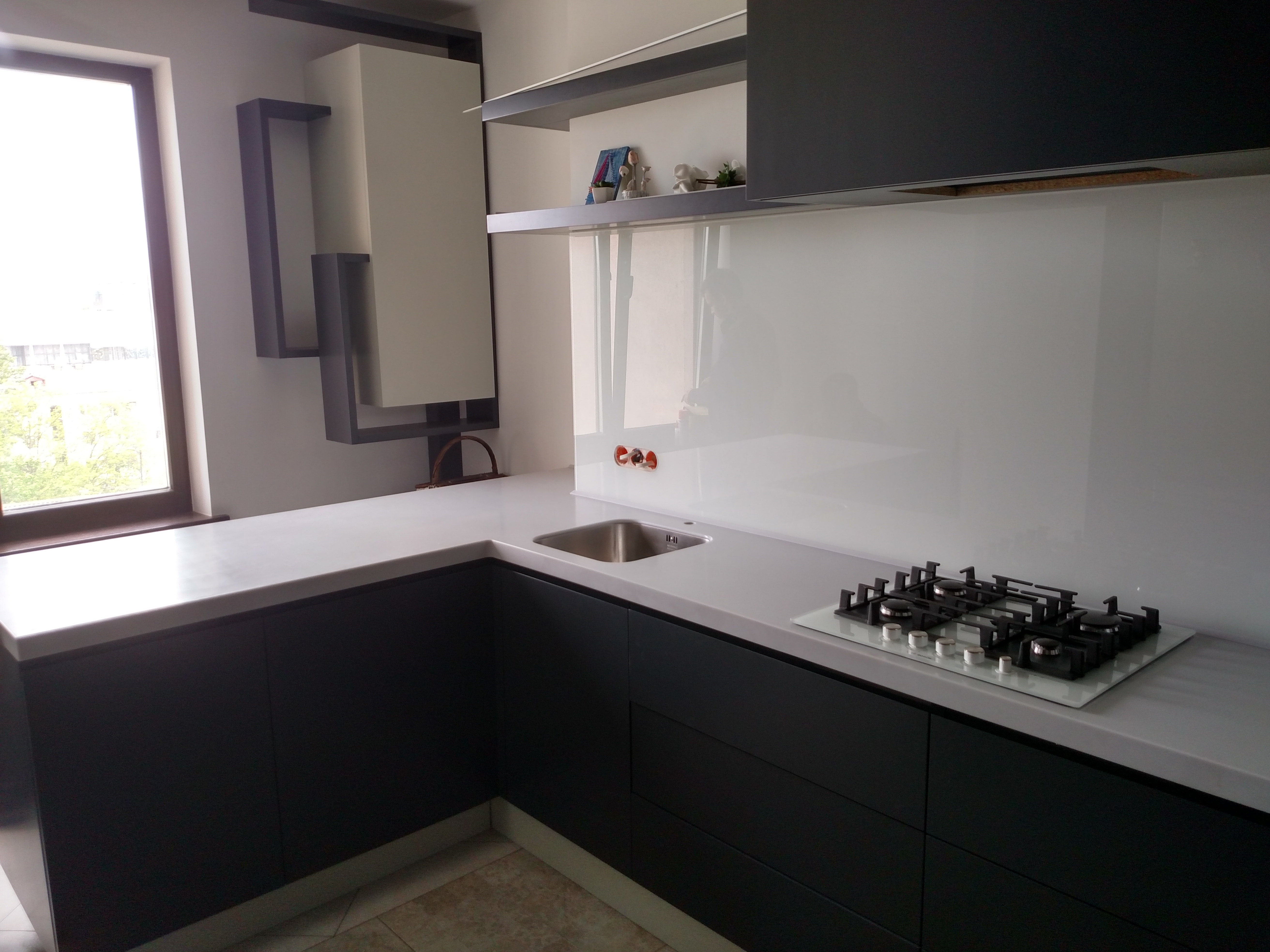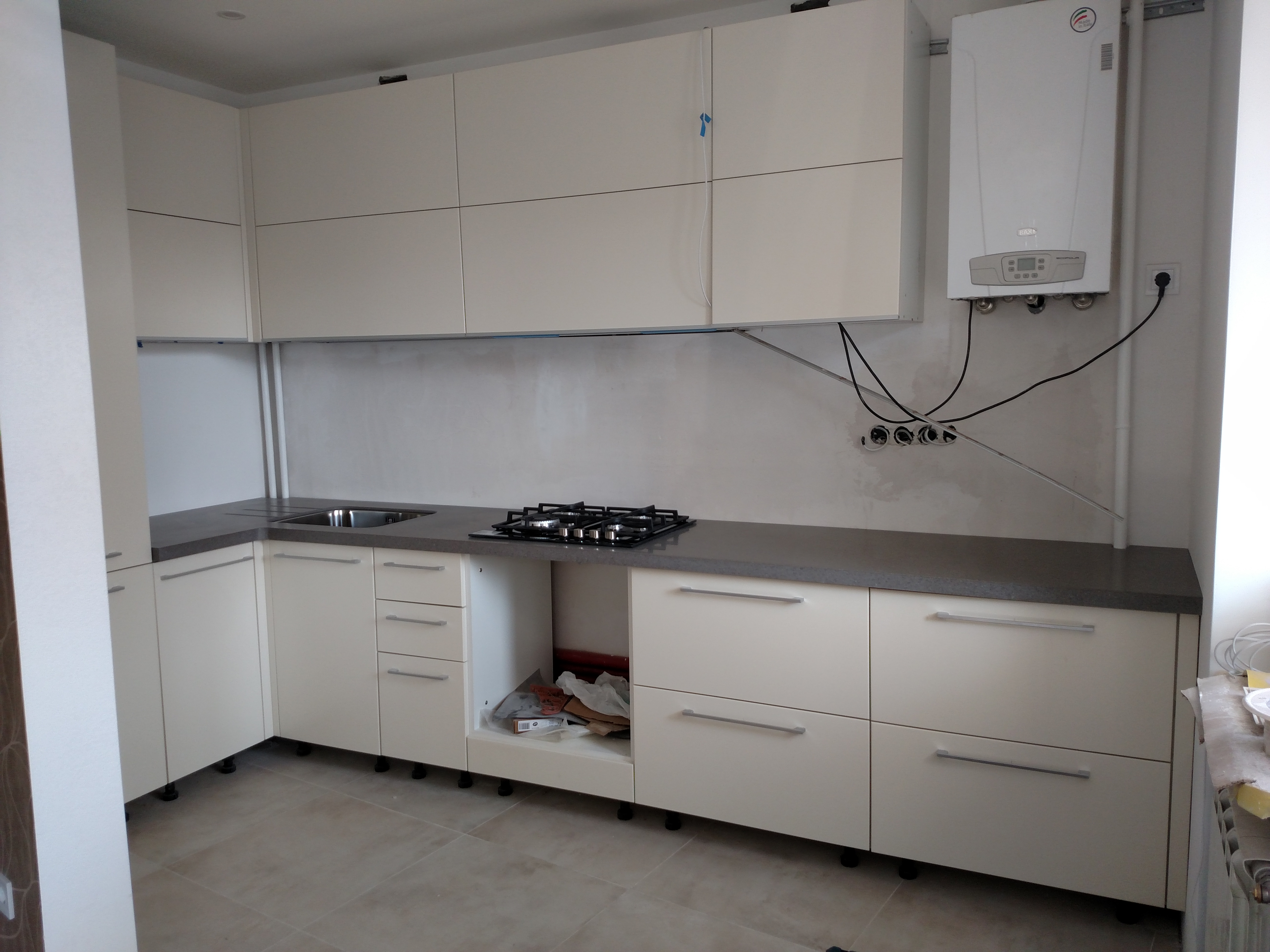 Приклад на фото. Розмір стільниці зі штучного каменю: 1800x2500 мм. Глибина обох сторін: 600 мм. У вартість стільниці входить: внутрішній, зовнішній радіус і мийка. Ціна даної стільниці зі штучного каменю 1450$.