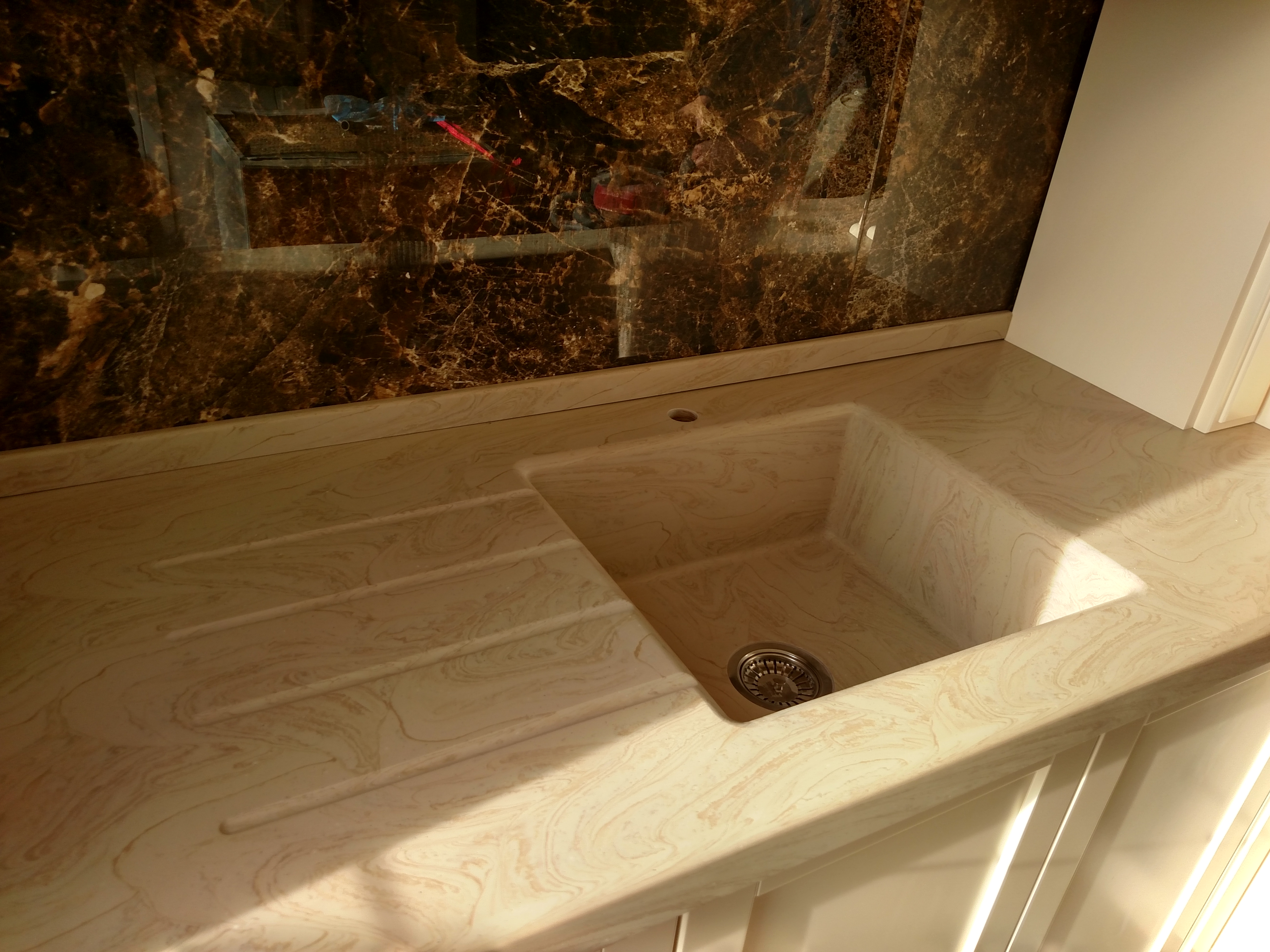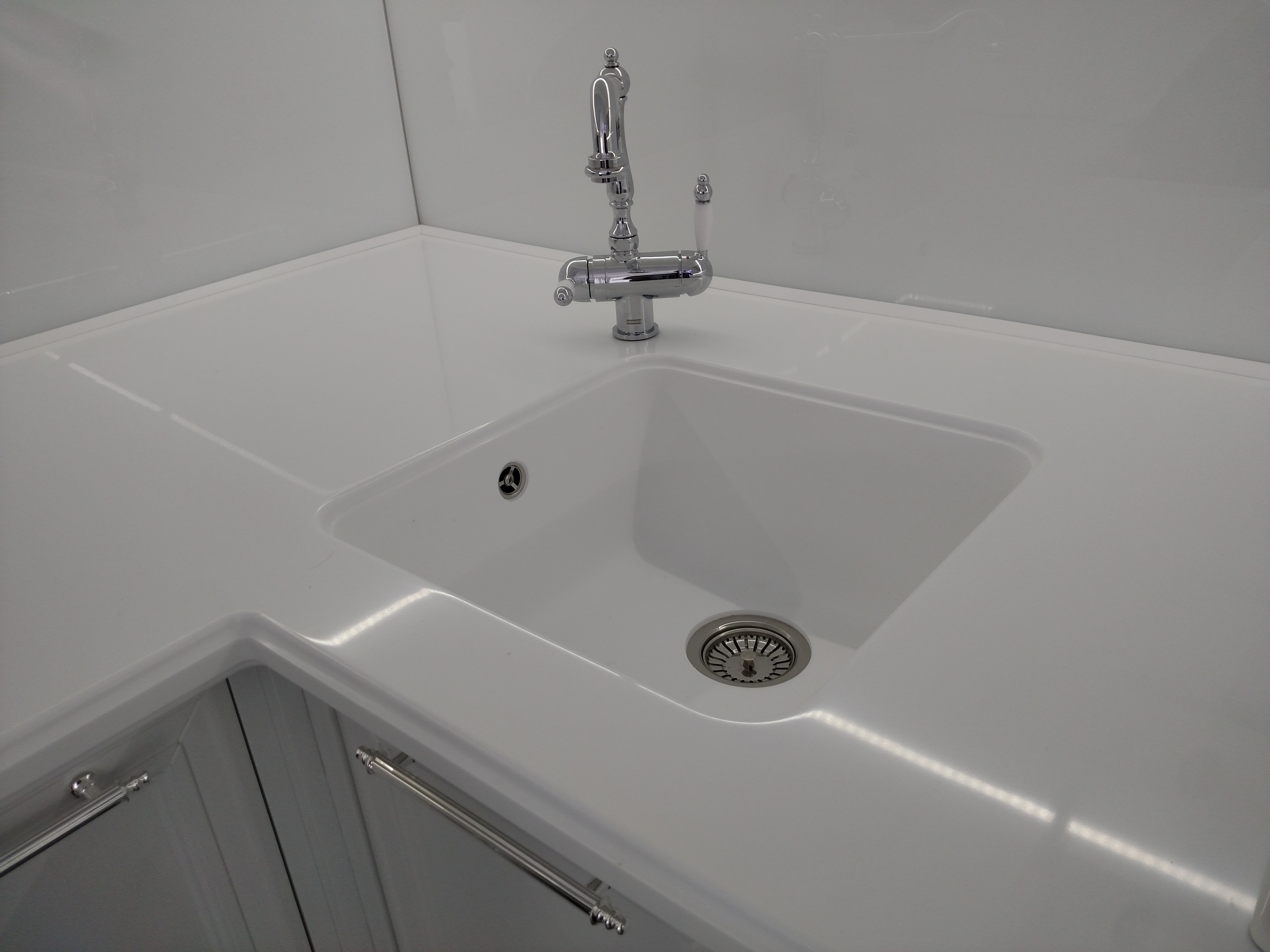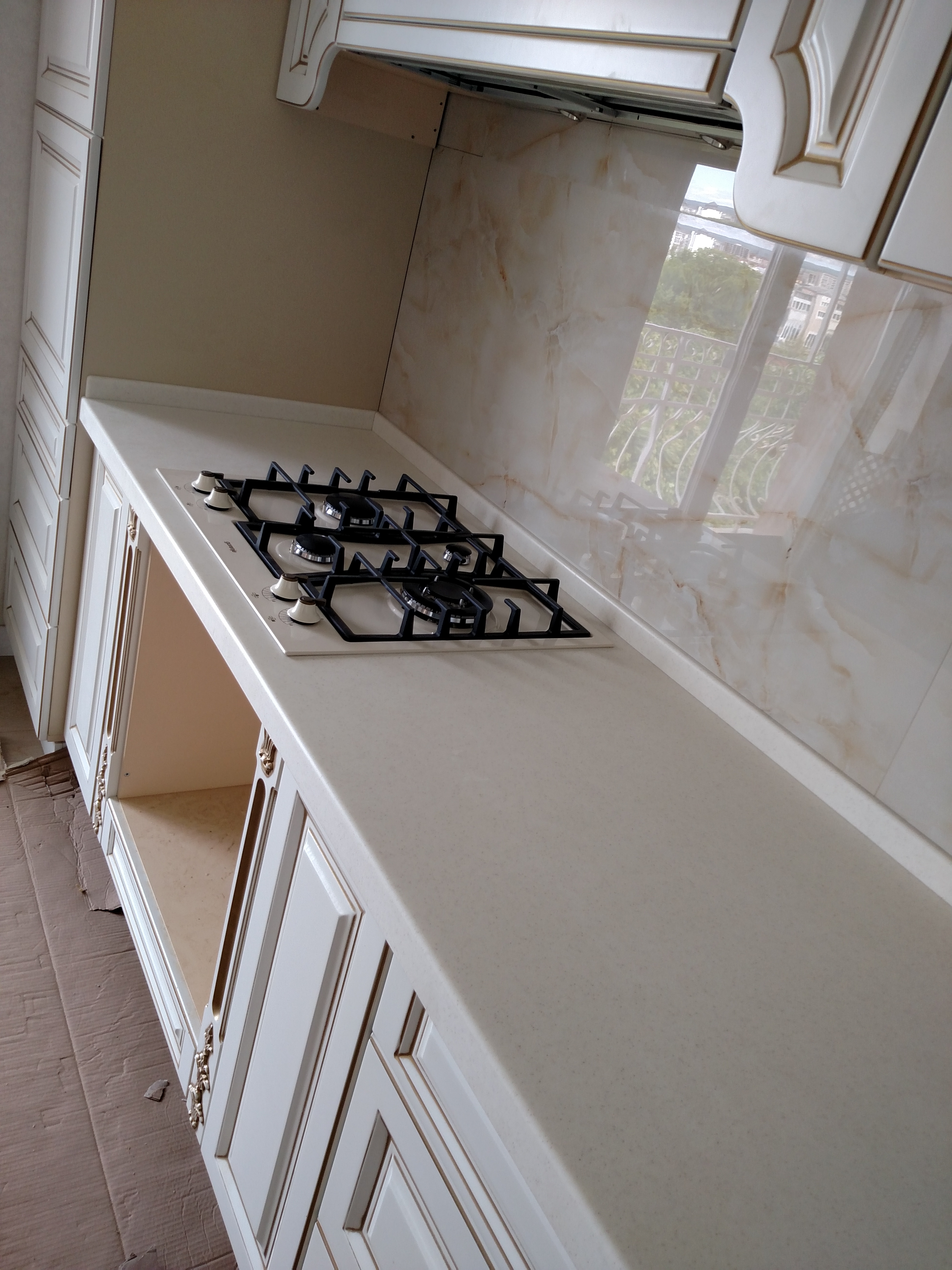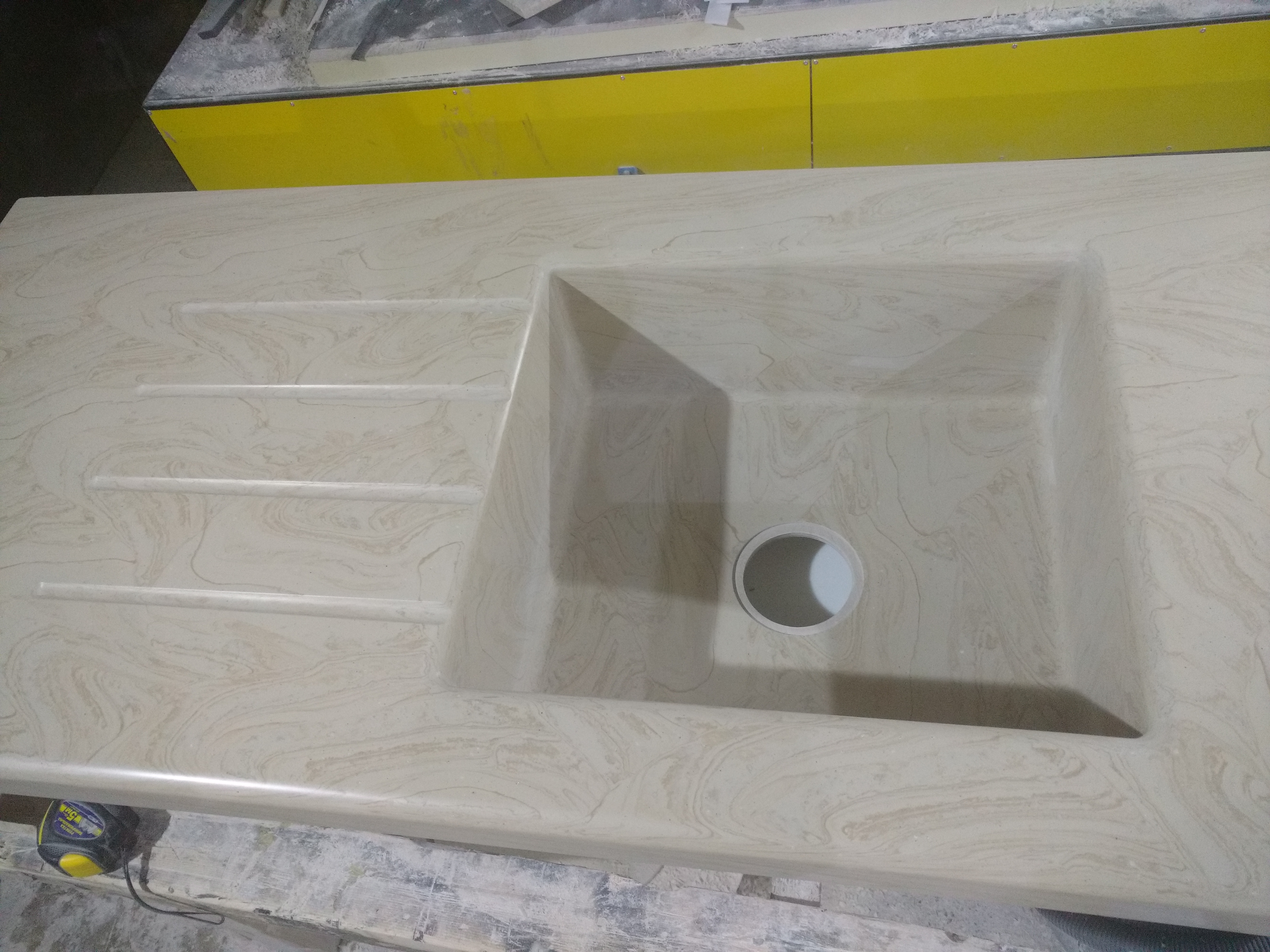 Оскільки штучний камінь монолітний, не має мікропор і тріщин, він ідеально підійде для робочої поверхні на кухні. Він не вбирає бруд, де можуть накопичуватись мікроби або цвіль, не піддається впливу температур, хімічних речовин. Будь-які забруднення з каменю легко видалити звичайною ганчірочкою і миючим засобом (без абразивних частинок).
