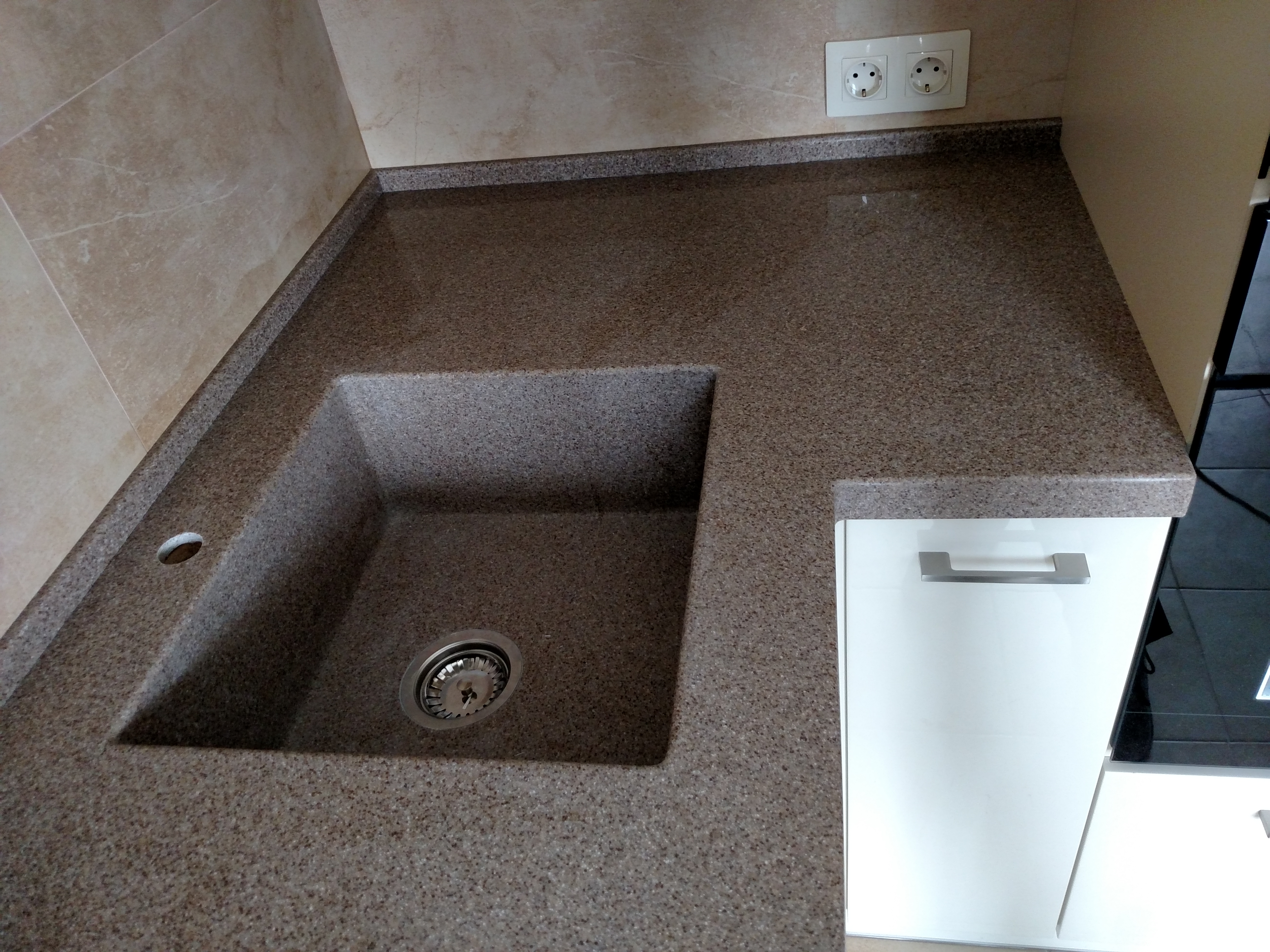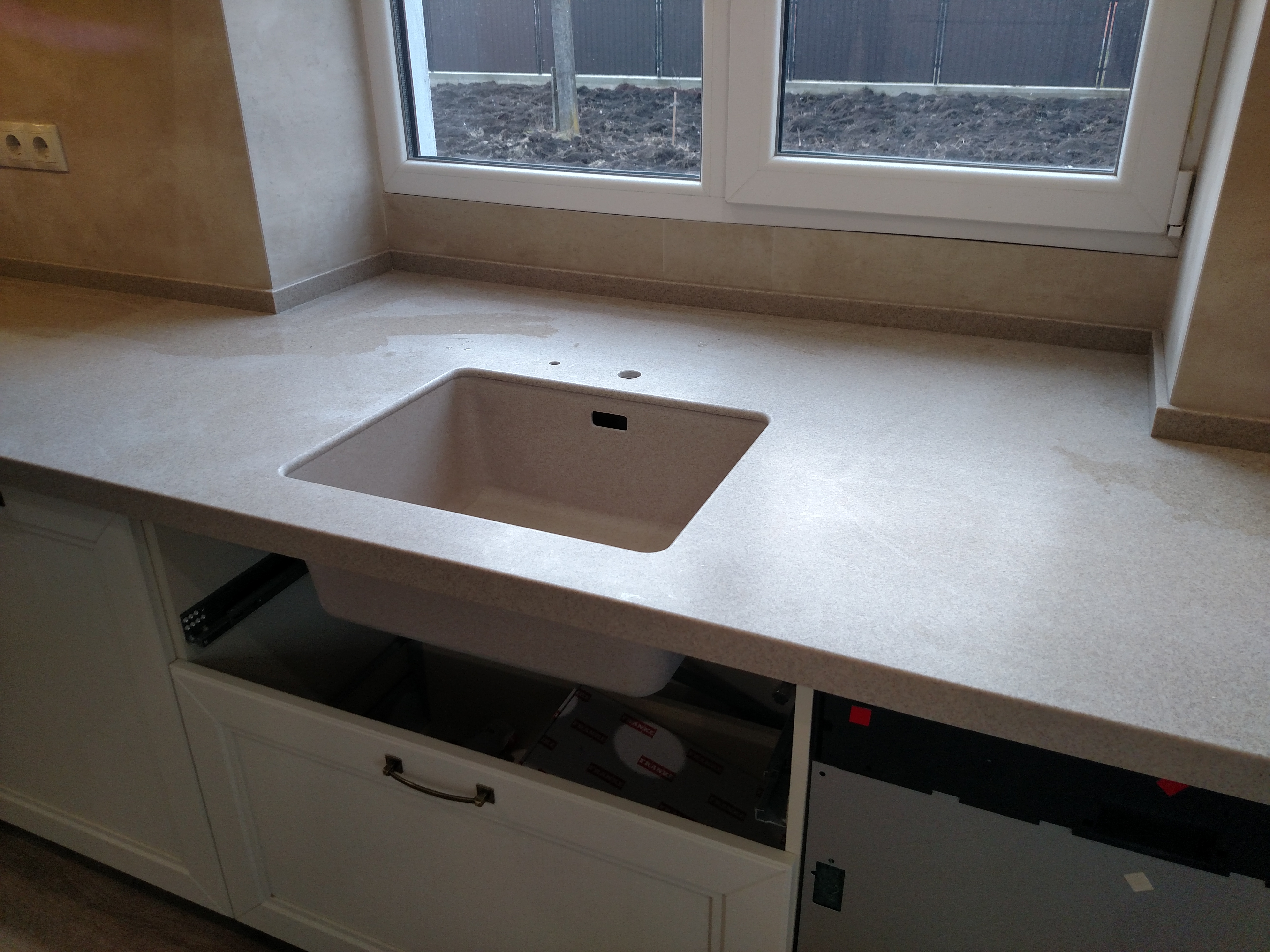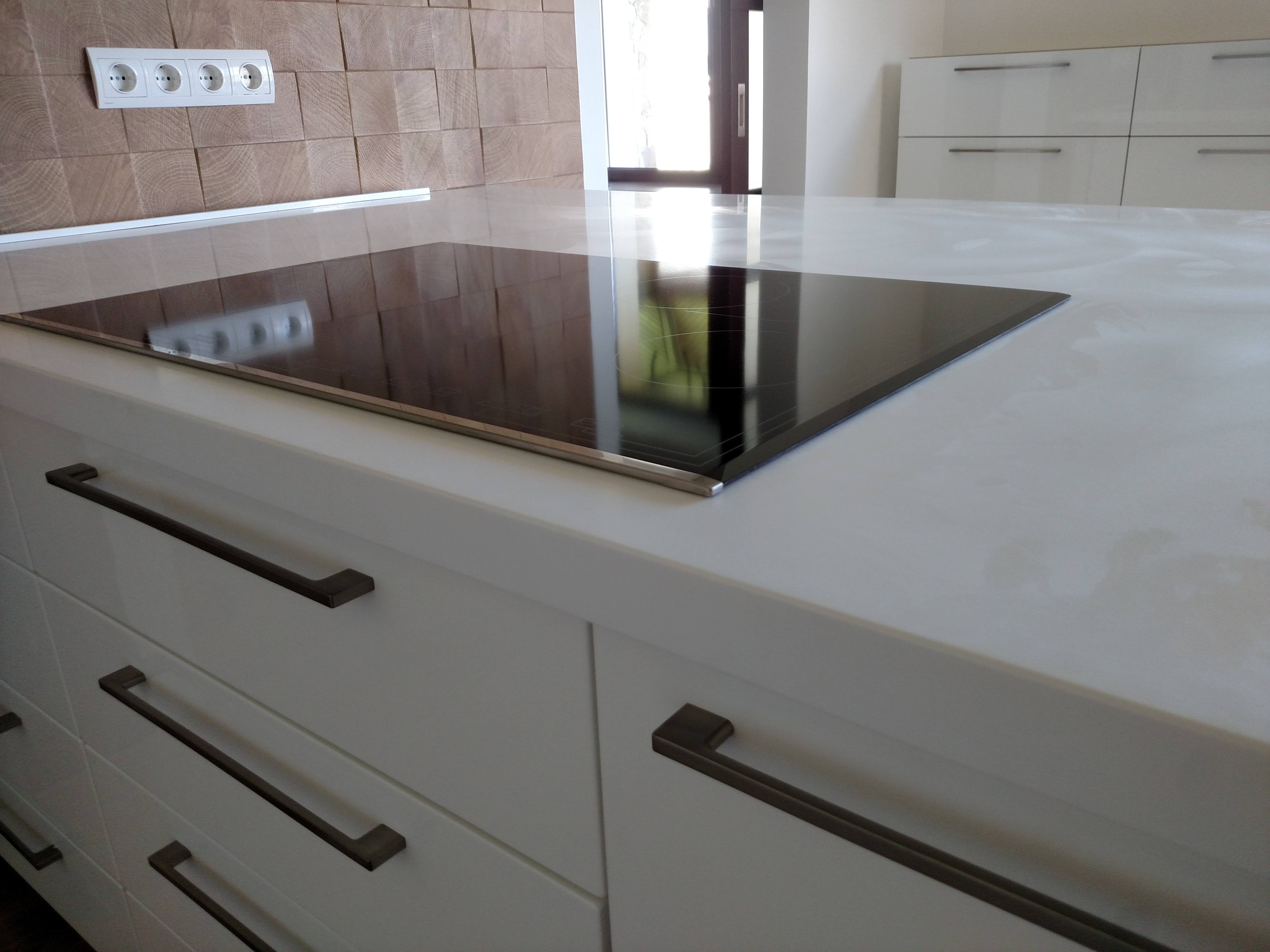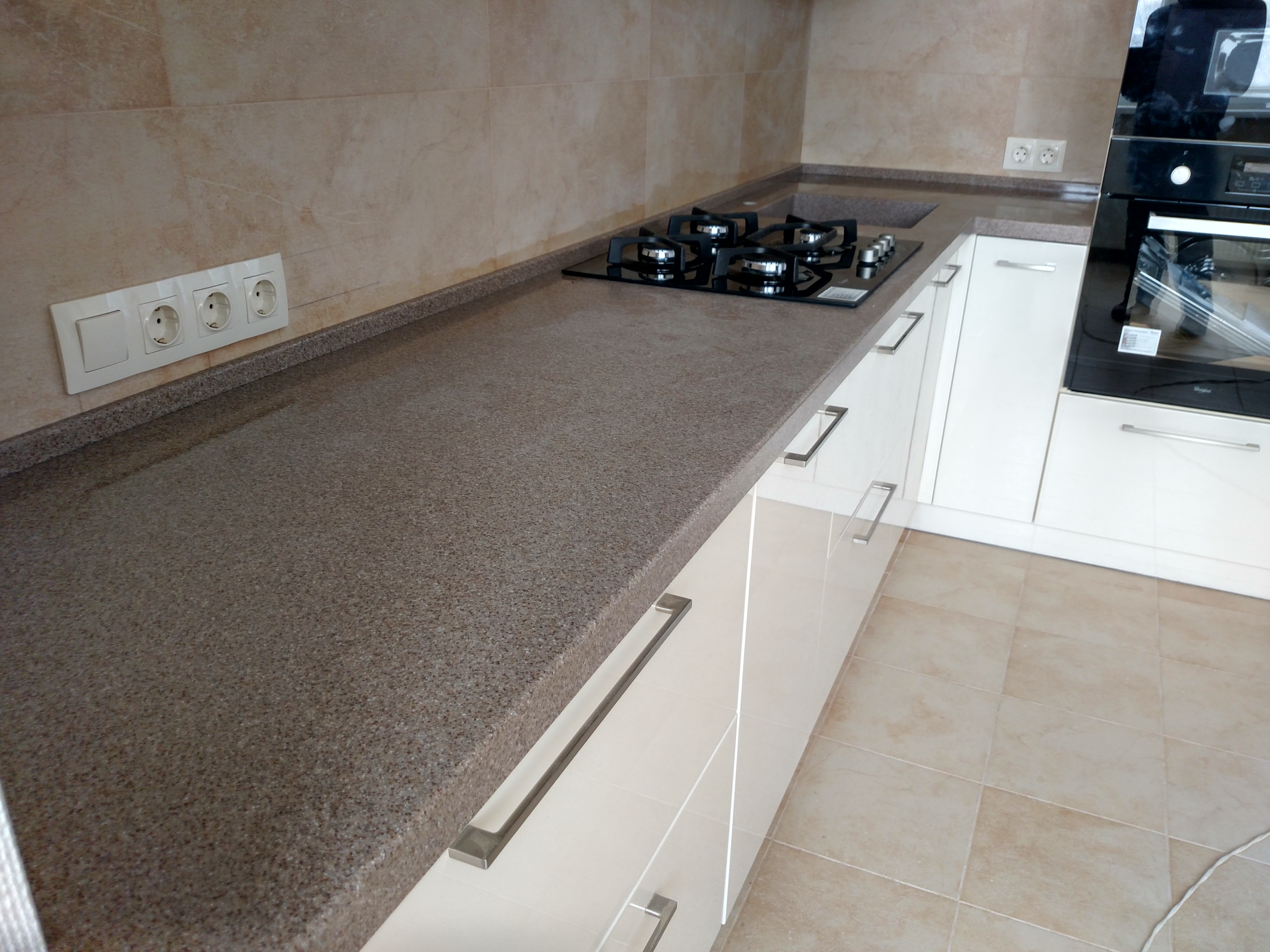 Оскільки штучний камінь монолітний, не має мікропор і тріщин, він ідеально підійде для робочої поверхні на кухні. Він не вбирає бруд, де можуть накопичуватись мікроби або цвіль, не піддається впливу температур, хімічних речовин. Будь-які забруднення з каменю легко видалити звичайною ганчірочкою і миючим засобом (без абразивних частинок).